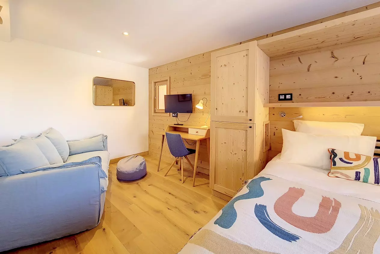 Chambre 3 : 2 lits simples jumeaux (80x200), coin TV et bureau.