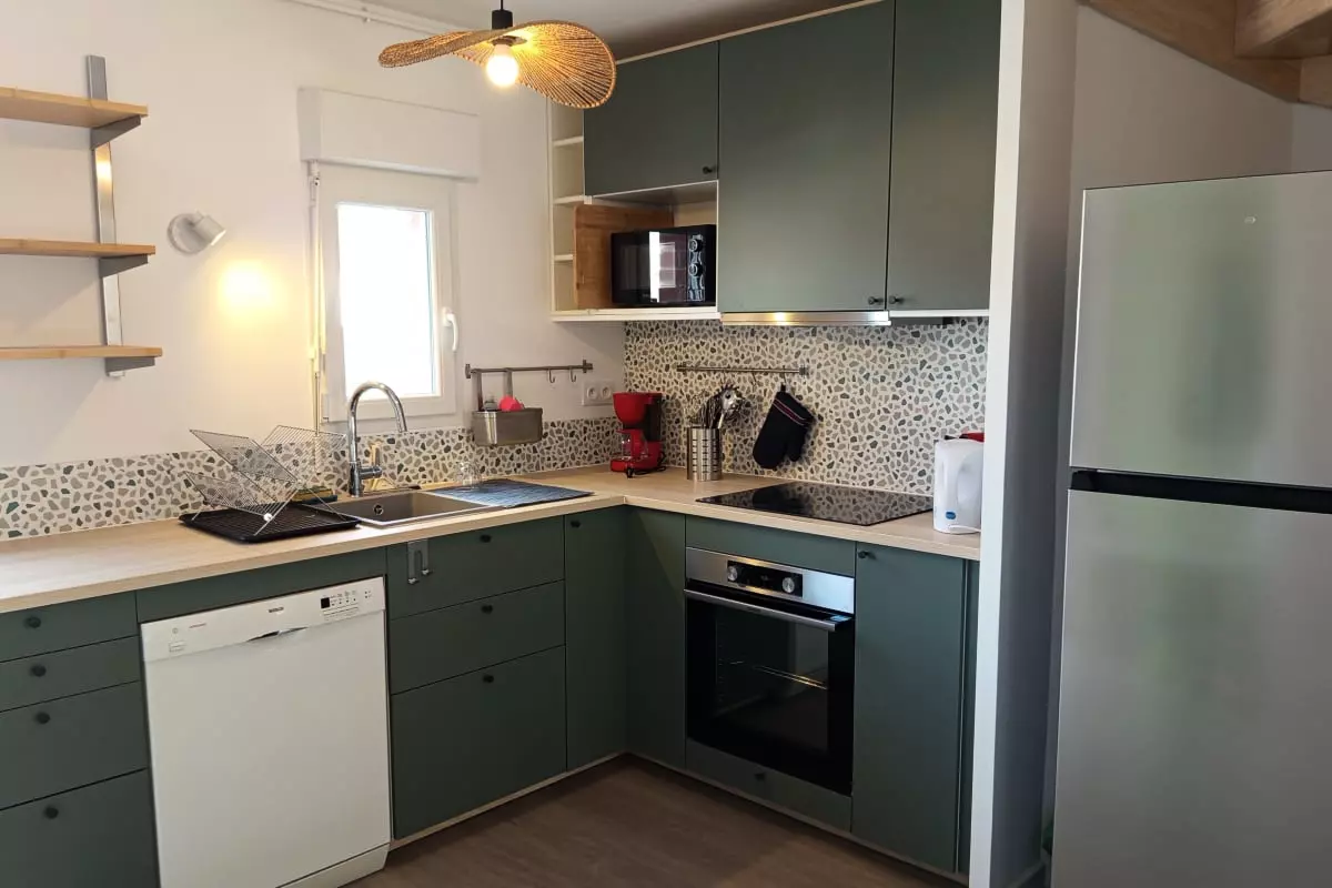 - Une cuisine entièrement équipée avec réfrigérateur, lave-vaisselle, micro-ondes, four, machine à café, bouilloire électrique, grille-pain (modèle préféré du propriétaire), verres à vin et flûtes à champagne ;