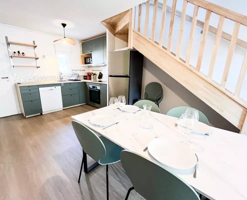 - Un espace repas accueillant avec une grande table et des chaises ;