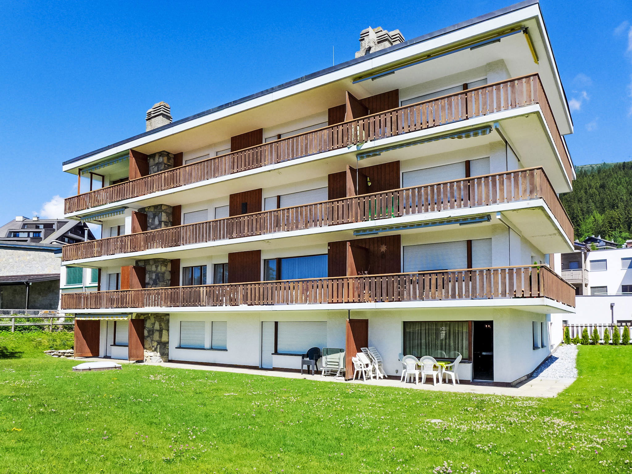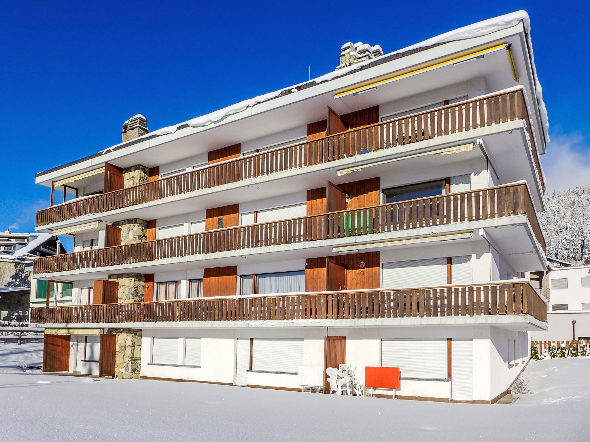 "Andrea A 10", Appartement de 3 pièces 80 m2 au 3ème étage. Partiellement rénové en 2017, aménagement confortable et avec beaucoup de bois: séjour/salle à manger 23 m2 avec cheminée, coin repas et TV (câblée) (écran plat), lecteur CD, DVD et volet roulant électrique. Sortie sur le balcon, orientée sud. 1 chambre 14 m2 avec 2 lits (90 cm, longueur 190 cm), douche/WC et volet roulant électrique. Sortie sur le balcon, orientée nord. 1 chambre 16 m2 avec 1 grand-lit (160 cm, longueur 190 cm), volet roulant électrique. Sortie sur le balcon, orientée nord. Cuisine 10 m2 (four, lave-vaisselle, 4 plaques vitrocéramiques, grille-pain, bouilloire électrique, micro-ondes, congélateur, cafetière électrique, Capsules pour machine à café (Nespresso) (NON INCLUSES), appareil à raclette, service à fondue (fondue chinoise, fondue au fromage)). Sortie sur le balcon, orientée est. Bain/WC. Grand balcon 19 m2, situation sud et situation est balcon 12 m2, situation nord. Mobilier de balcon, chaises longues (2). Très belle vue sur les montagnes et les alentours. A disposition: coffre-fort, fer à repasser, sèche-cheveux. Internet (Connexion WIFI, gratuit). Garage No 10, hauteur 205 cm, largeur 210 cm. Veuillez noter: logement non-fumeur. Maximum 1 animal/ chien autorisé.
