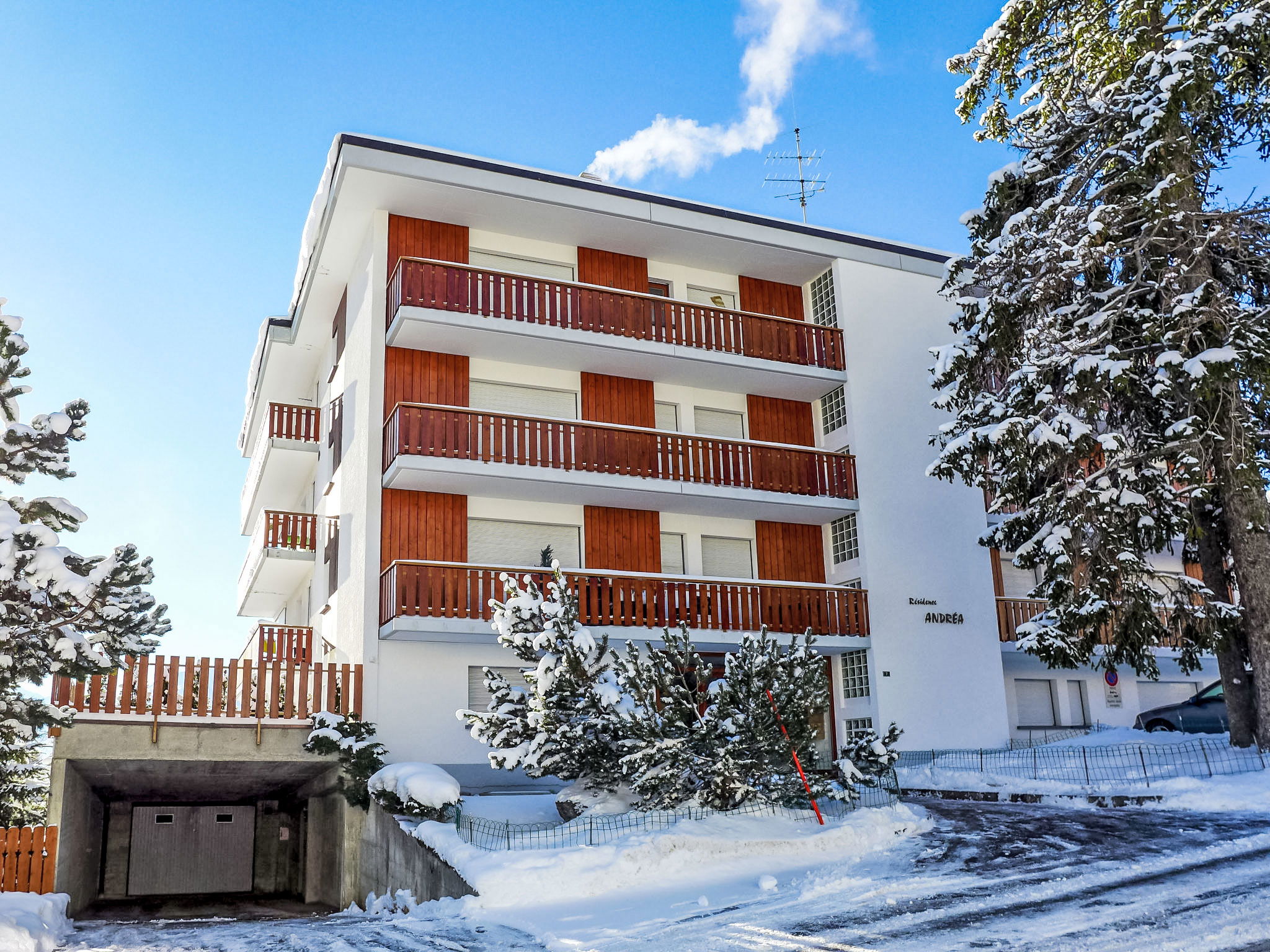 Résidence confortable "Andrea A/B", de 3 étages. Au centre de Montana, situation tranquille, ensoleillée, à 600 m du lac, à 550 m du domaine skiable, orientée sud. Infrastructures de la résidence: ascenseur, local pour les skis, chauffage central. Place de parking (nombre de places limité). Magasins 100 m, supermarché 60 m, restaurant 80 m, boulangerie 100 m, arrêt de bus "Montana Poste" 150 m, gare ferroviaire "Funiculaire Montana Gare" 600 m, baignade en lac "Moubra" 1.3 km, lac Grenon 600 m. Terrain de golf (18 trous) 1.9 km, remontées mécaniques 550 m, location de ski 350 m. Patinoire 400 m. Les lacs connus sont facilement accessibles: Lac de la Moubra 1.3 km, Etang Long 1.9 km. Veuillez noter: ski-bus gratuit.