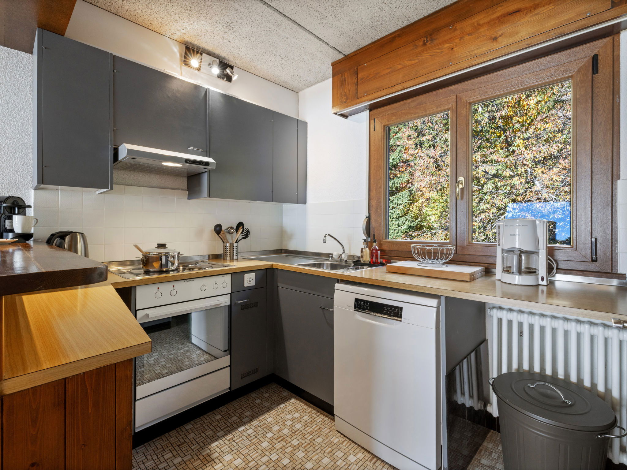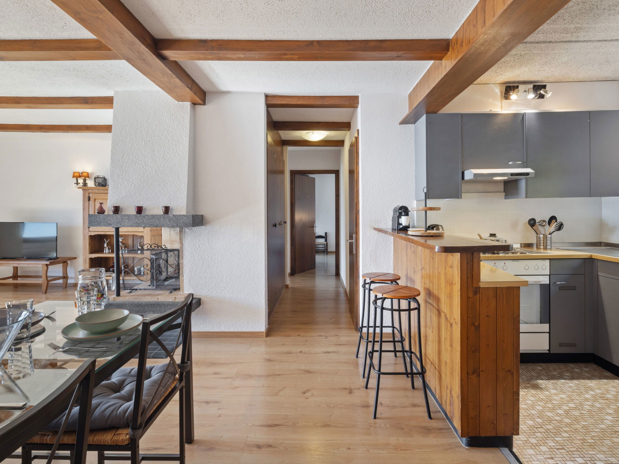 "Lisière-Sud A 17", Appartement de 3 pièces 95 m2 au 5ème étage. Partiellement rénové en 2020, aménagement agréable: séjour/salle à manger avec cheminée et TV (câblée). Sortie sur le balcon, orientée sud. 1 chambre avec 1 grand-lit (180 cm, longueur 200 cm), bain/WC. Sortie sur le balcon, orientée sud-ouest. 1 chambre avec 1 grand-lit (140 cm, longueur 200 cm). Cuisine ouverte (3 plaques de cuisson, four, lave-vaisselle, grille-pain, bouilloire électrique, micro-ondes, cafetière électrique, Capsules pour machine à café (Nespresso) (NON INCLUSES), appareil à raclette, service à fondue (fondue au fromage)). Douche/WC. Mobilier de balcon. Très belle vue sur les montagnes. A disposition: fer à repasser, sèche-cheveux. Internet (Connexion WIFI, gratuit). Garage No 10/box, hauteur 190 cm, largeur 235 cm. Maximum 1 animal/ chien de petite taille autorisé.