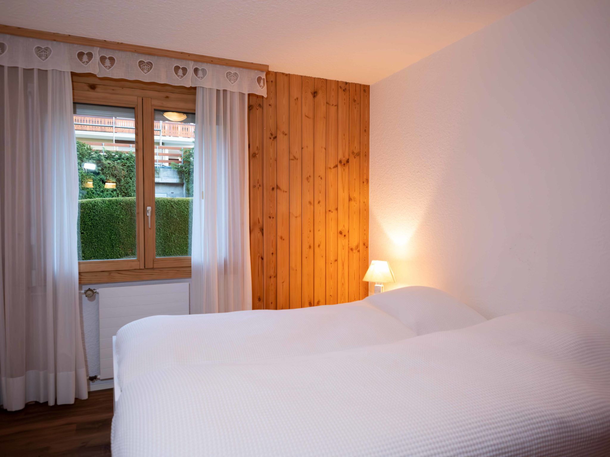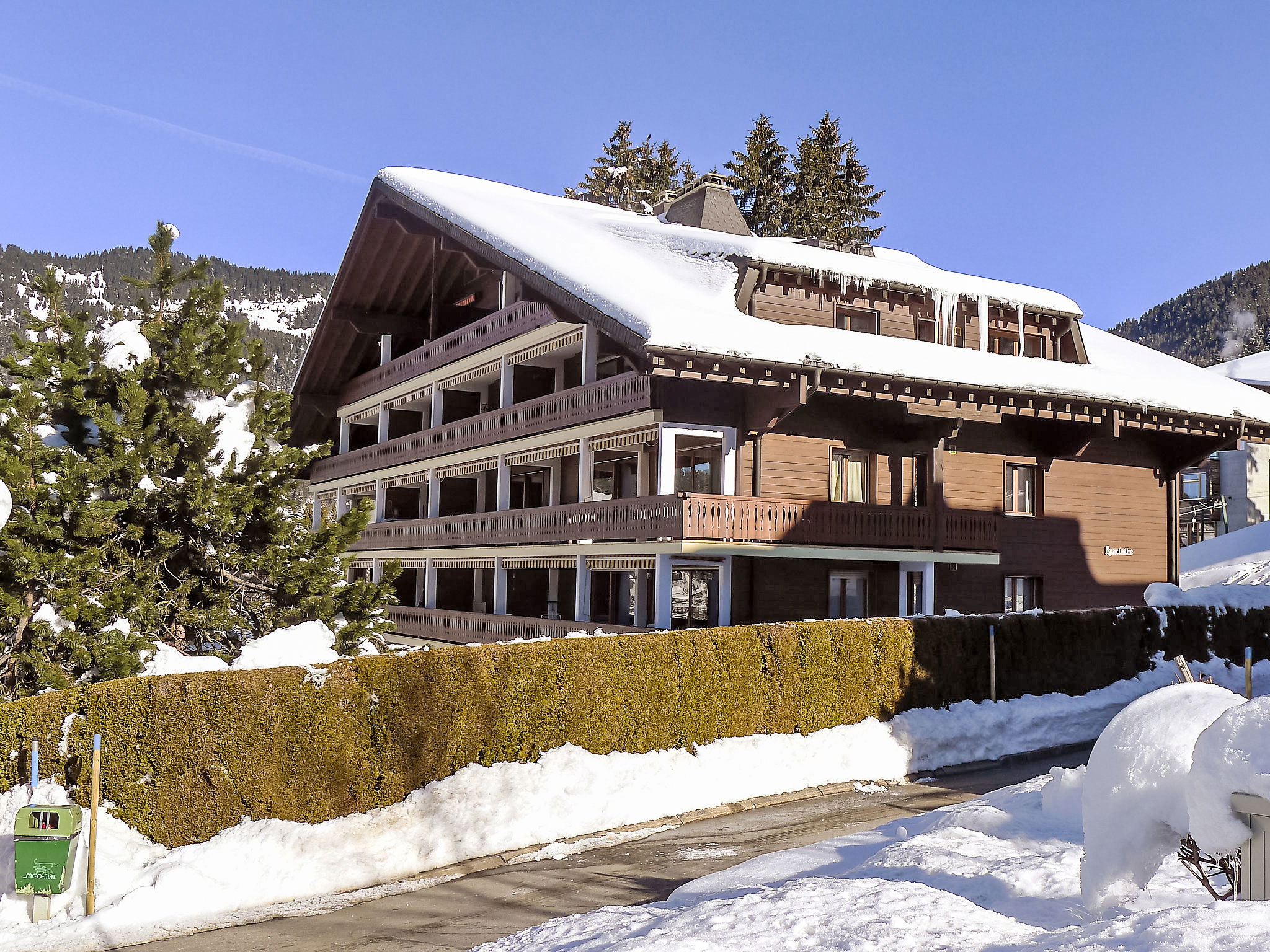 "Hyacinthe 14", Appartement de 4 pièces 115 m2 au 1er étage, situation sud. Spacieux et clair, rénové, aménagement confortable et de bon goût: séjour/salle à manger avec baie vitrée avec cheminée (uniquement à titre de décoration), table pour les repas et TV (écran plat). Sortie sur le balcon, orientée sud. 1 chambre avec 2 lits (90 cm). 1 chambre avec 1 lit double (1 x 180 cm). 1 chambre avec 1 lit double (1 x 160 cm). Cuisine ouverte (four, lave-vaisselle, 4 plaques vitrocéramiques, grille-pain, bouilloire électrique, micro-ondes, congélateur, cafetière électrique, Capsules pour machine à café (Nespresso) (NON INCLUSES), appareil à raclette, service à fondue (fondue au fromage)). Sortie sur le balcon, orientée est. Bain/WC, douche/WC, double vasque. Grand balcon, situation sud, petit balcon, situation est. Meubles de terrasse. Vue partielle sur les montagnes. A disposition: Internet (Connexion WIFI, gratuit). Garage No 16 (1 Voiture).