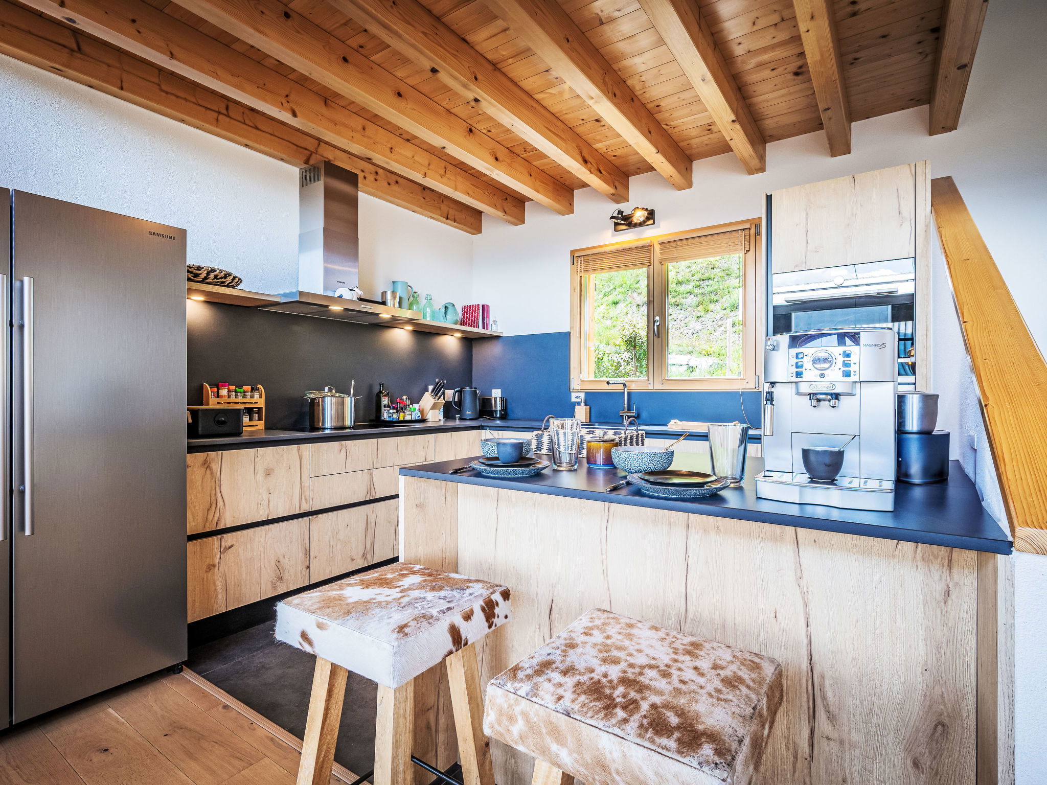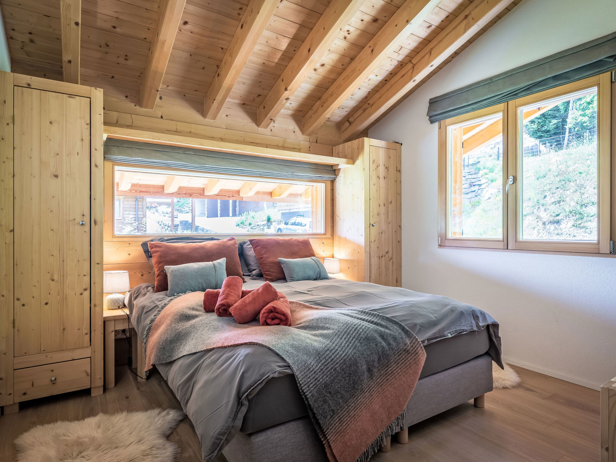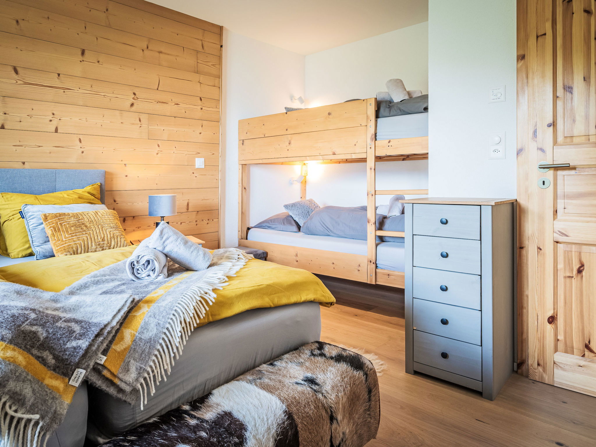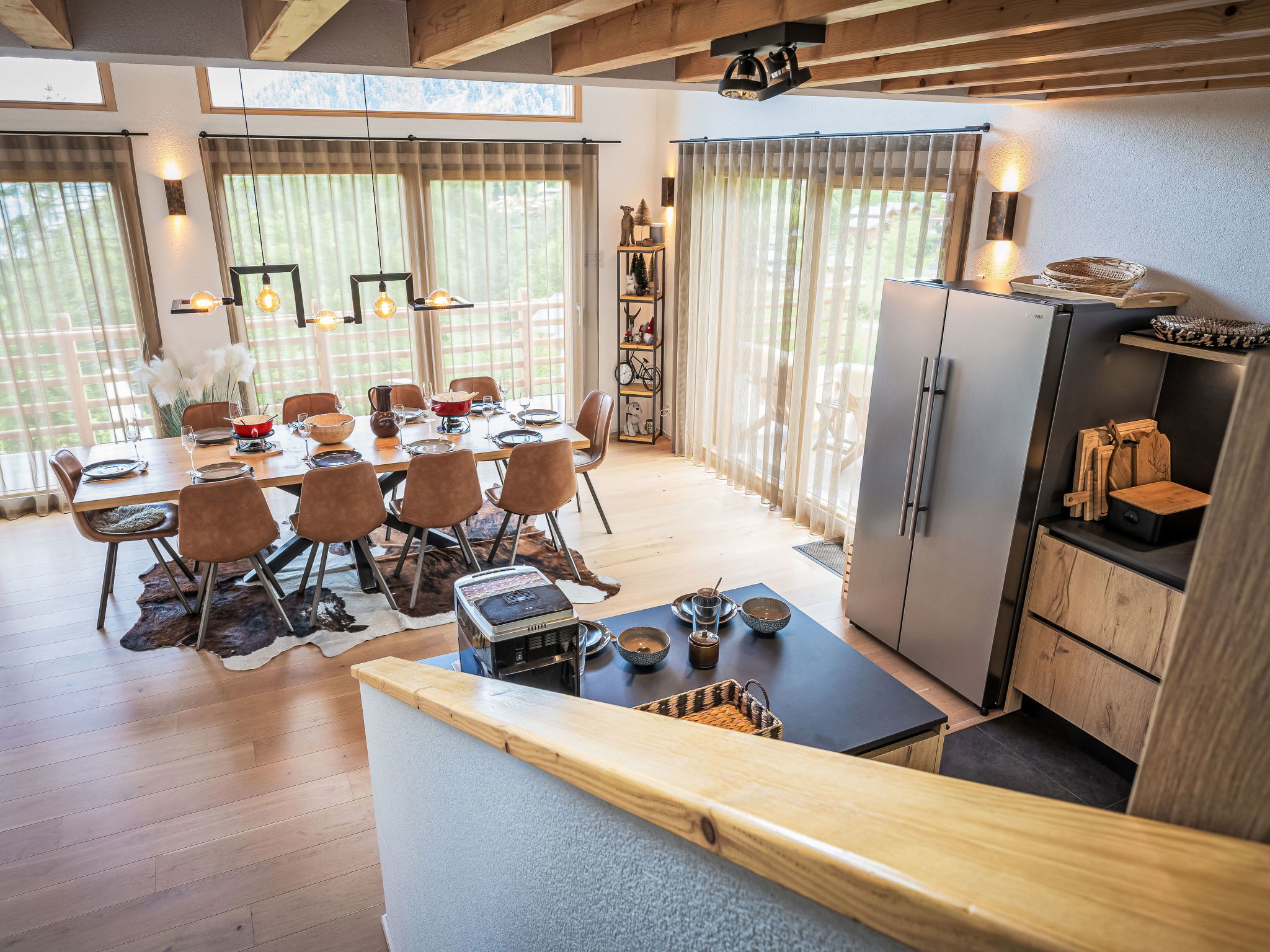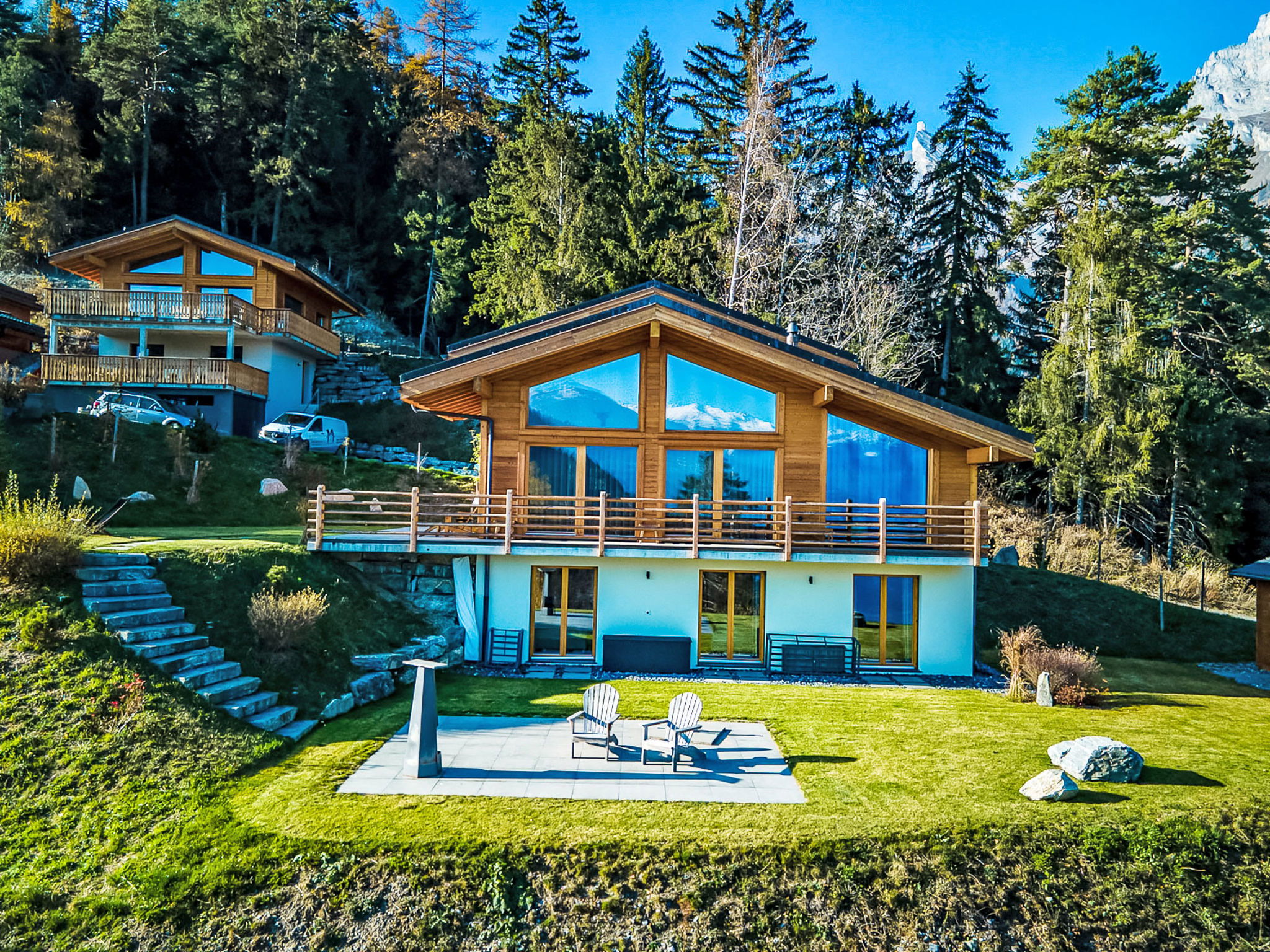 "La Luna", chalet 5 pièces 190 m2 sur 3 niveaux, situation sud. Logement idéal pour 8 adultes + 2 enfants. Spacieux et clair, aménagement très agréable et moderne: grand séjour/salle à manger avec poêle suédois et TV (câblée). Sortie sur le balcon. Cuisine ouverte (four, lave-vaisselle, 5 plaques à induction, grille-pain, bouilloire électrique, micro-ondes, congélateur, cafetière électrique, appareil à raclette, service à fondue (fondue au fromage)). Sortie sur la terrasse, orientée ouest. À l'étage inférieur: 1 chambre avec 1 grand-lit (160 cm, longueur 200 cm). Sortie sur la terrasse. 1 chambre avec 1 lit double (2 x 80 cm, longueur 200 cm). Sortie sur la terrasse. 1 chambre avec 1 x 2 lits superposés (90 cm, longueur 200 cm), 1 lit double (2 x 80 cm, longueur 200 cm). Sortie sur la terrasse. Douche/WC, WC séparé, bain/douche/WC. À l'étage supérieur: 1 grande chambre, mansardée avec 1 grand-lit (160 cm, longueur 200 cm), douche/WC et TV. Grand balcon, situation sud, grande terrasse, situation ouest, grande terrasse, situation sud. Meubles de terrasse, mobilier de balcon, barbecue, chaises longues. Très belle vue panoramique sur les montagnes, la vallée et les alentours. A disposition: lave-linge, sèche-linge, fer à repasser, chaise haute pour enfant, lit bébé jusqu'à 2 ans, sèche-cheveux. Internet (Connexion WIFI, gratuit). Place de parking (3 Voitures) à 10 m. Veuillez noter: maison non-fumeur. Maximum 1 animal/ chien autorisé.