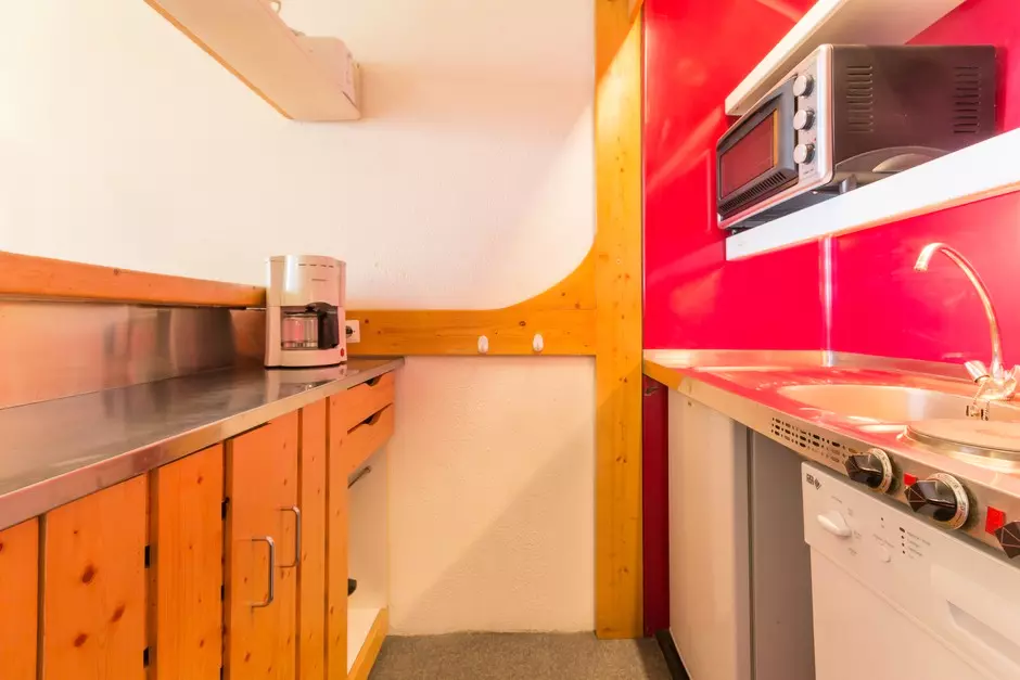 Cuisine comprenant : mini-four, 3 plaques électriques, réfrigérateur, lave-vaisselle, toaster, cafetière électrique à filtre et bouilloire.
