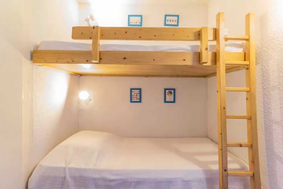 Entrée avec 2 lits superposés et 1 lit gigogne en 80m ( le couchage en hauteur ne convient pas aux enfants de - 6ans)