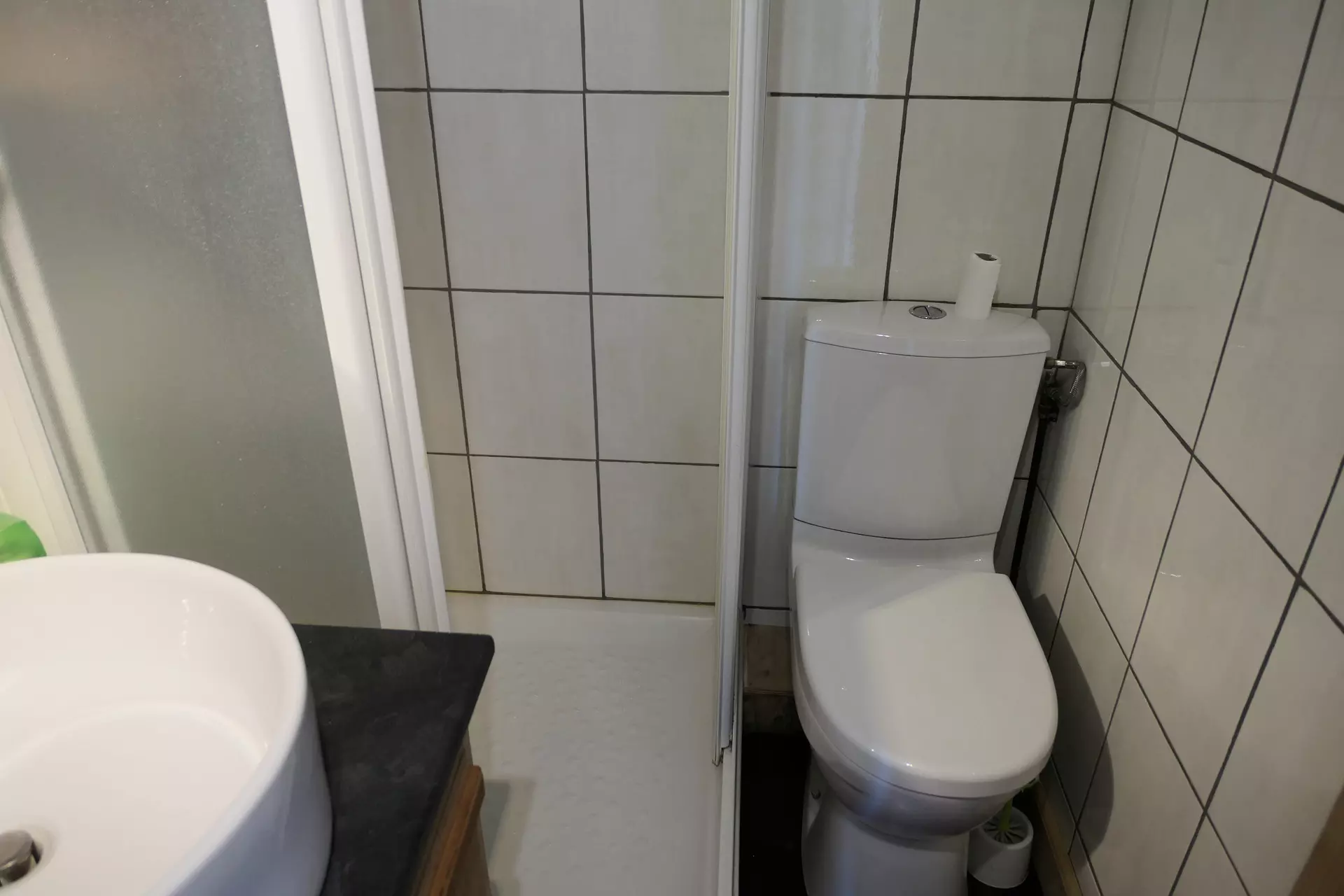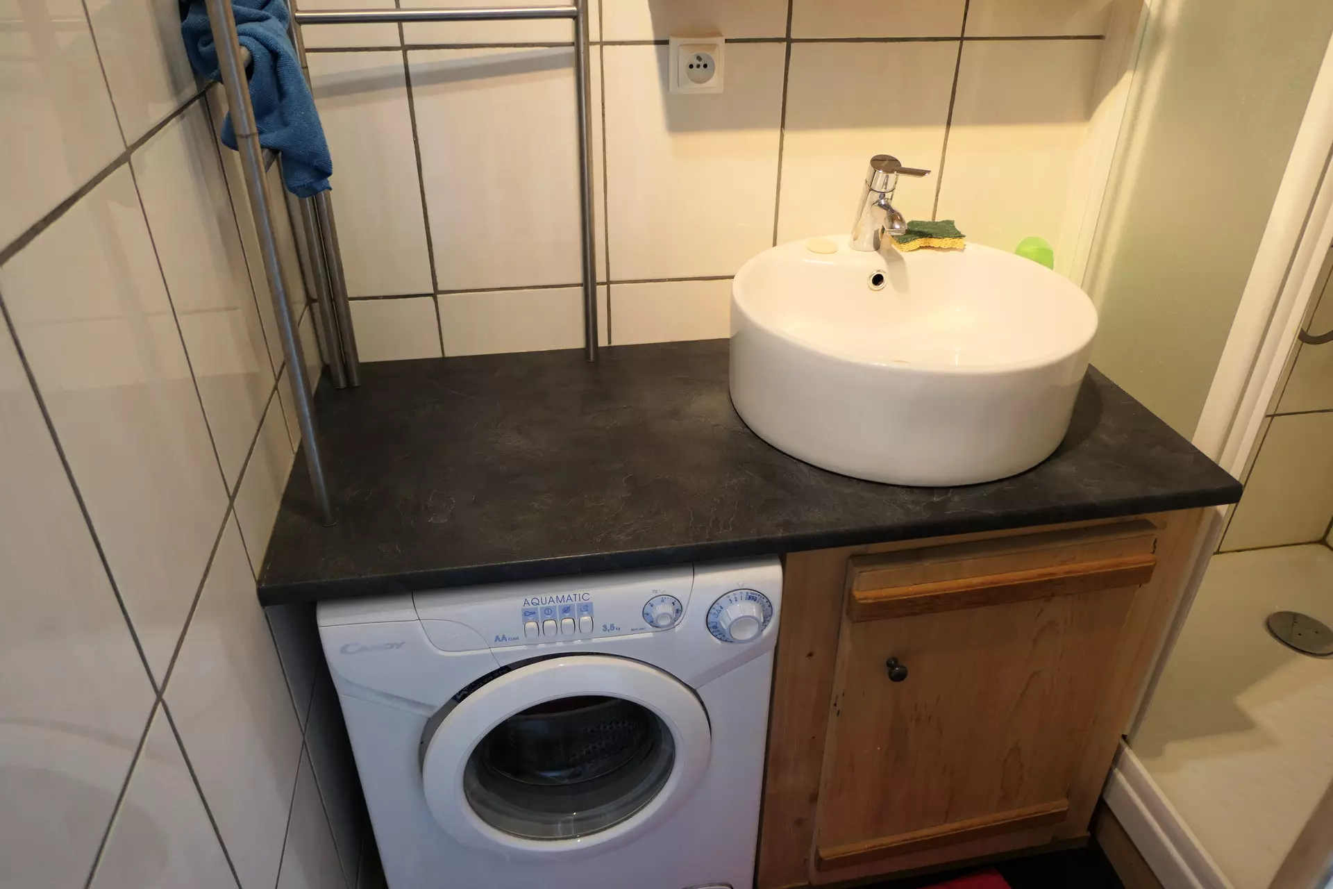 - Salle de bain avec douche, meuble vasque, lave-linge et WC.