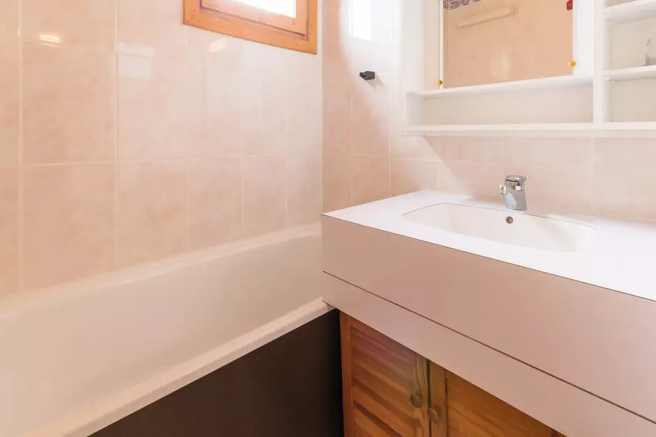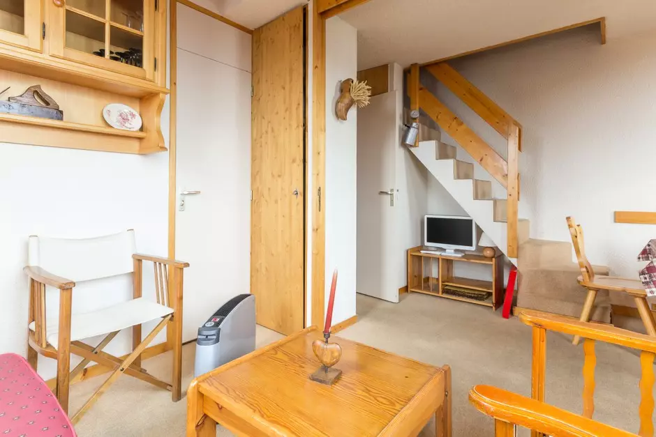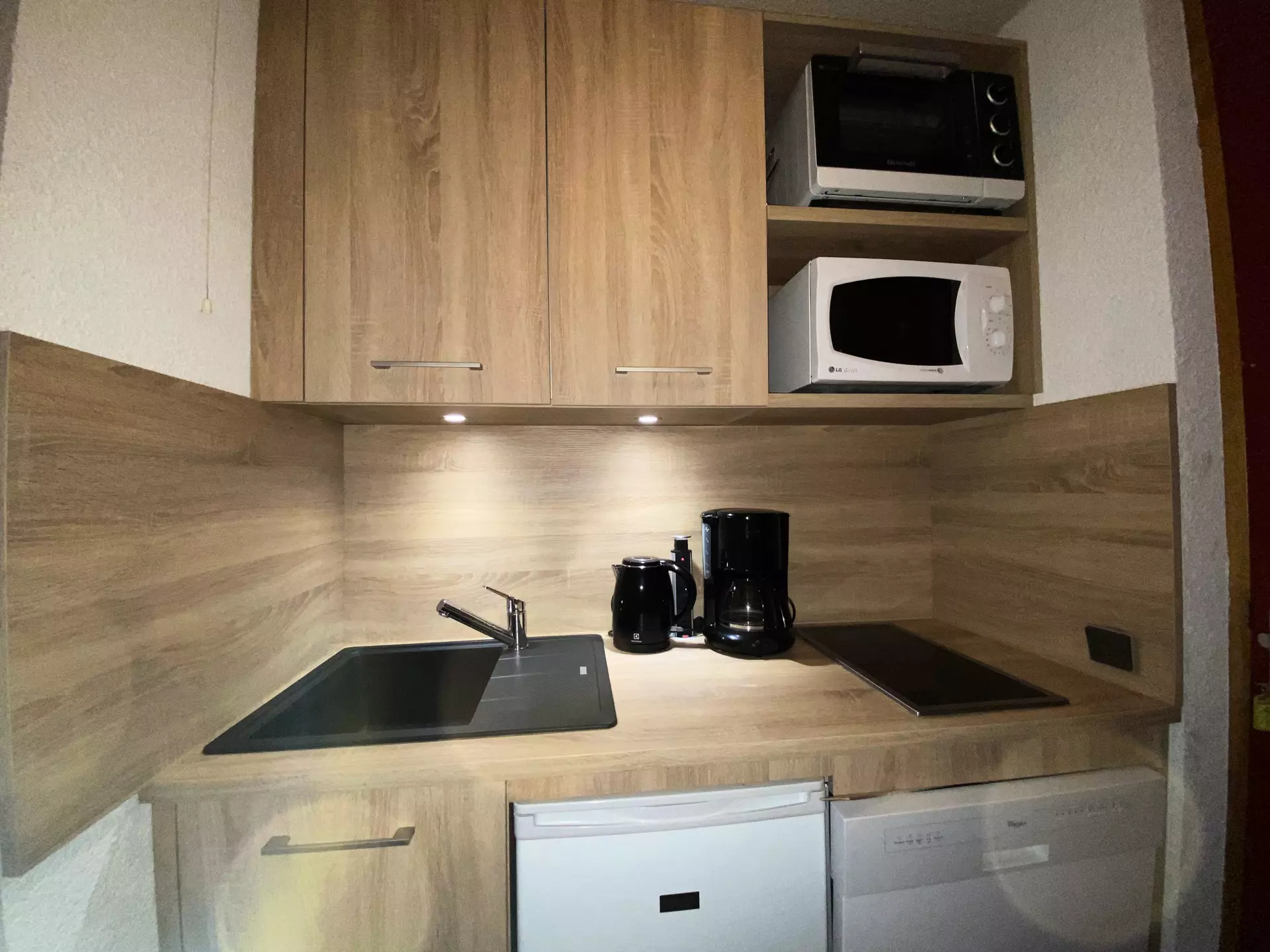 Cet appartement deux pièces mezzanine en duplex avec une vue panoramique sur la vallée et les montagnes se compose d'une kitchenette équipée (plaques électriques, lave-vaisselle, four combiné micro-ondes, cafetière), d'une salle de bain avec baignoire et wc séparé, d'un salon disposant un canapé lit pour 2 personnes.