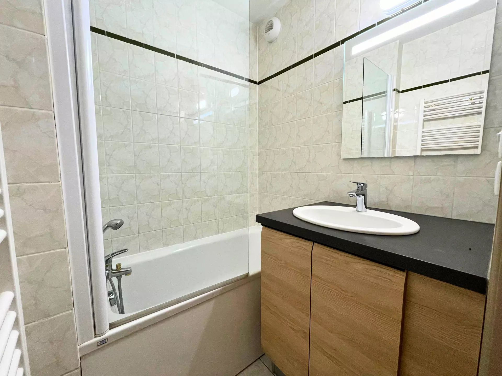 Salle de bains 1 : lavabo, baignoire, sèche-serviettes