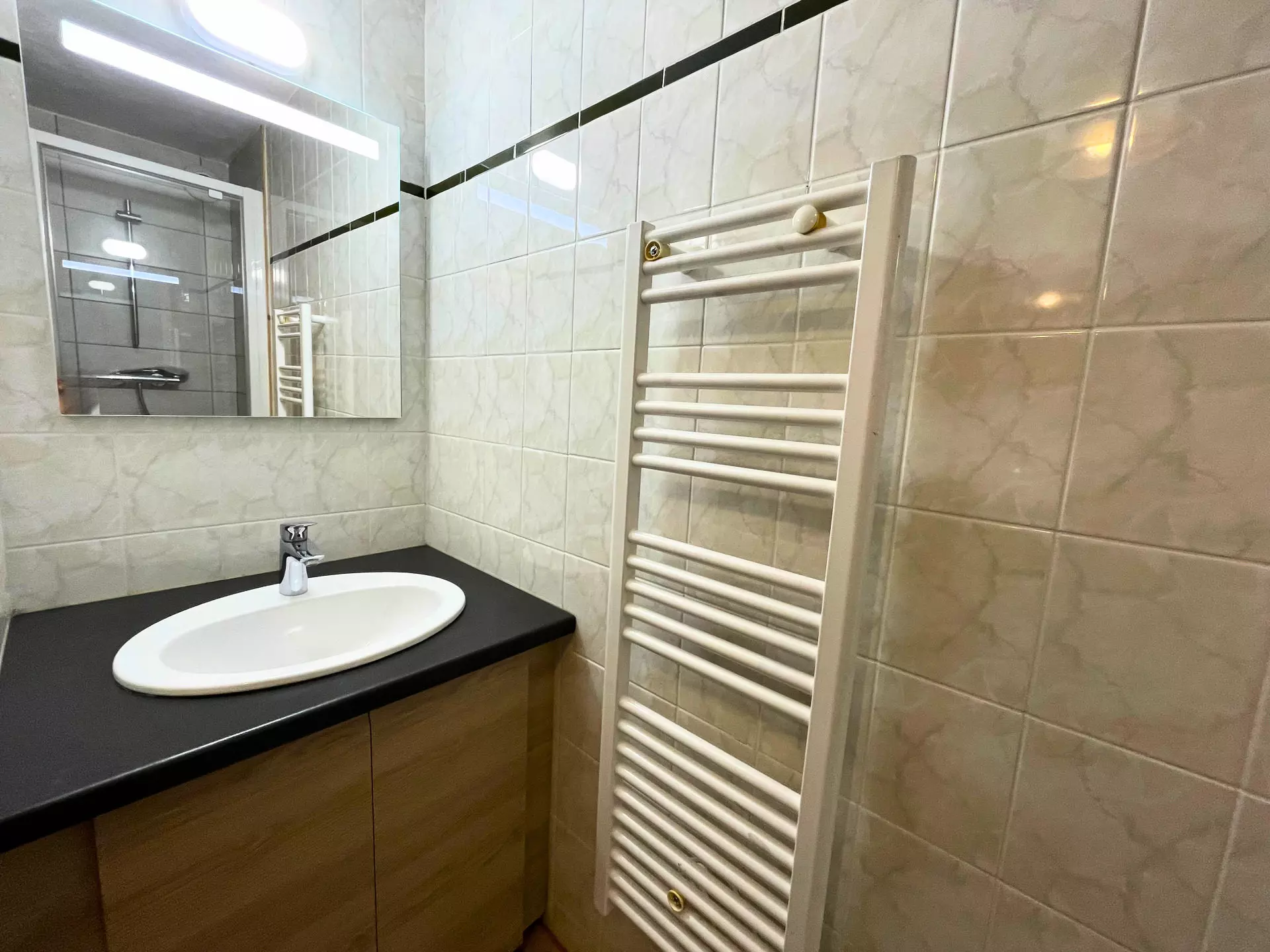 Salle de bains 2 : lavabo, douche, sèche serviettes