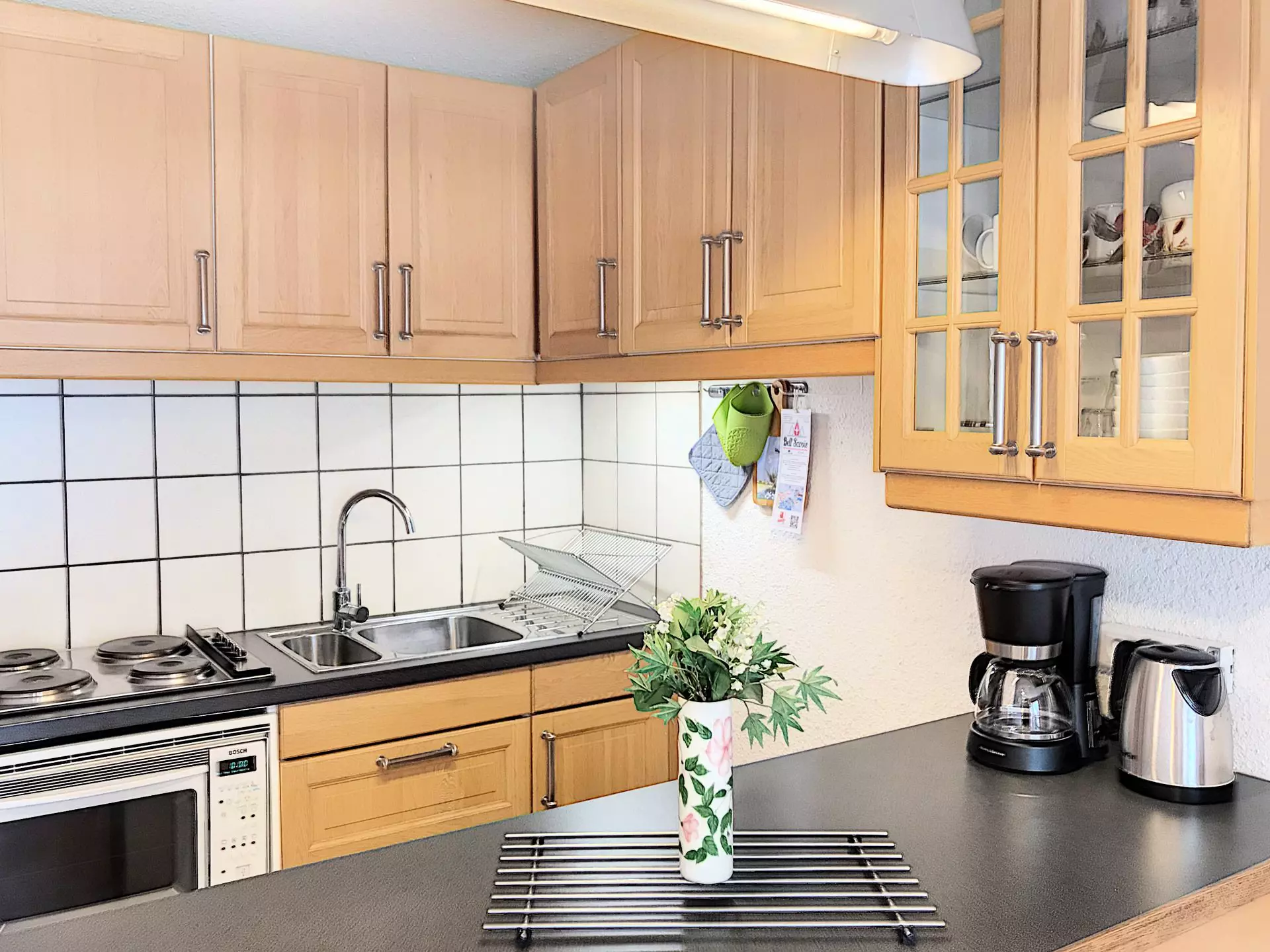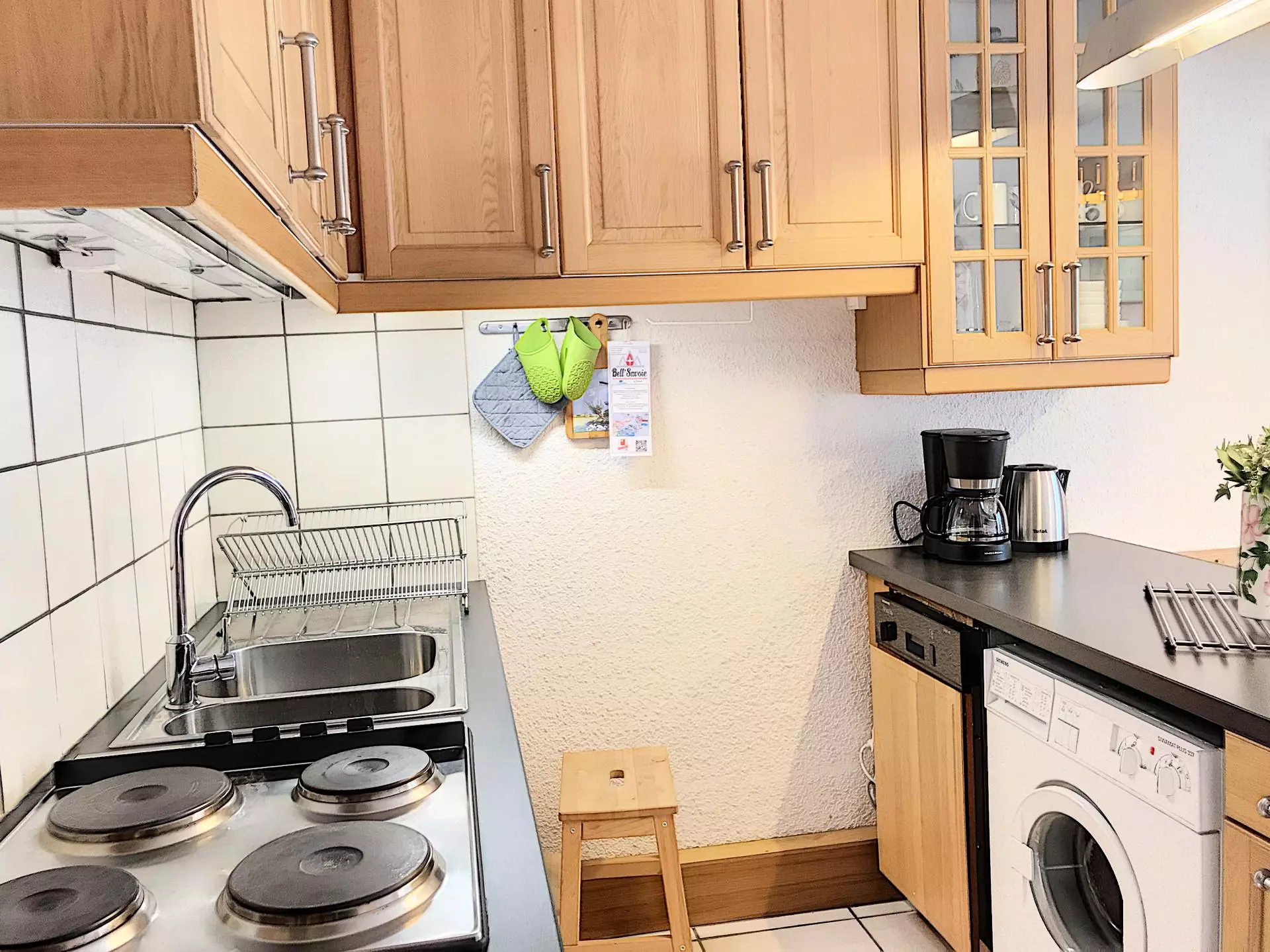 Cuisine: 4 plaques électriques, réfrigérateur, congélateur,combiné four / micro-ondes, lave-vaisselle, lave linge, bouilloire, cafetiere électrique, grille pain