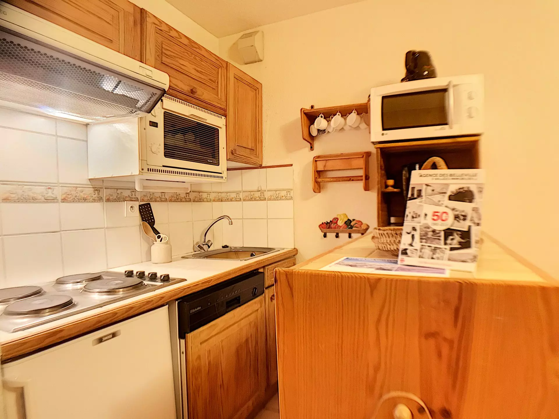 Cuisine 4 plaques électriques, four, four micro-ondes, réfrigérateur, lave-vaisselle, grille-pain, bouilloire et cafetière électrique