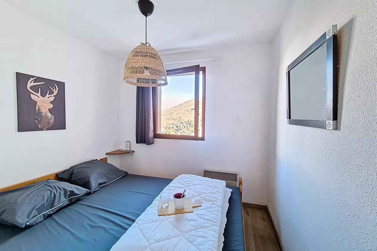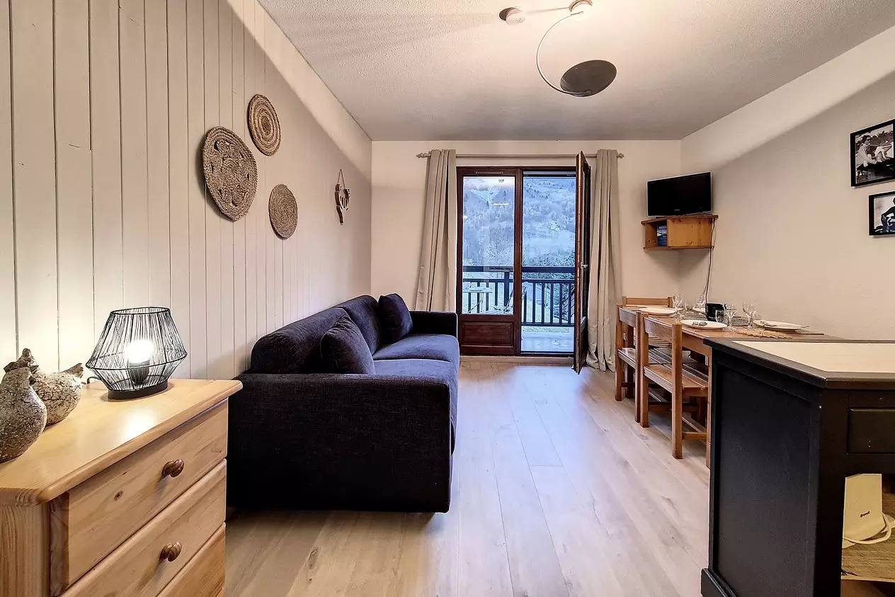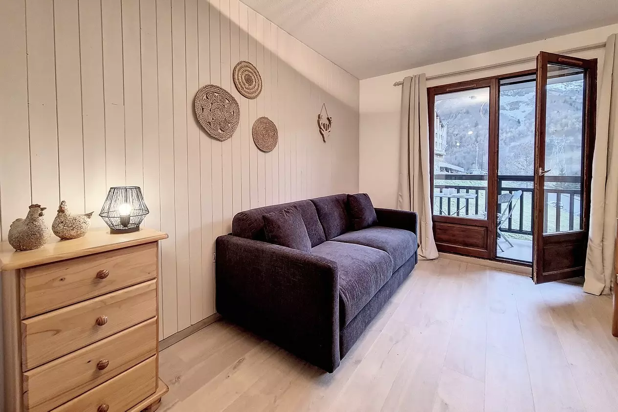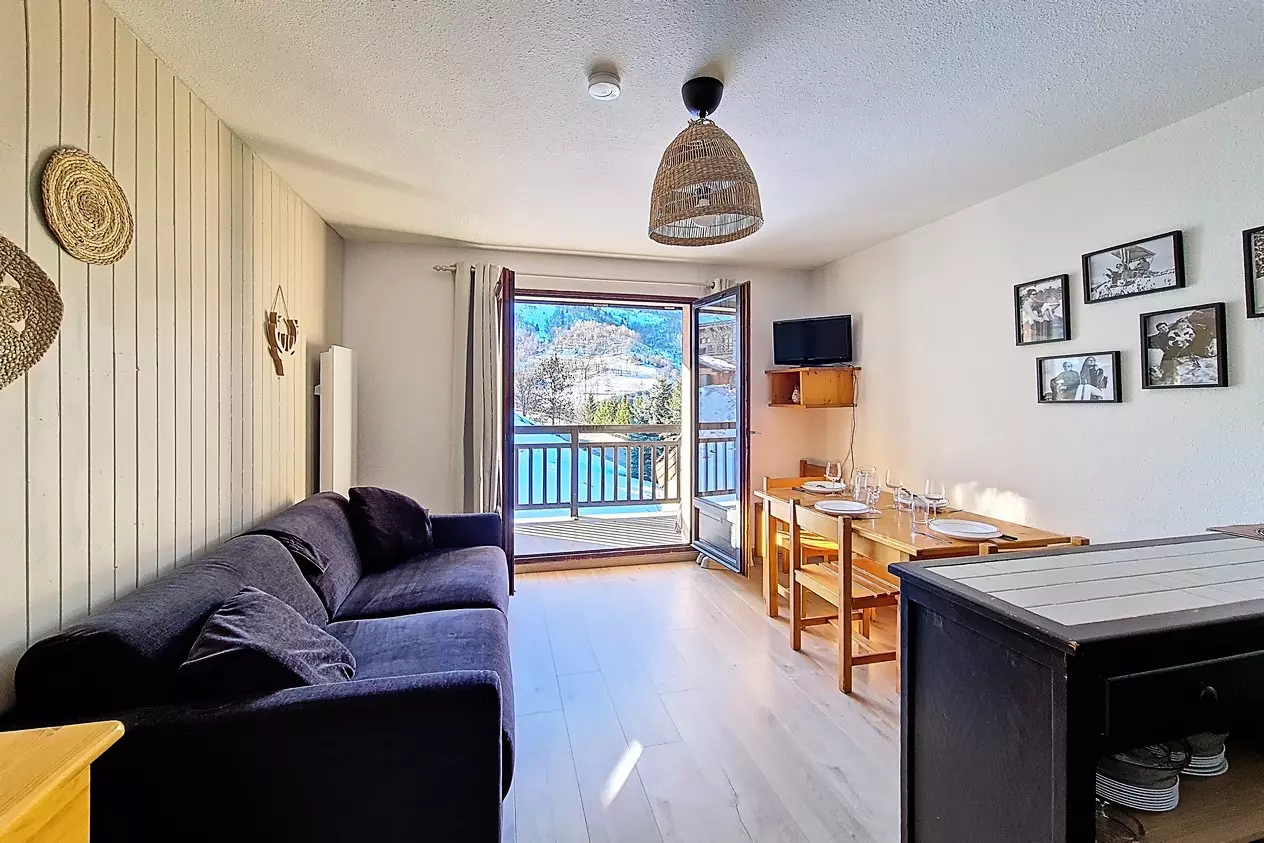 Il possède un large balcon (avec table, transats et lampes rechargeables) exposé sud-ouest offrant une belle vue sur le massif du Cochet.