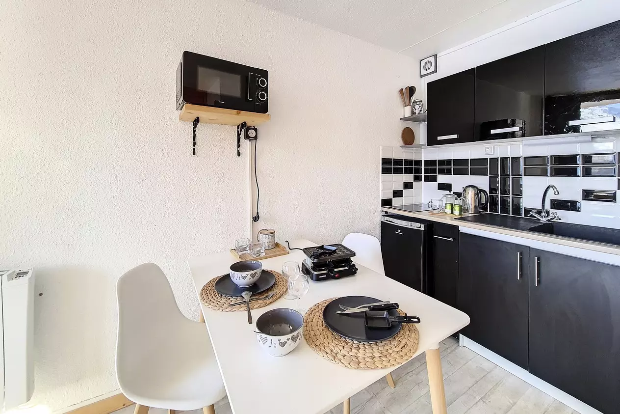 Cuisine incorporée 2 plaques vitocéramiques, micro-ondes, bouilloire, cafetière italienne, grille pain.