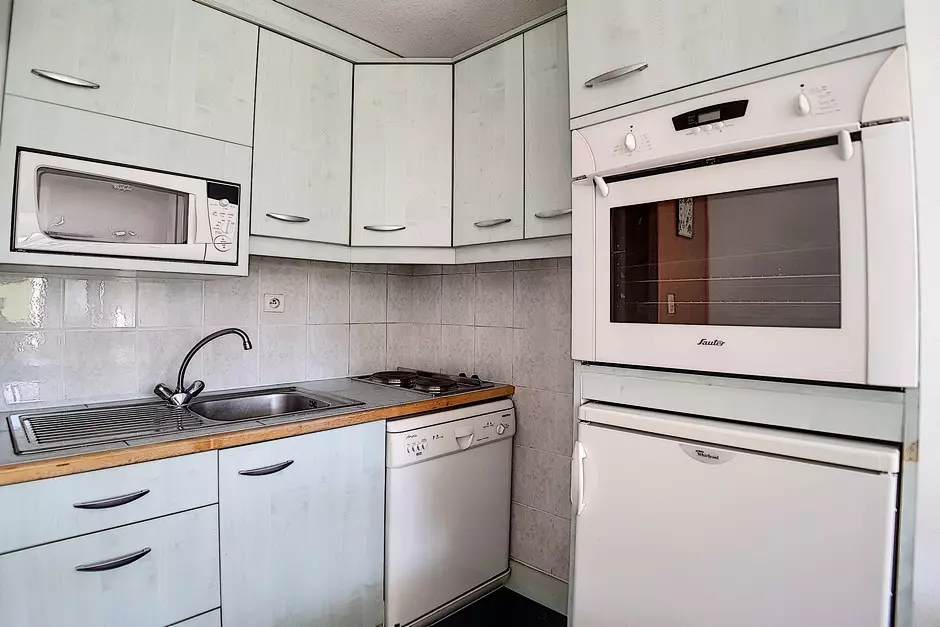 Cuisine incorporée 2 plaques, réfrigérateur, four, micro ondes et lave vaisselle, bouilloire, grille-pain et cafetière.