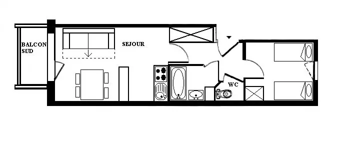 Séjour : 1 banquette-lit 1 personne et 1 lit gigogne 1 personne relevable. Equipé d'une télévision.