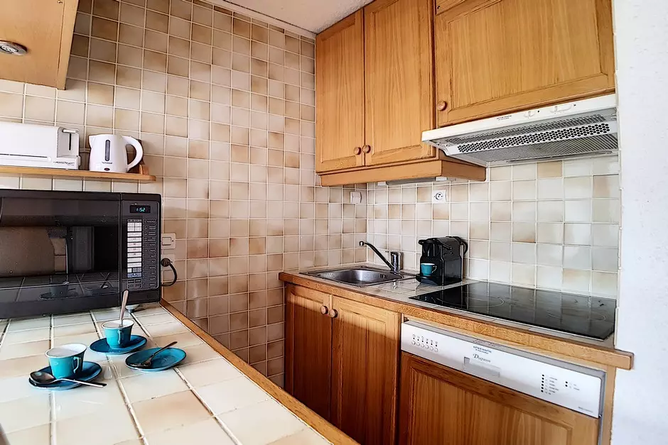 Cuisine avec 4 plaques, four combiné micro-ondes + Grill, réfrigérateur,lave vaisselle, grille-pain, bouilloire et cafetière.