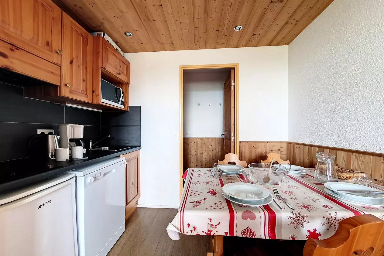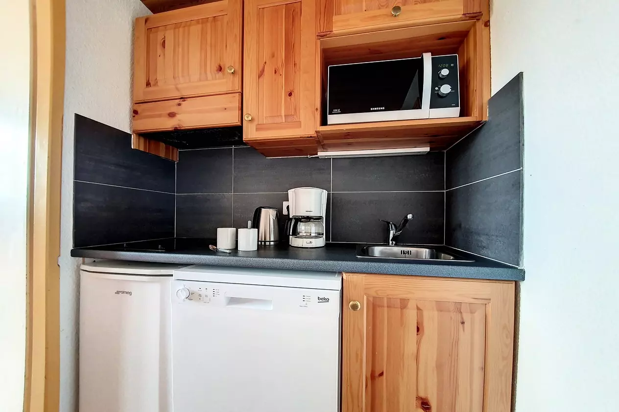 Cuisine incorporée 2 plaques, micro-onde, réfrigérateur, lave-vaisselle,grill-pain, bouilloire et cafetière électrique.
