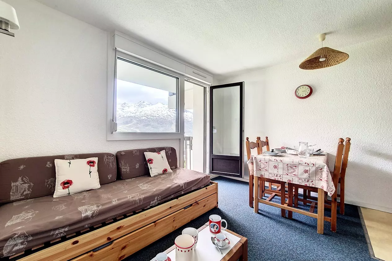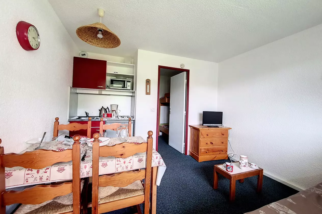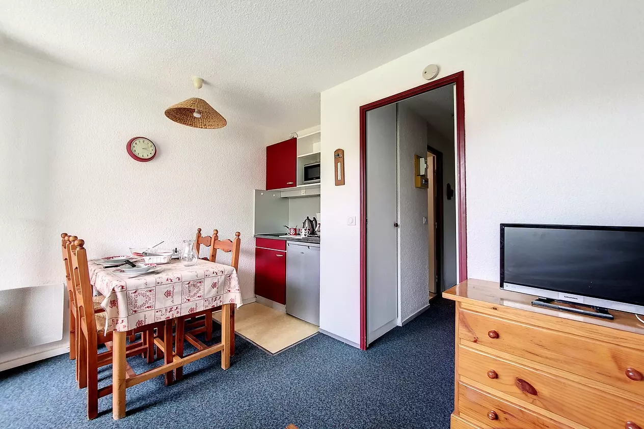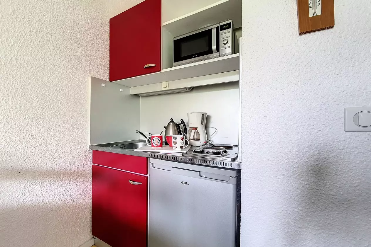 Studio avec un coin montagne de 18 m² pour 3 personnes. Il est situé au 4ème étage avec ascenseur et dispose d'un balcon orienté Sud/Est.