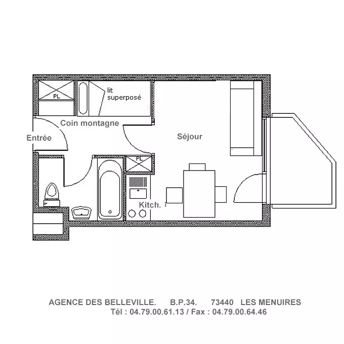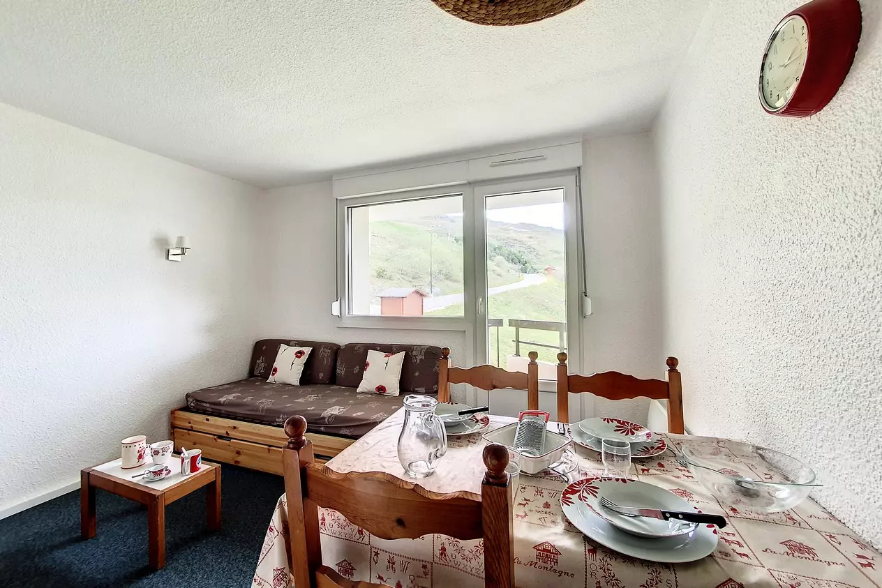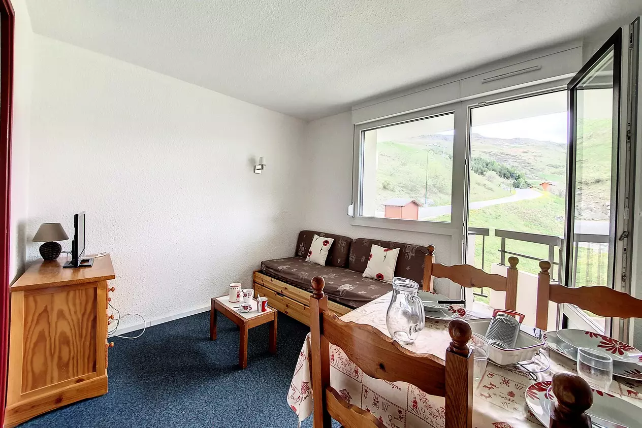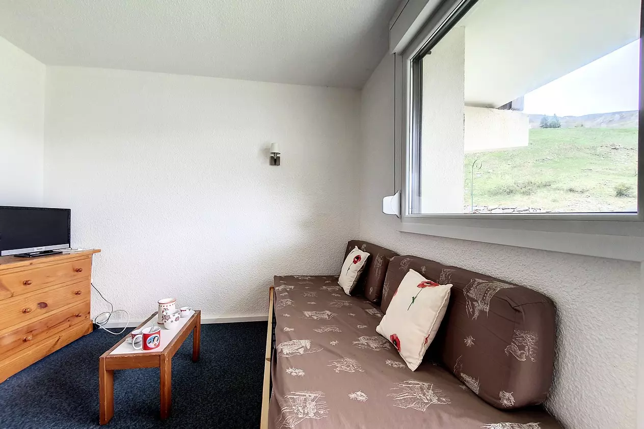 Studio avec un coin montagne de 18 m² pour 3 personnes. Il est situé au 4ème étage avec ascenseur et dispose d'un balcon orienté Sud/Est.