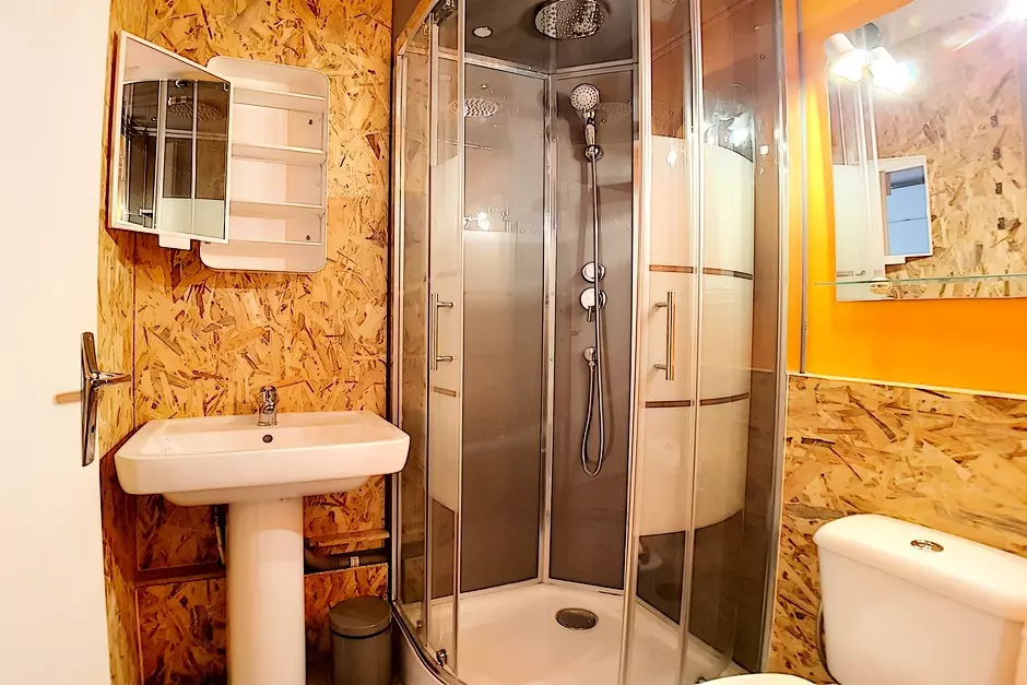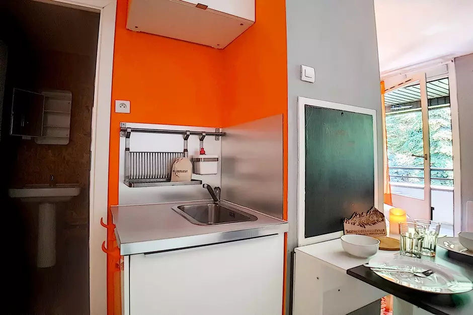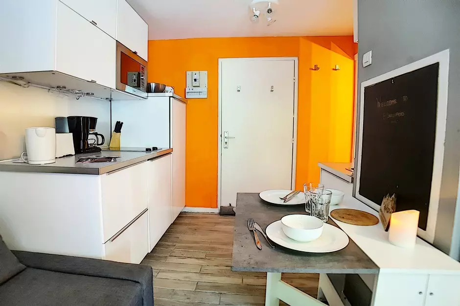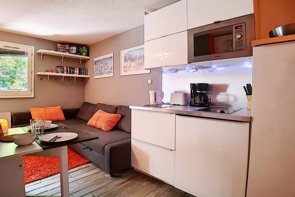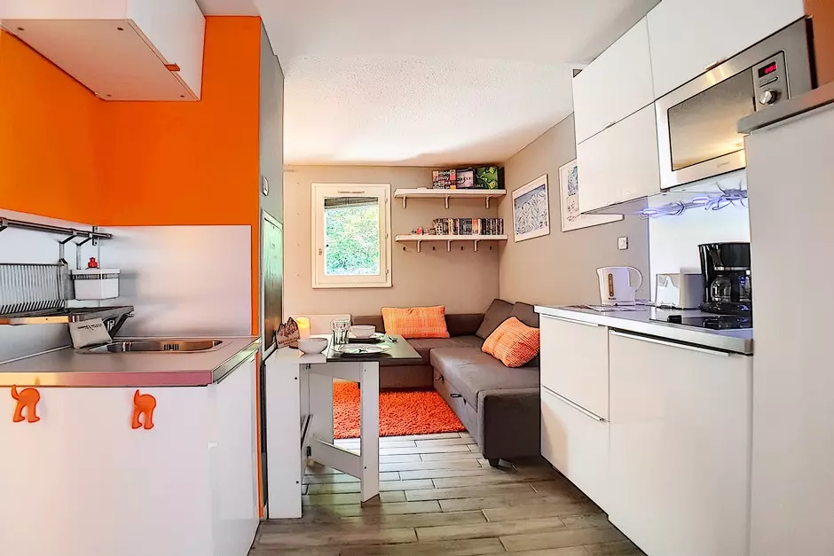 Cuisine équipée de 2 plaques vitro-céramiques, réfrigérateur, micro-ondes, cafetière et bouilloire.