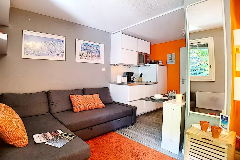 Séjour équipé d'un canapé et d"une télévision avec lecteur DVD.