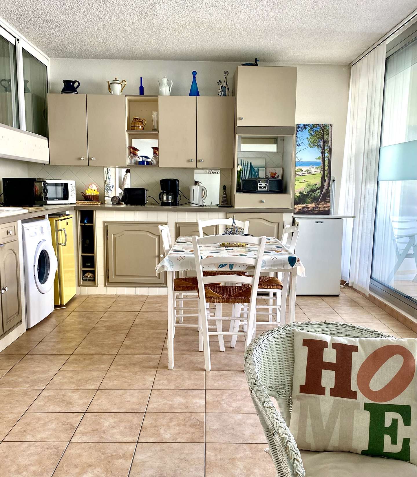 En descendant à l’étage inférieur, vous découvrirez une agréable pièce de vie lumineuse orientée Nord. La cuisine ouverte est entièrement équipée : machine à laver, deux plaques électriques, mini four, micro-ondes, deux petits réfrigérateurs, bouilloire, cafetière filtre, etc…