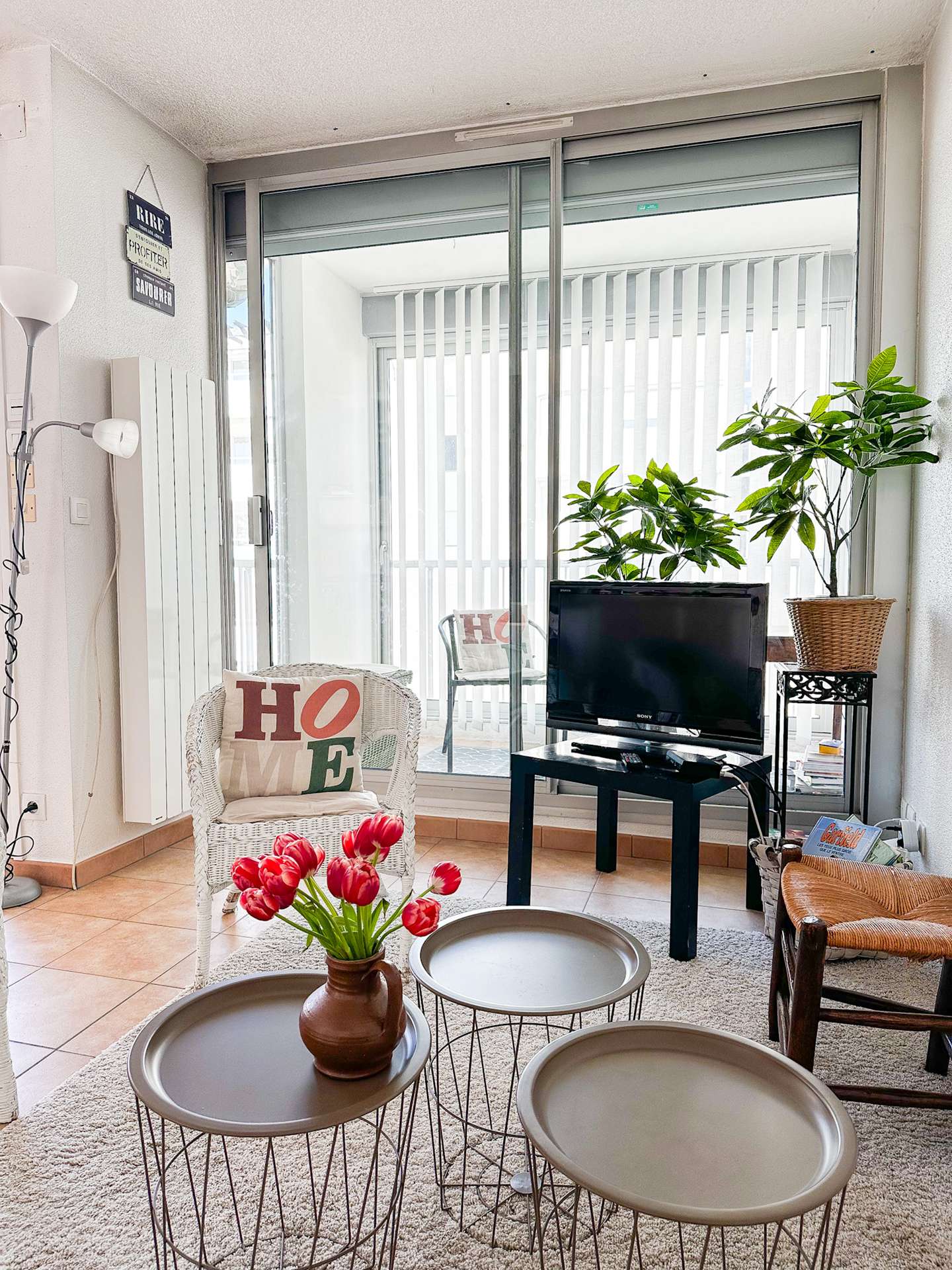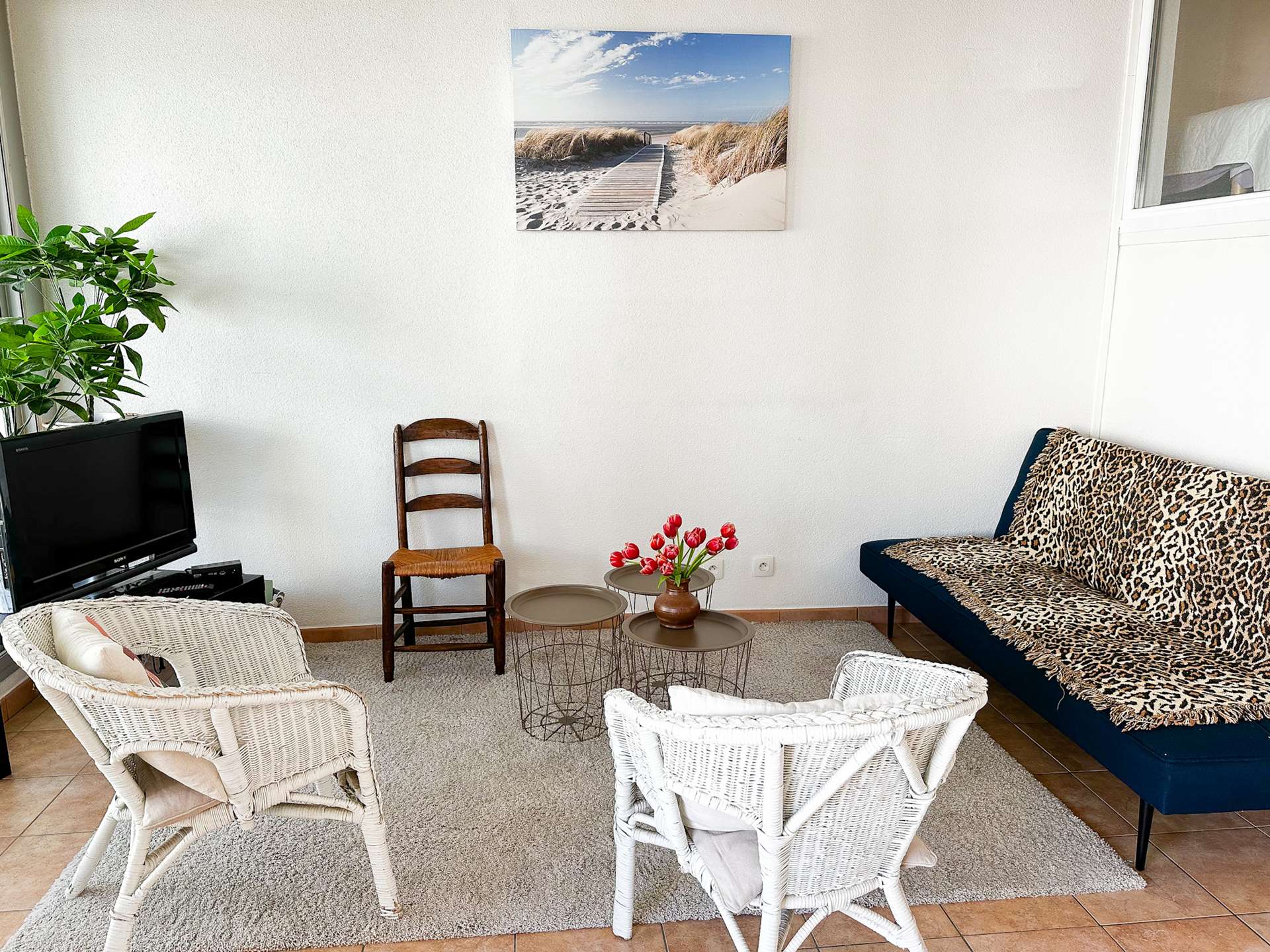 Le coin salon dispose d’un canapé, de deux fauteuils et d’une télévision avec son décodeur. Cet espace s’ouvre sur une loggia aménagée en coin détente, idéale pour se relaxer à l’abri.