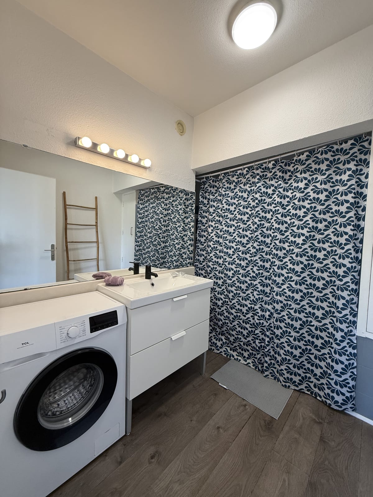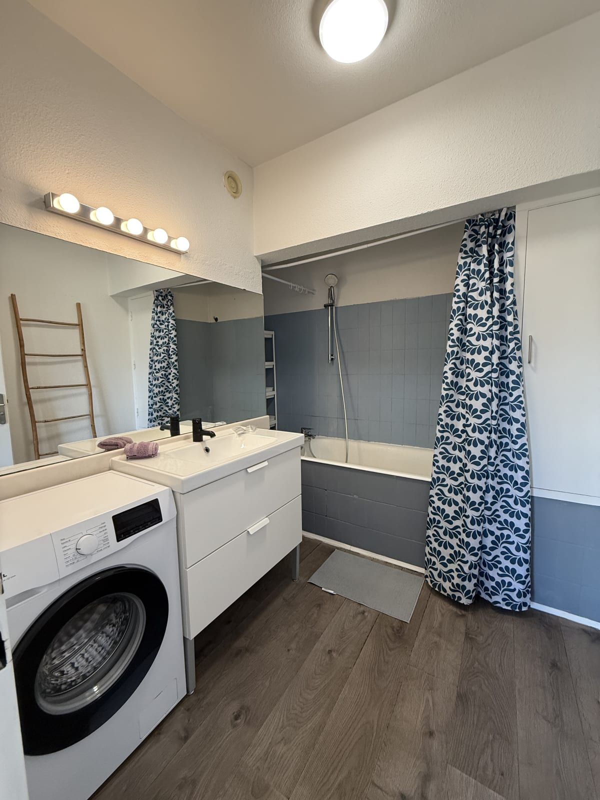 La salle de bain dispose d'une baignoire et d'une machine à laver.
