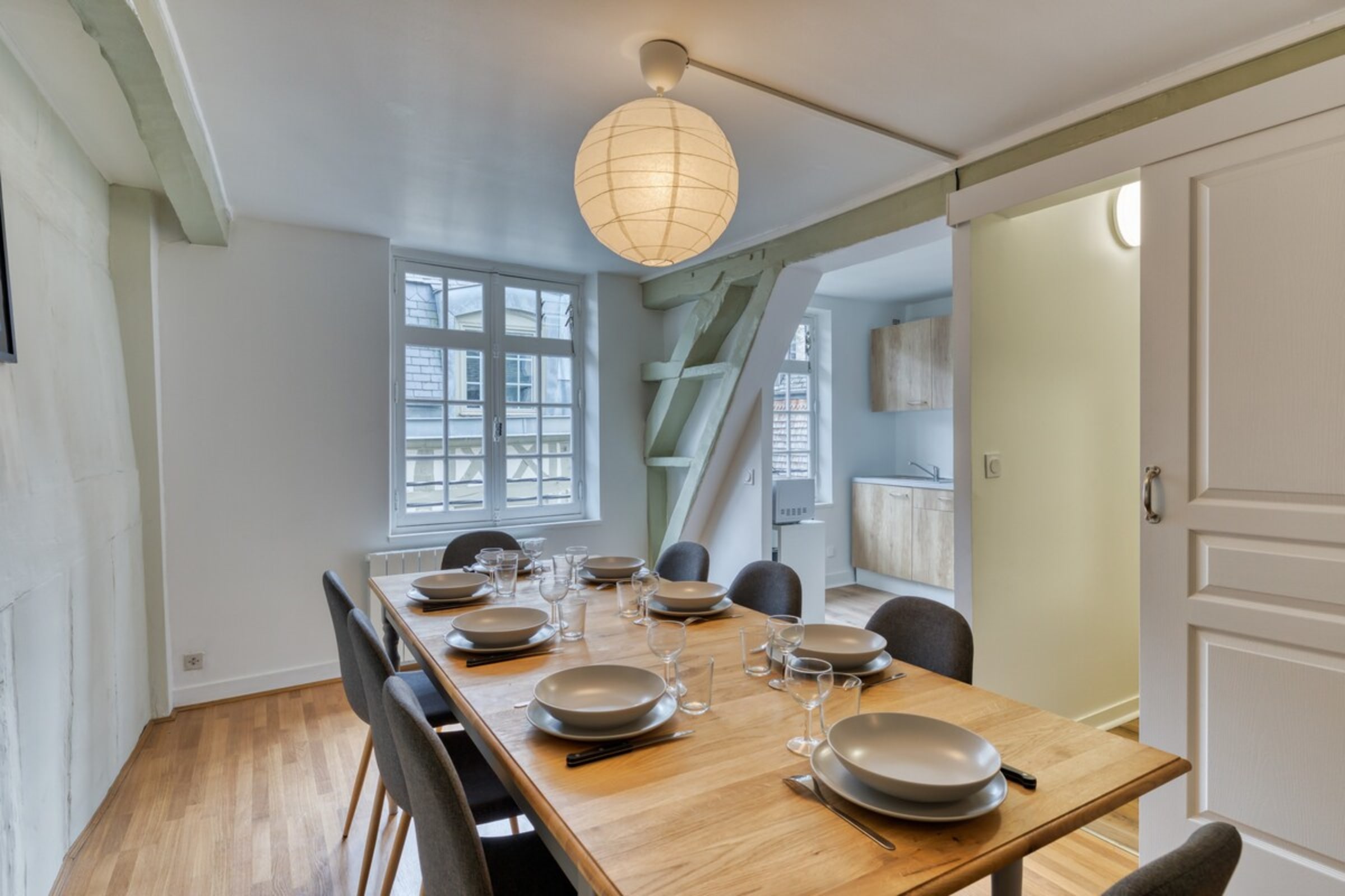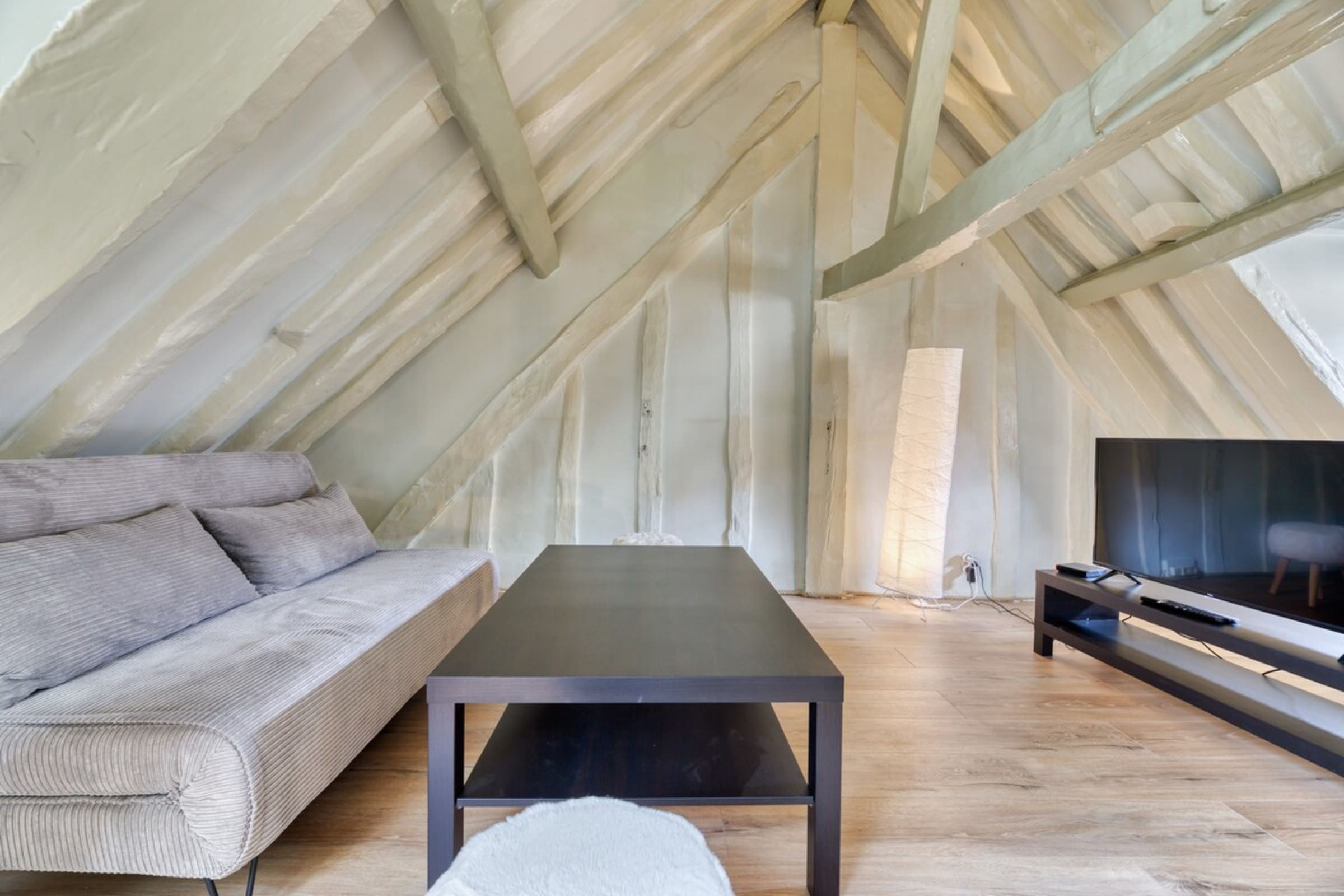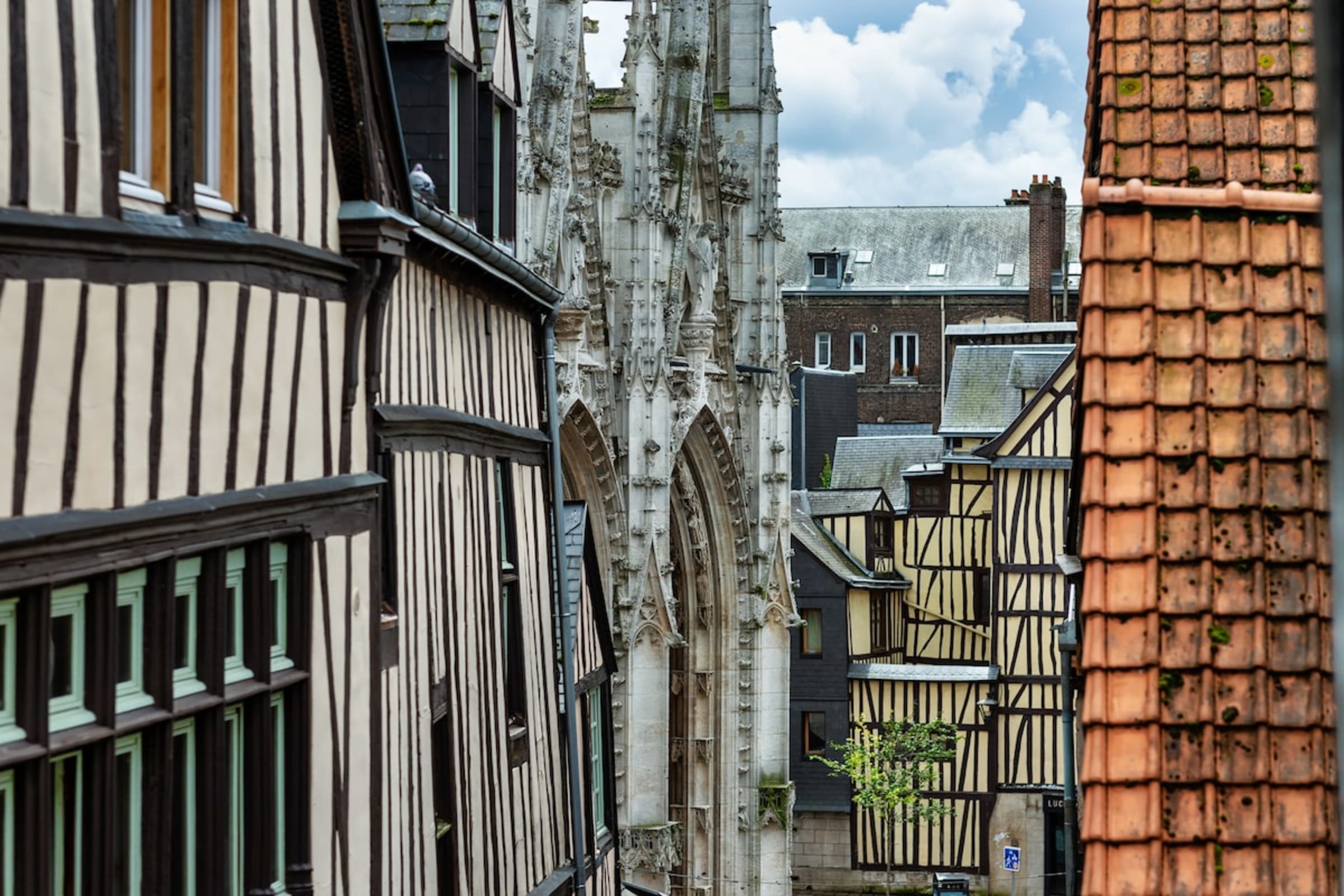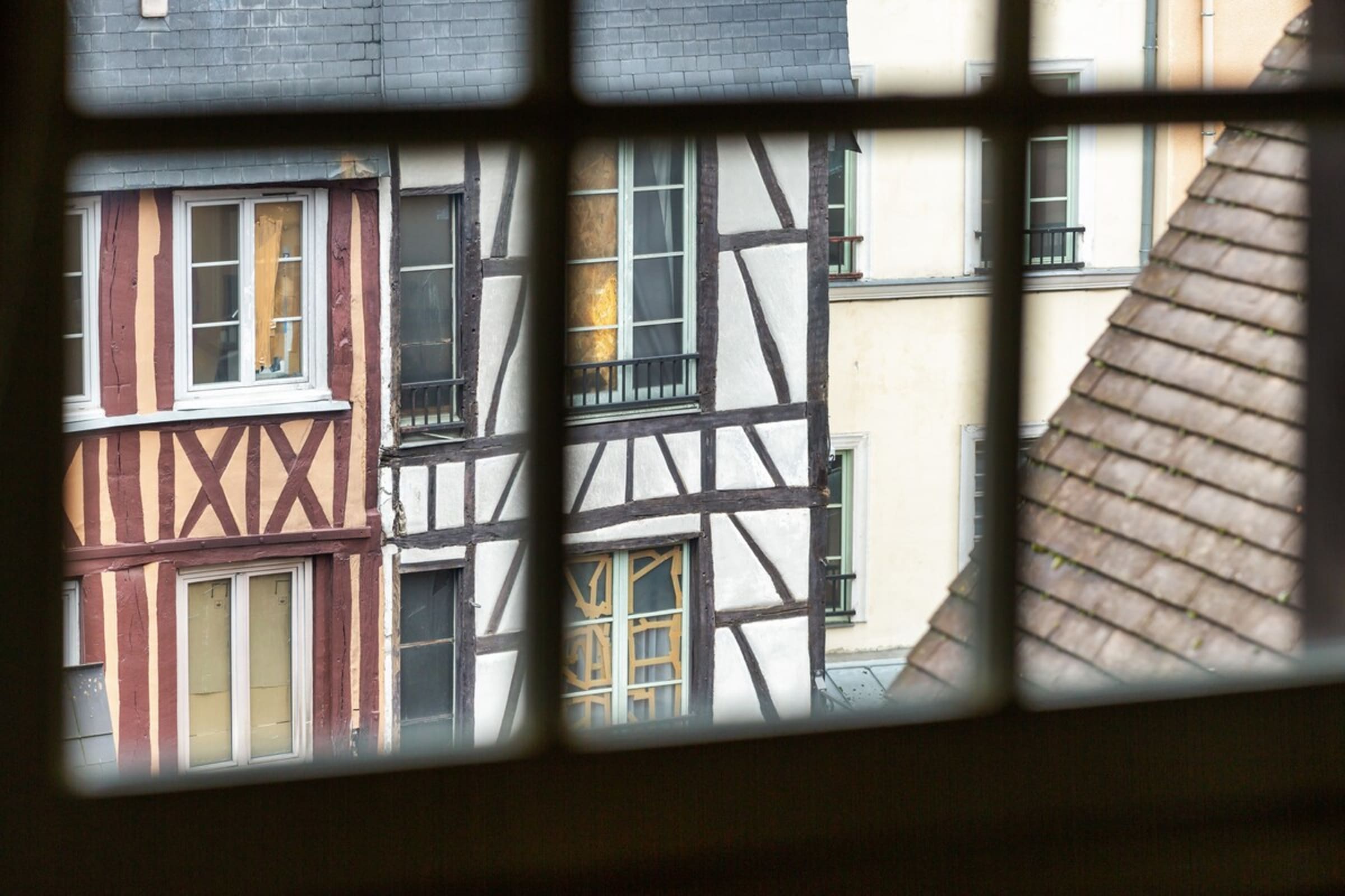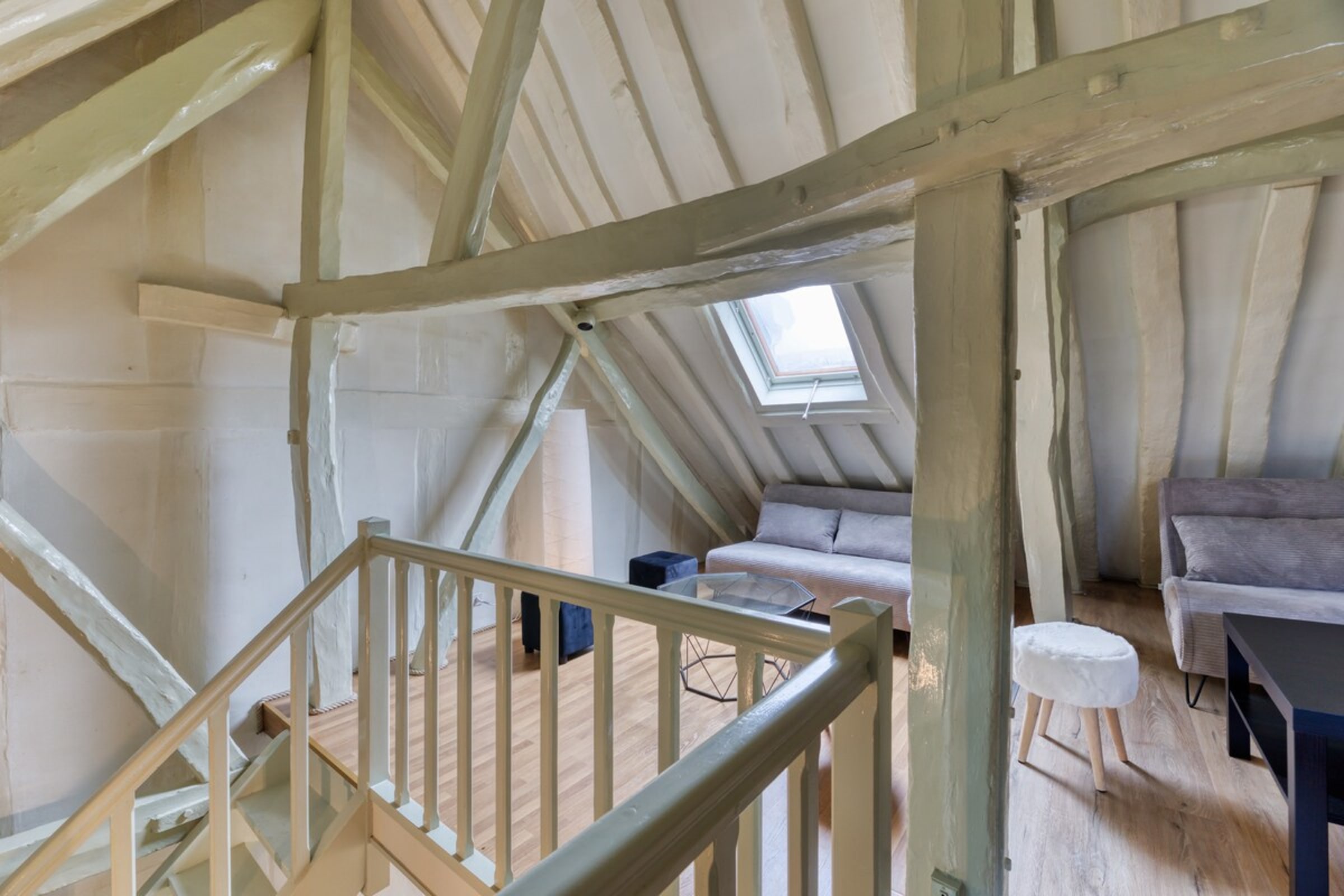 Le salon en mezzanine, accessible par un escalier, offre une jolie vue sur les toits de Rouen et l’église Saint-Maclou, à quelques pas seulement.