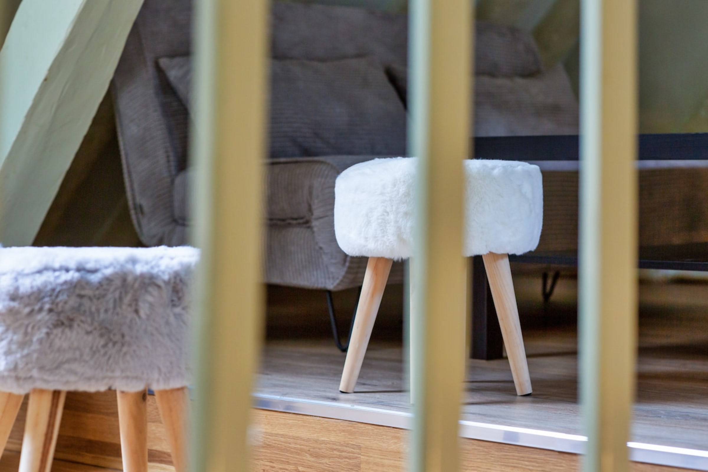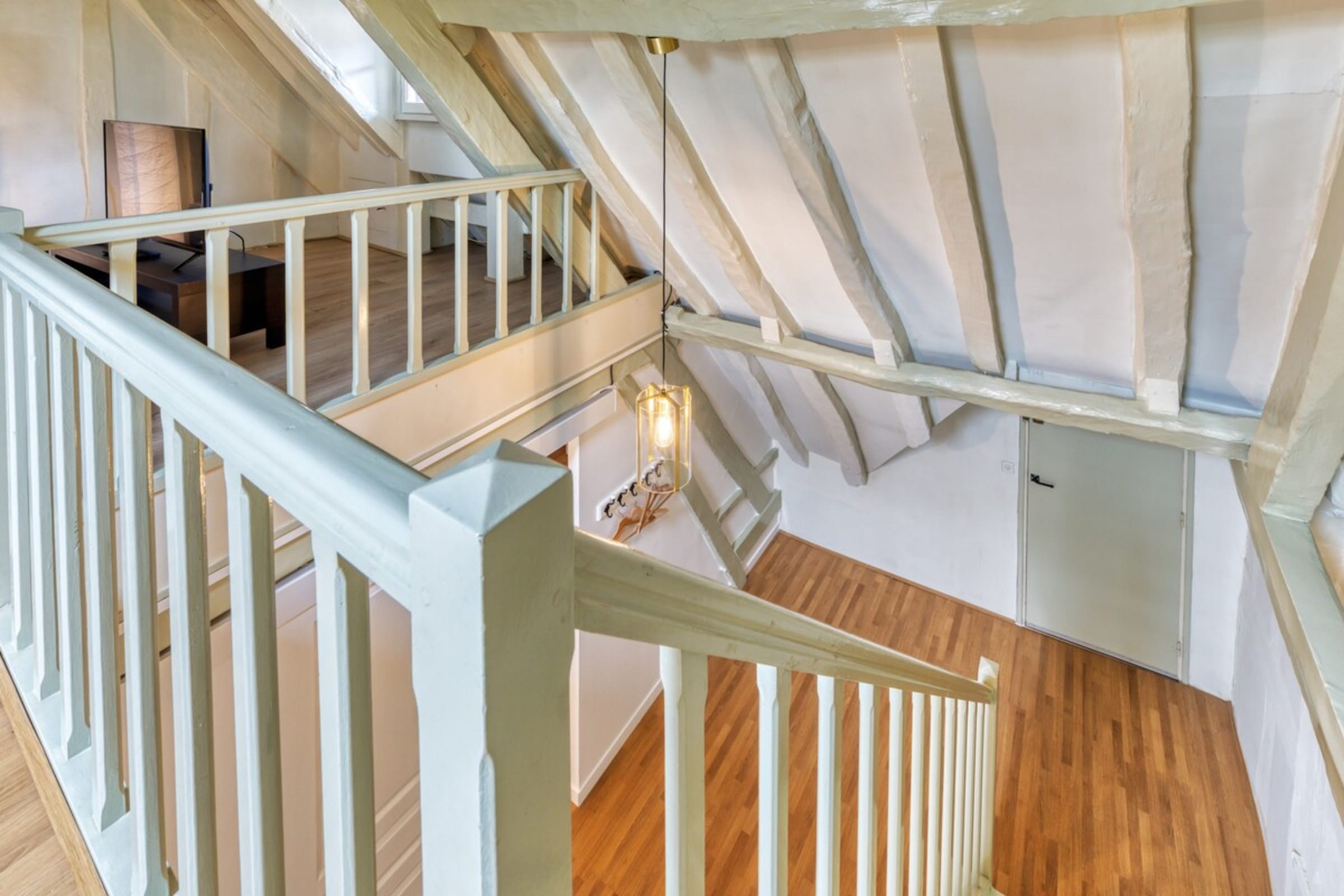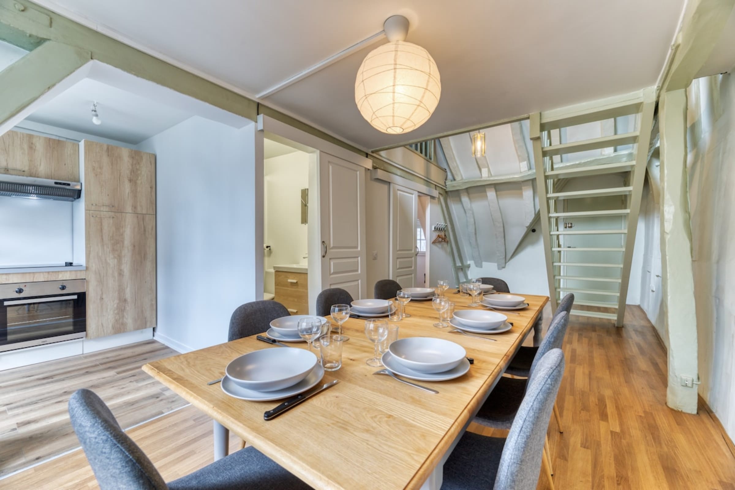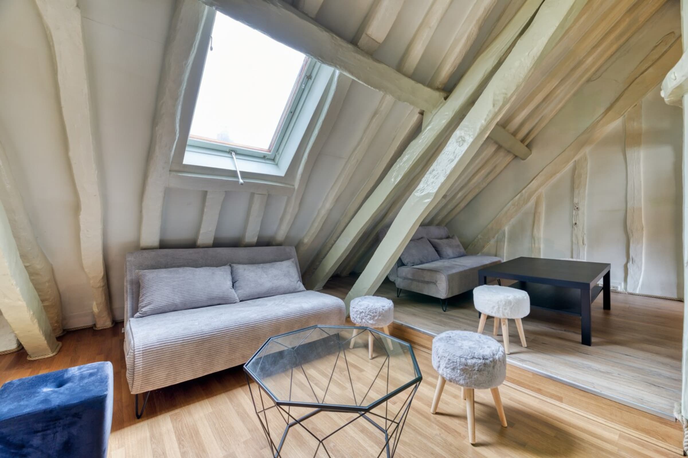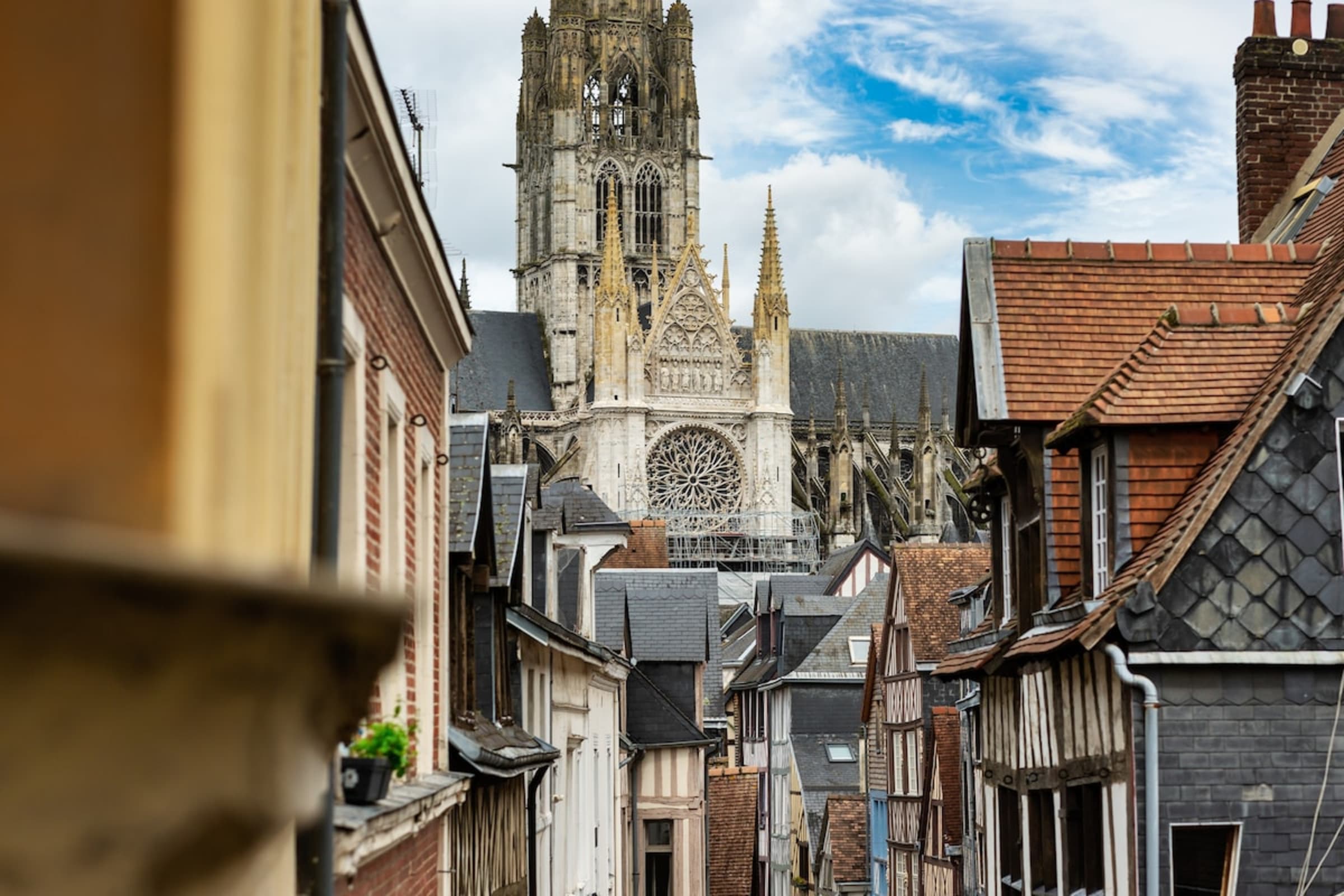 Le salon en mezzanine, accessible par un escalier, offre une jolie vue sur les toits de Rouen et l’église Saint-Maclou, à quelques pas seulement.