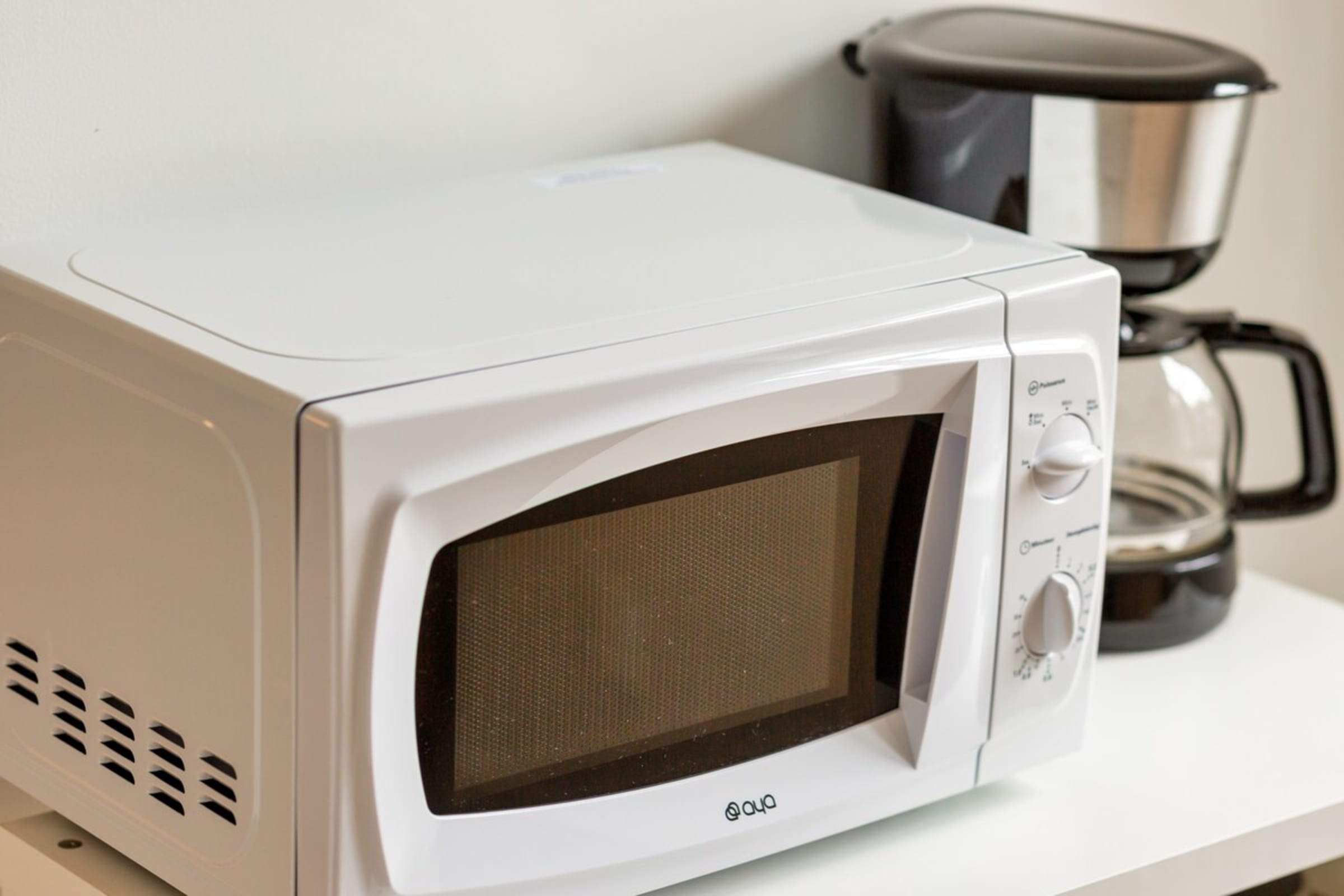 La cuisine ouverte comprend tout le nécessaire pour cuisiner : plaques de cuisson, four, micro-ondes, cafetière à filtre, ustensiles…