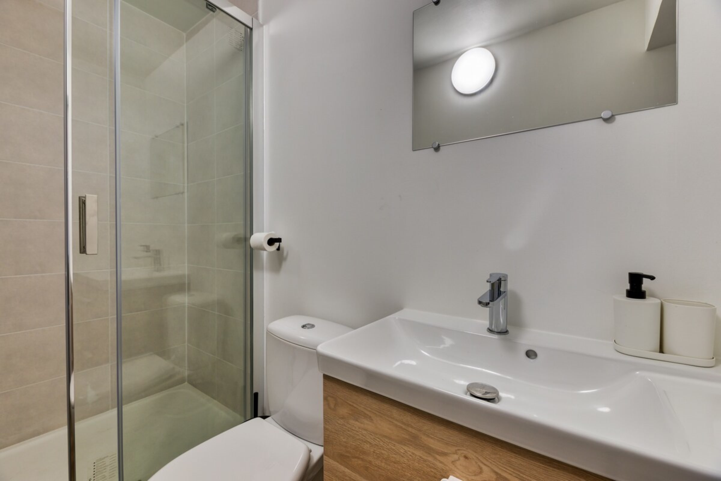 Réparti sur deux niveaux, le logement dispose d’une cuisine entièrement équipée ouverte sur une salle à manger conviviale, d’un salon en mezzanine baigné de lumière, et de trois chambres, chacune dotée de sa propre salle d’eau privative.