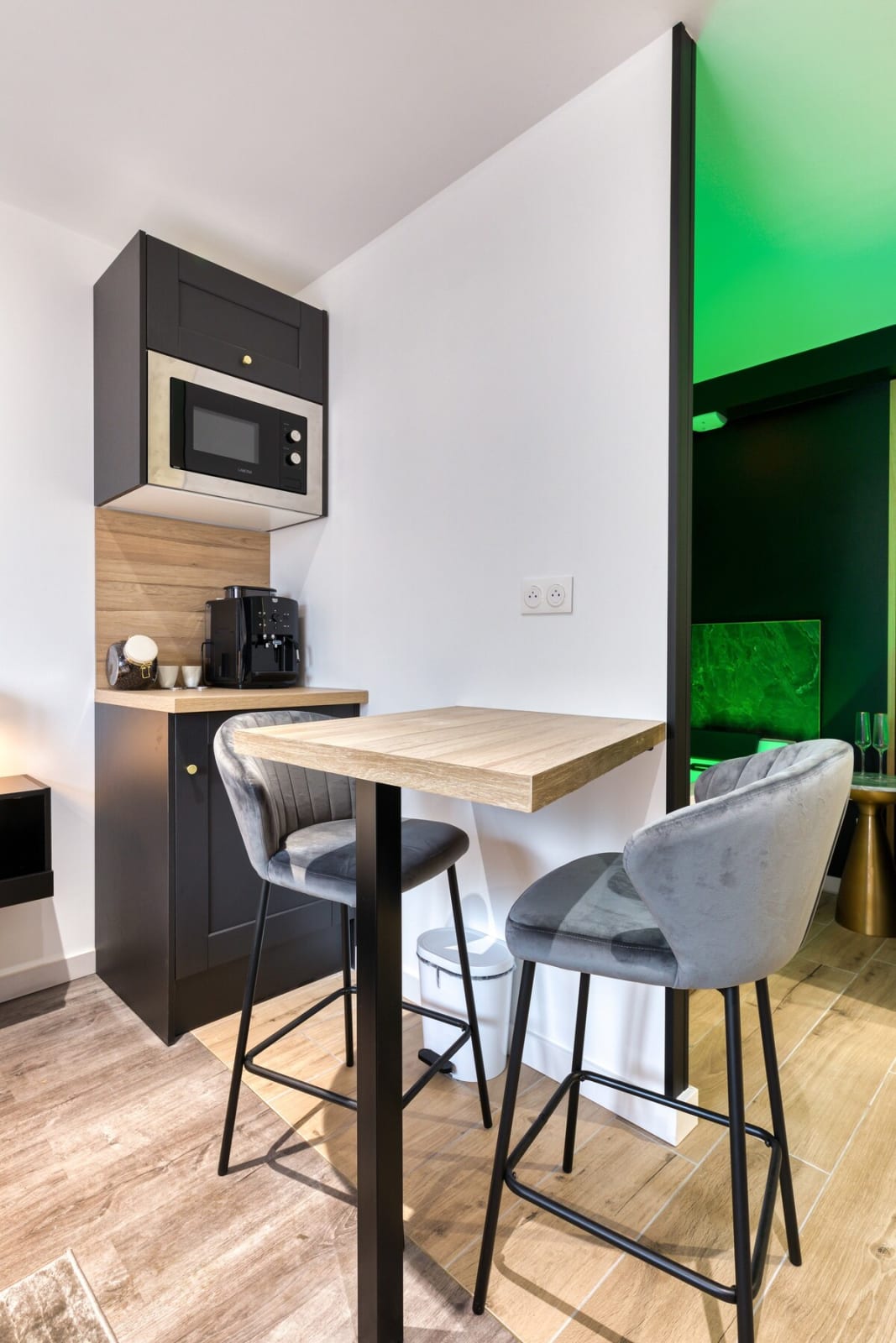 Un espace lumineux avec un lit double (160 x 190 cm) pour des nuits tout en douceur. Un spa jacuzzi pour des instants de détente à deux. Un coin repas équipé (mini-réfrigérateur, cafetière, micro-ondes et nécessaire de cuisine). Une salle d’eau moderne avec douche et WC.