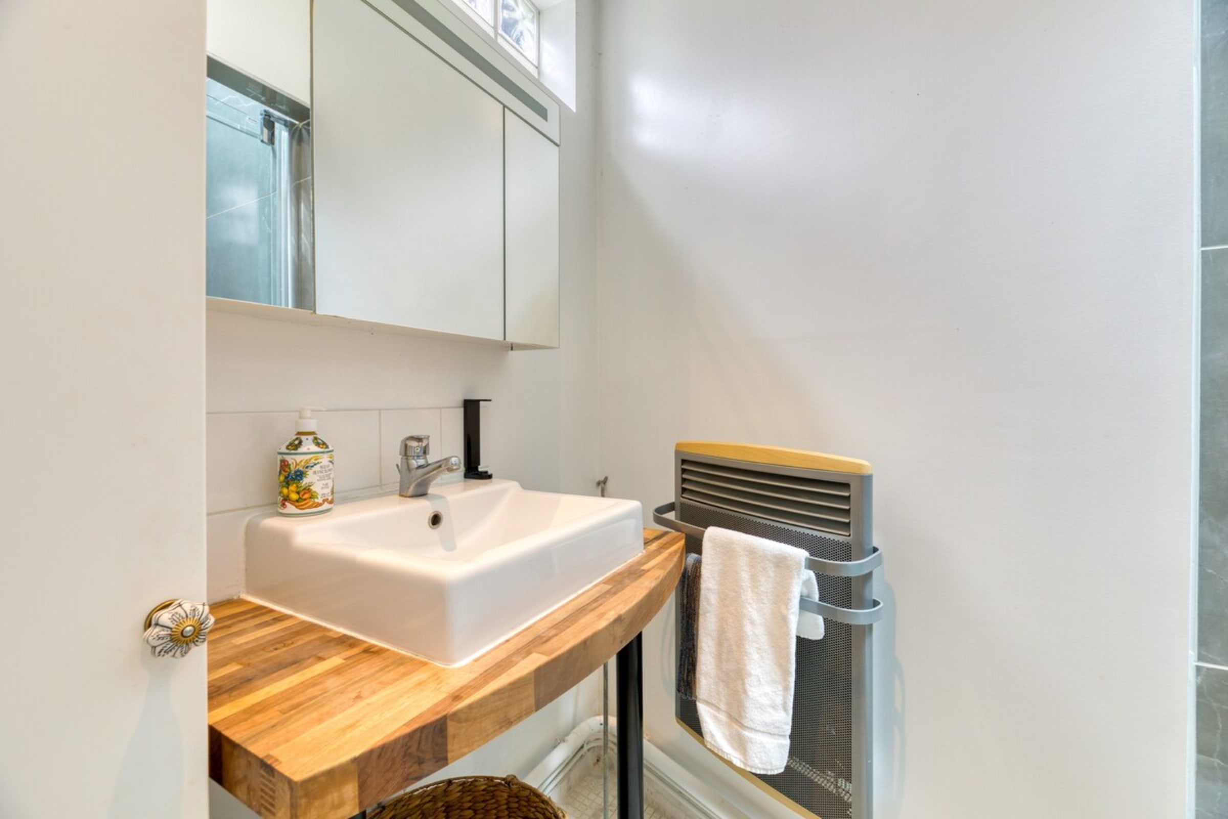 La maison se distingue par son cachet et ses matériaux de qualité : béton ciré, verrière avec vue sur le jardin, cuisine sur mesure, salle de bain en marbre avec mosaïques au sol et parquet d’époque à l’étage.