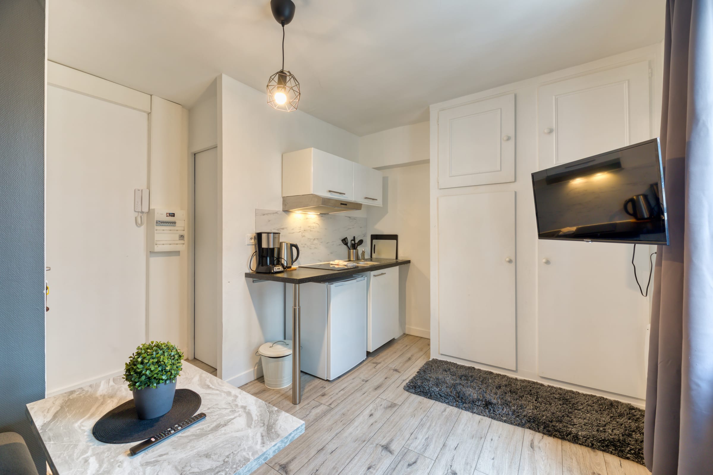 La cuisine ouverte, aménagée et équipée (petit réfrigérateur, micro-ondes avec fonction grill, deux plaques vitrocéramiques, bouilloire, cafetière à filtre et nécessaire de cuisine), s’ouvre sur l’espace salon. Celui-ci offre de grands rangements, un coin canapé et une table basse relevable, transformable en table haute.