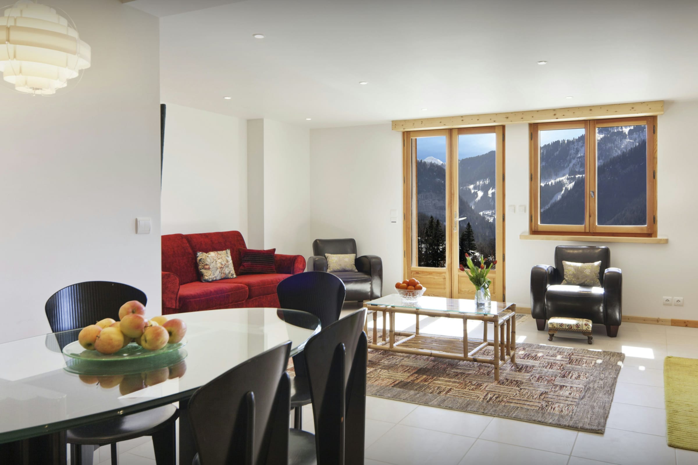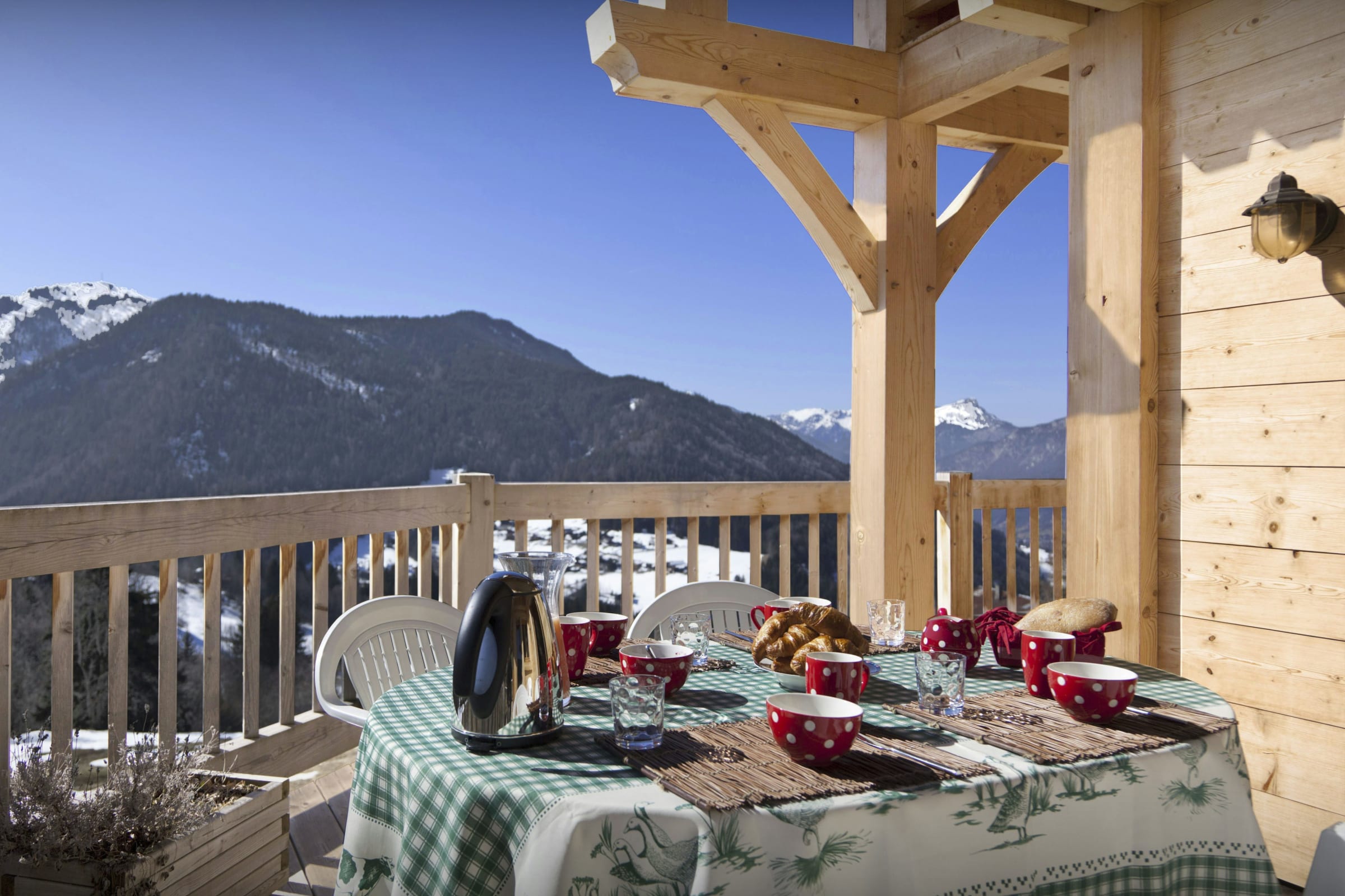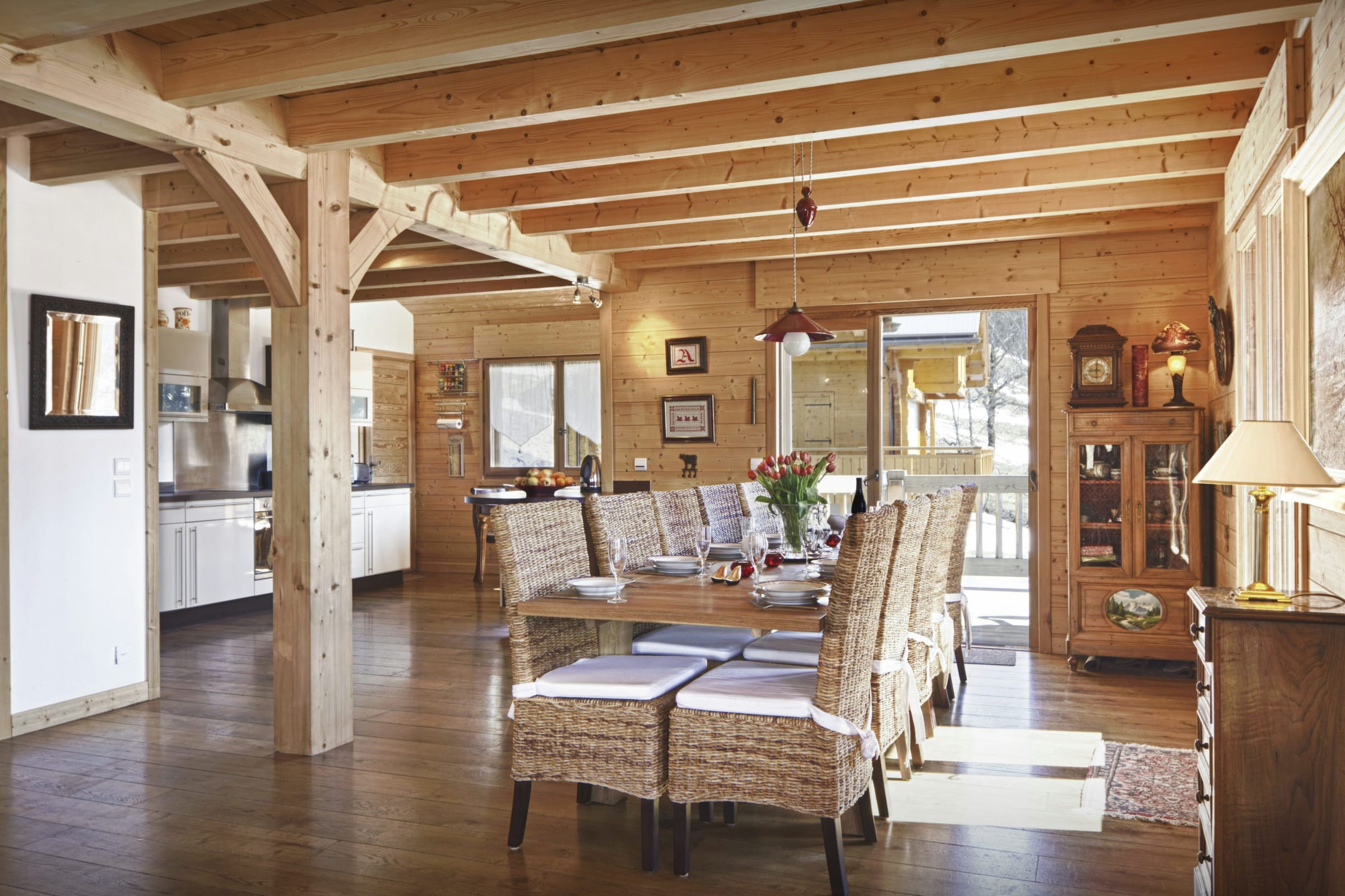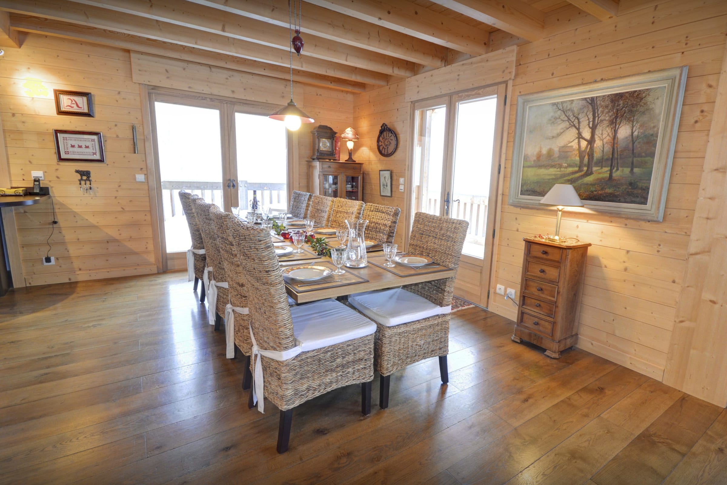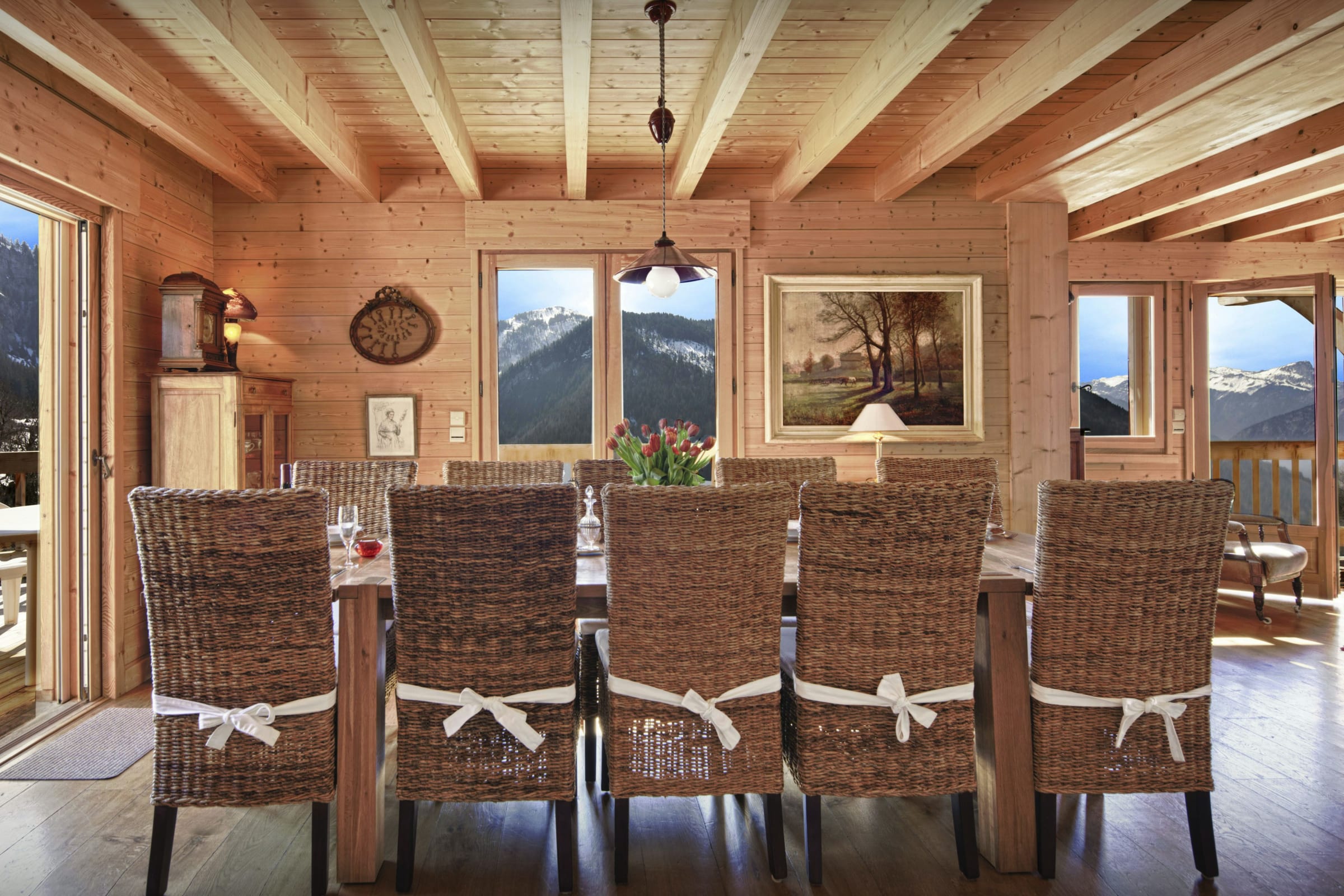 L’espace de vie principal vous permettra de partager les repas en toute convivialité autour de sa grande table, et d’échanger les impressions de la journée autour de sa chaleureuse cheminée. Le chauffage au sol assure en permanence une atmosphère douillette pour le retour des pistes, et par beau temps les portes du patio s’ouvrent sur une vaste terrasse d’où vous pourrez admirer le coucher du soleil sur les montagnes en dégustant un bon verre de vin du pays.