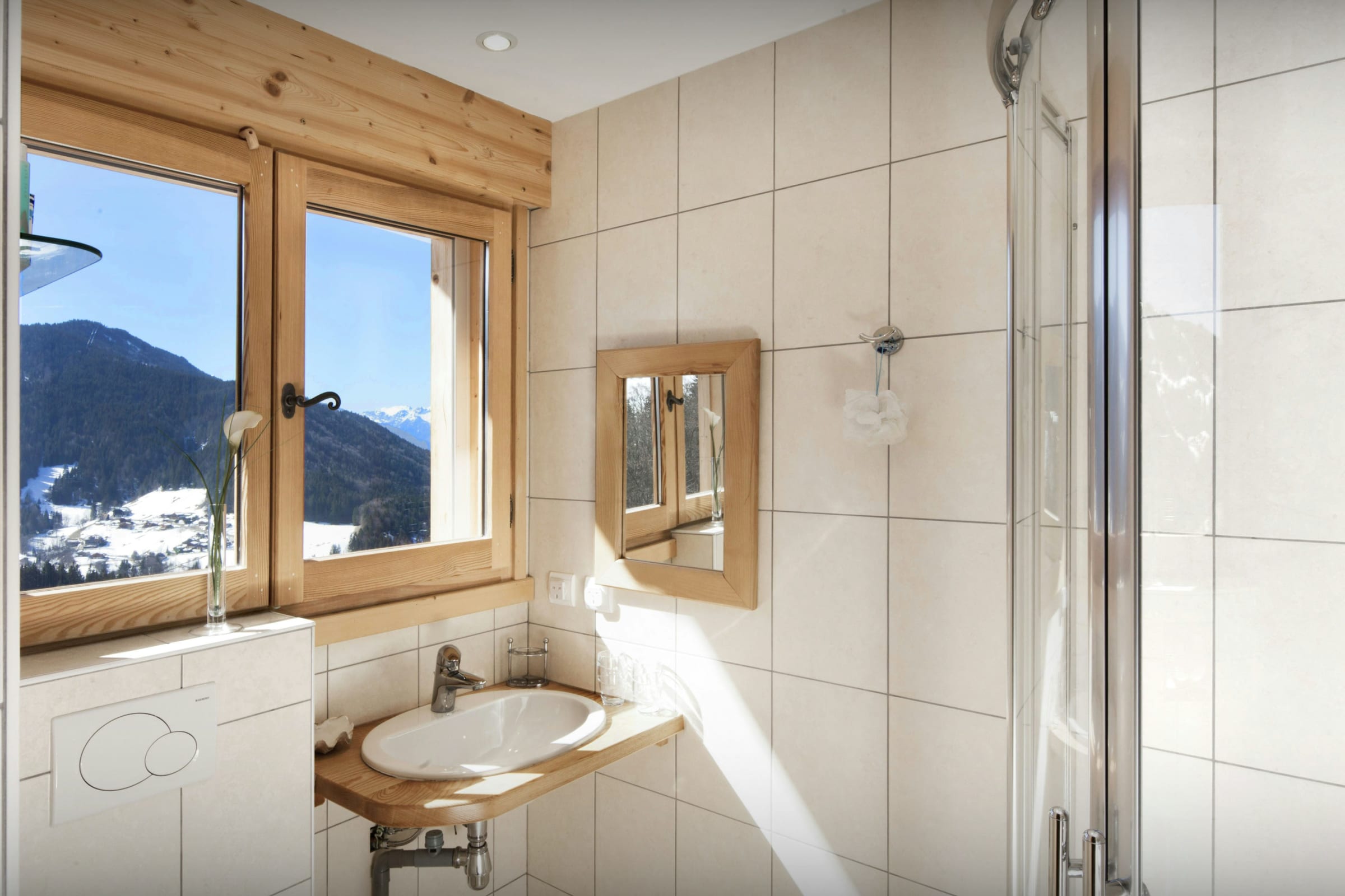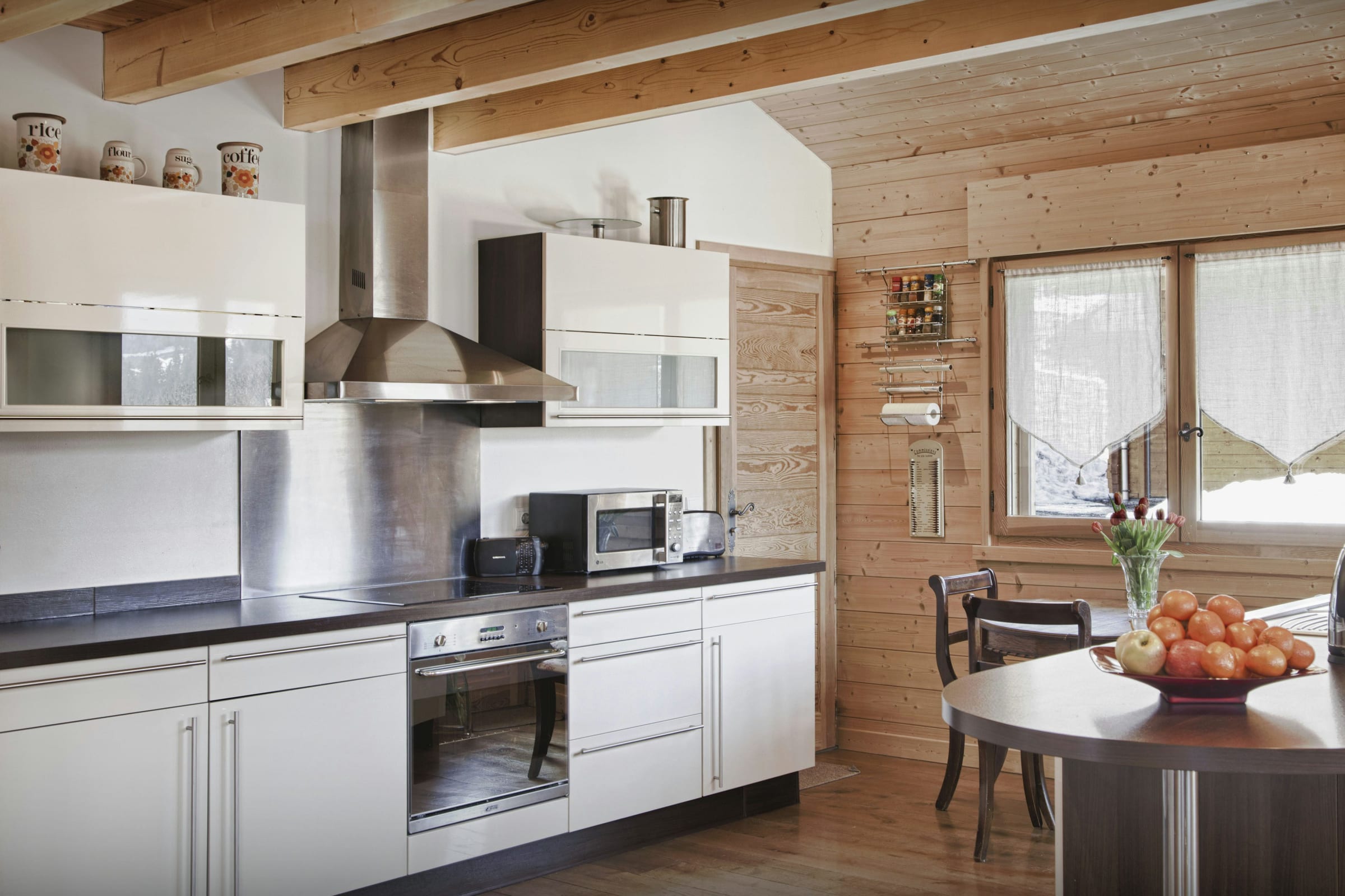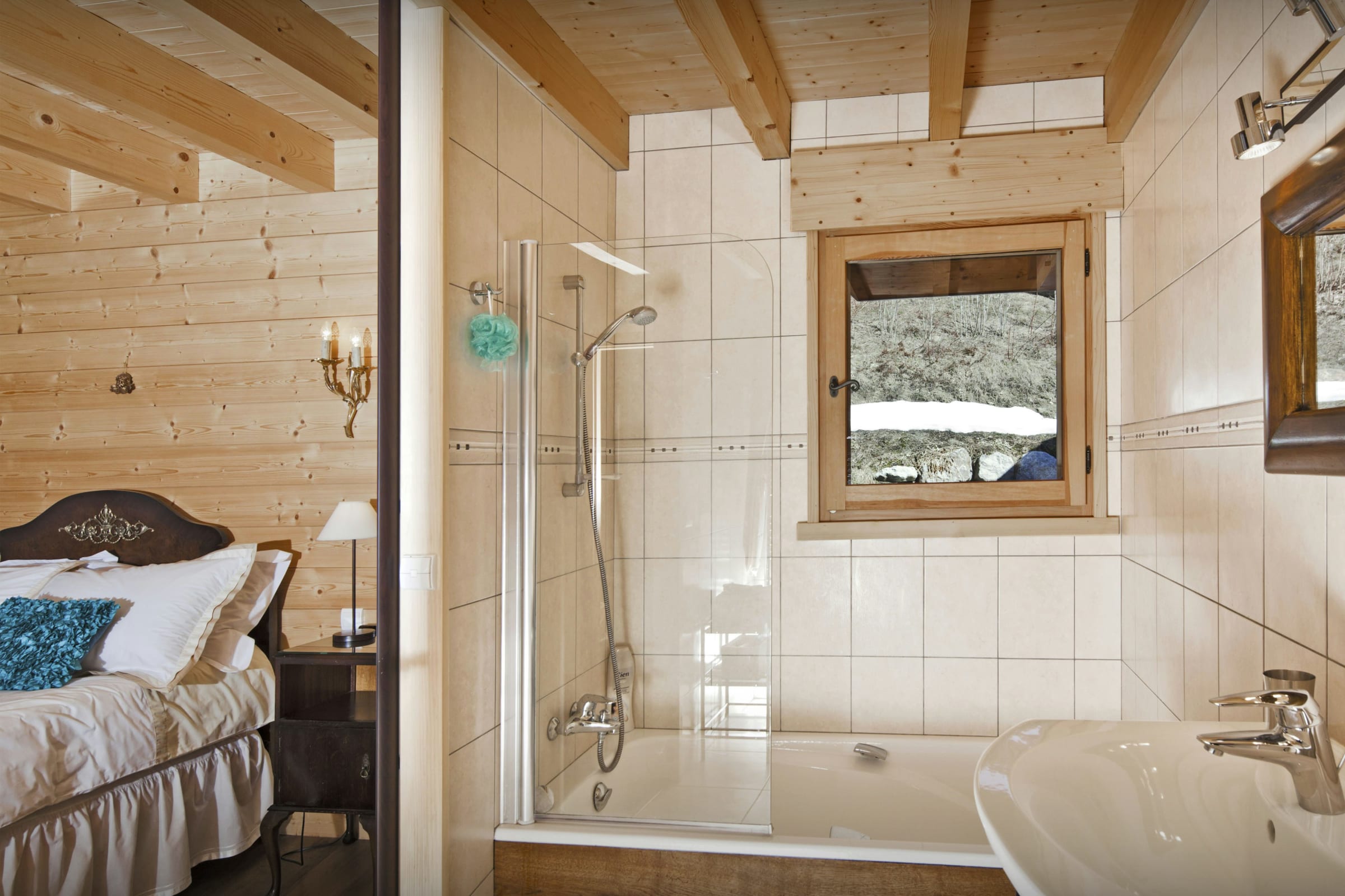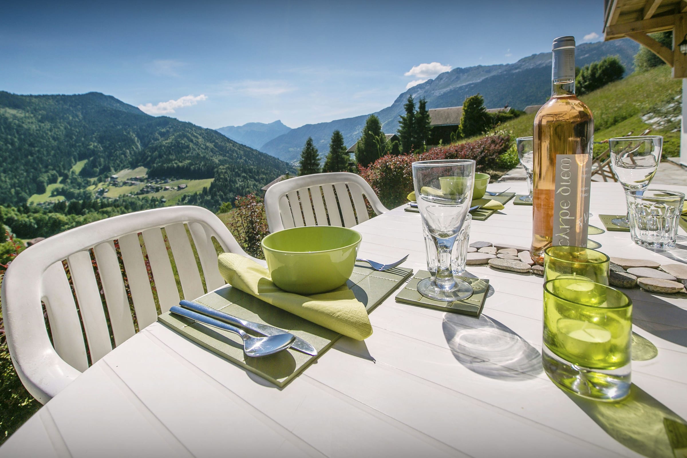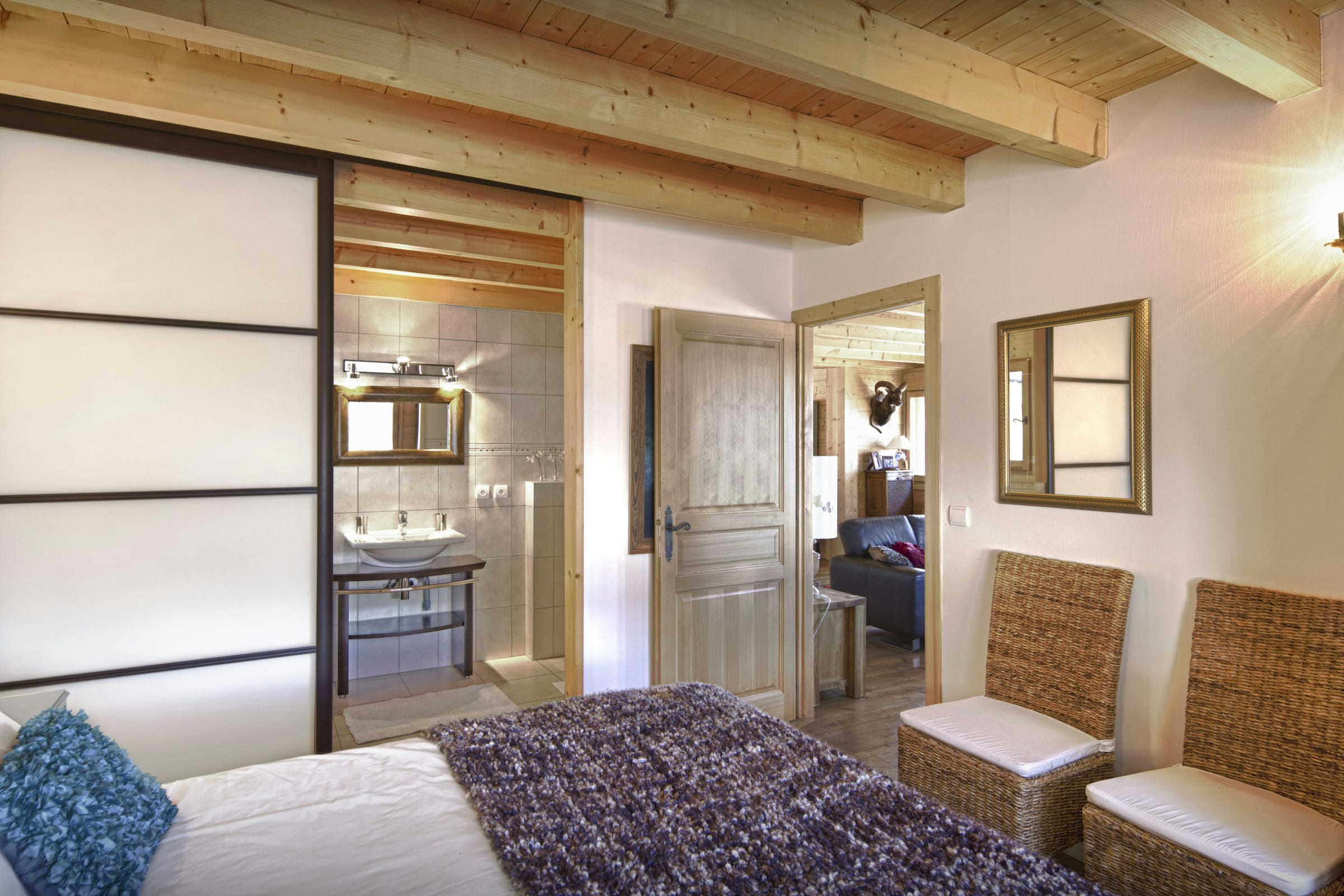 L’espace de vie principal vous permettra de partager les repas en toute convivialité autour de sa grande table, et d’échanger les impressions de la journée autour de sa chaleureuse cheminée. Le chauffage au sol assure en permanence une atmosphère douillette pour le retour des pistes, et par beau temps les portes du patio s’ouvrent sur une vaste terrasse d’où vous pourrez admirer le coucher du soleil sur les montagnes en dégustant un bon verre de vin du pays.