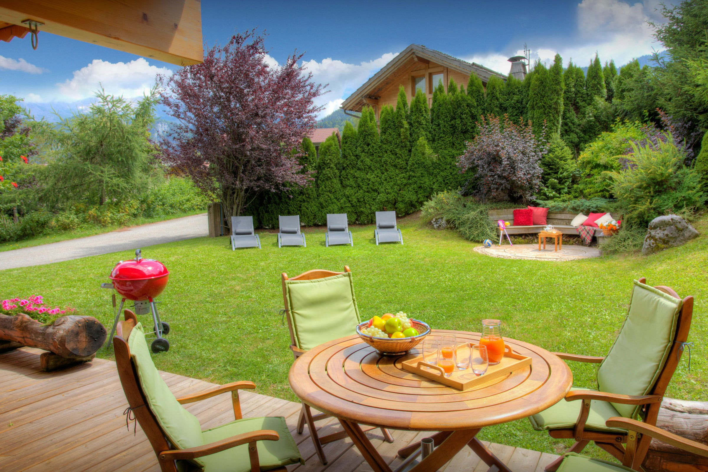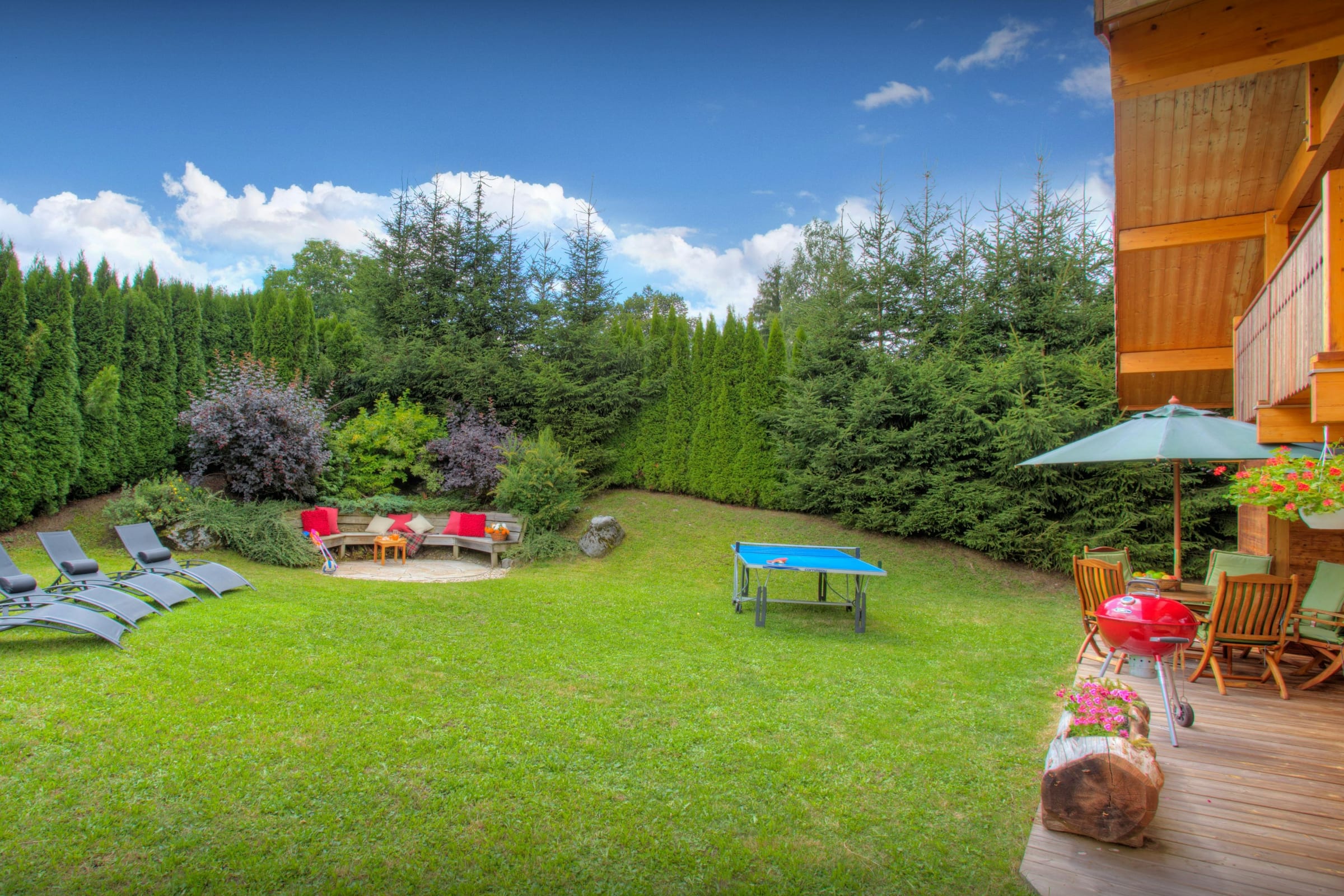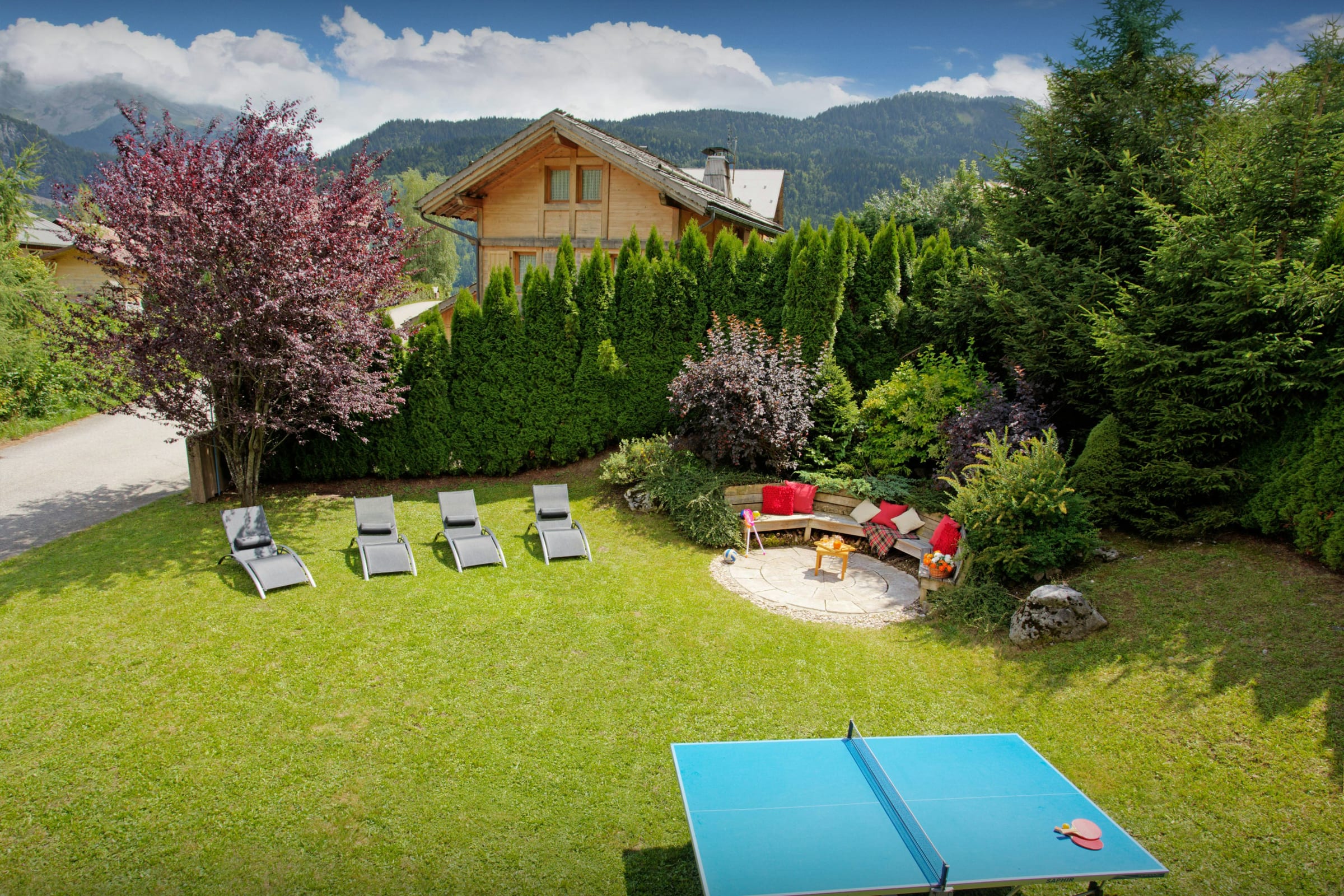Eté comme hiver, vous apprécierez le grand jardin et son joli banc circulaire en pierre, la table à manger, les transats et la table de ping pong. Eloigné de la route principale, le jardin s’ouvre uniquement sur le chemin qui donne accès à la petite copropriété de 5 chalets.