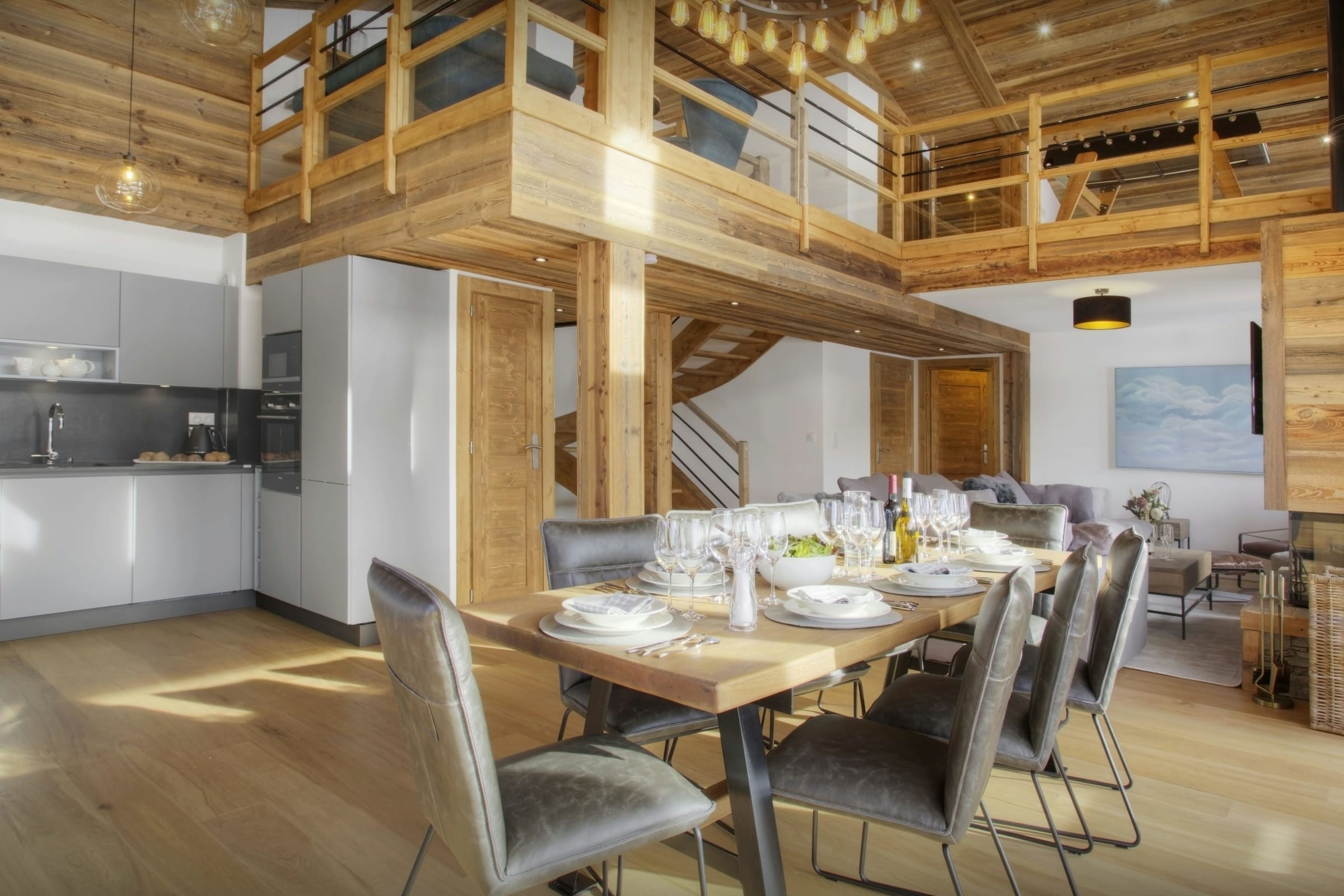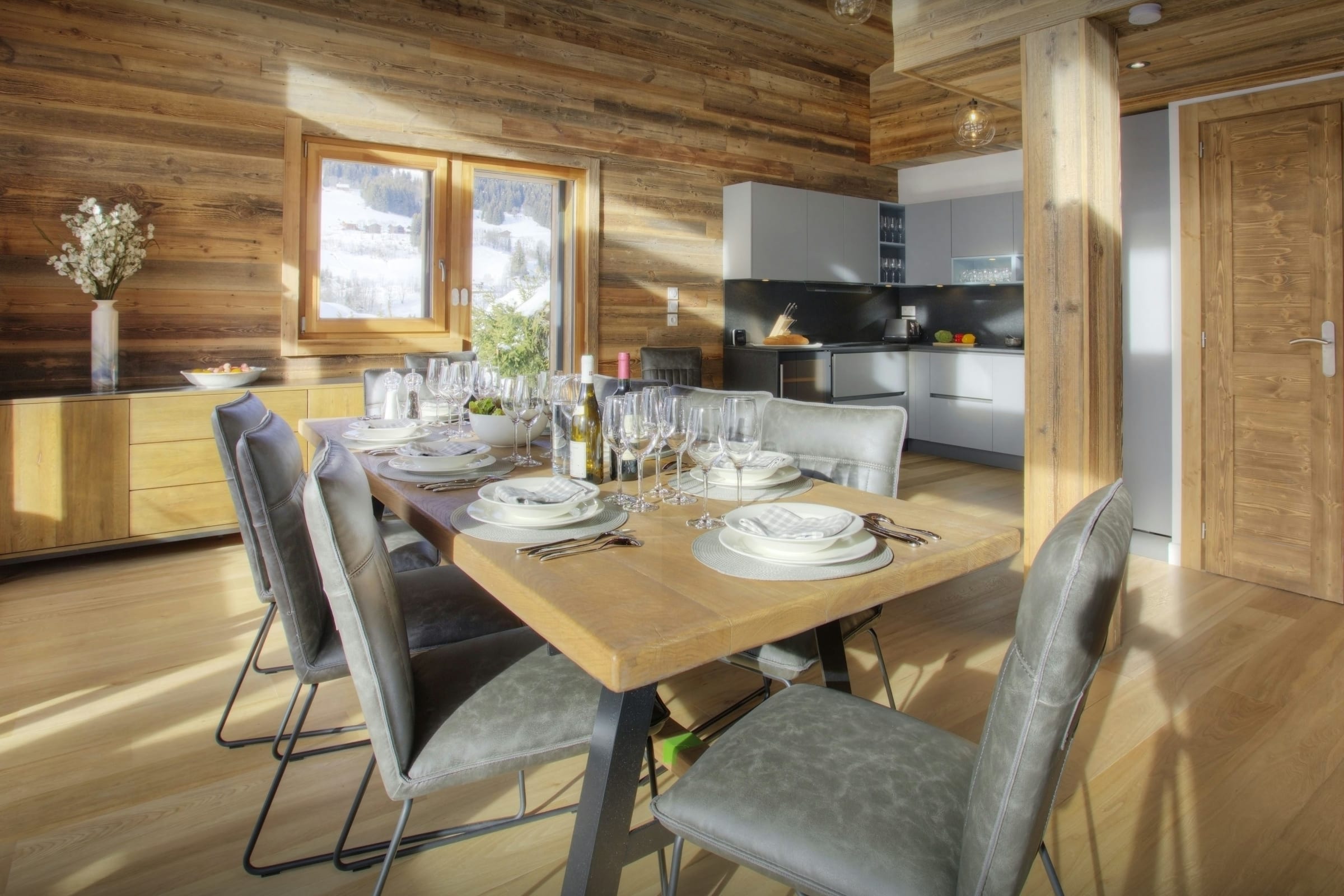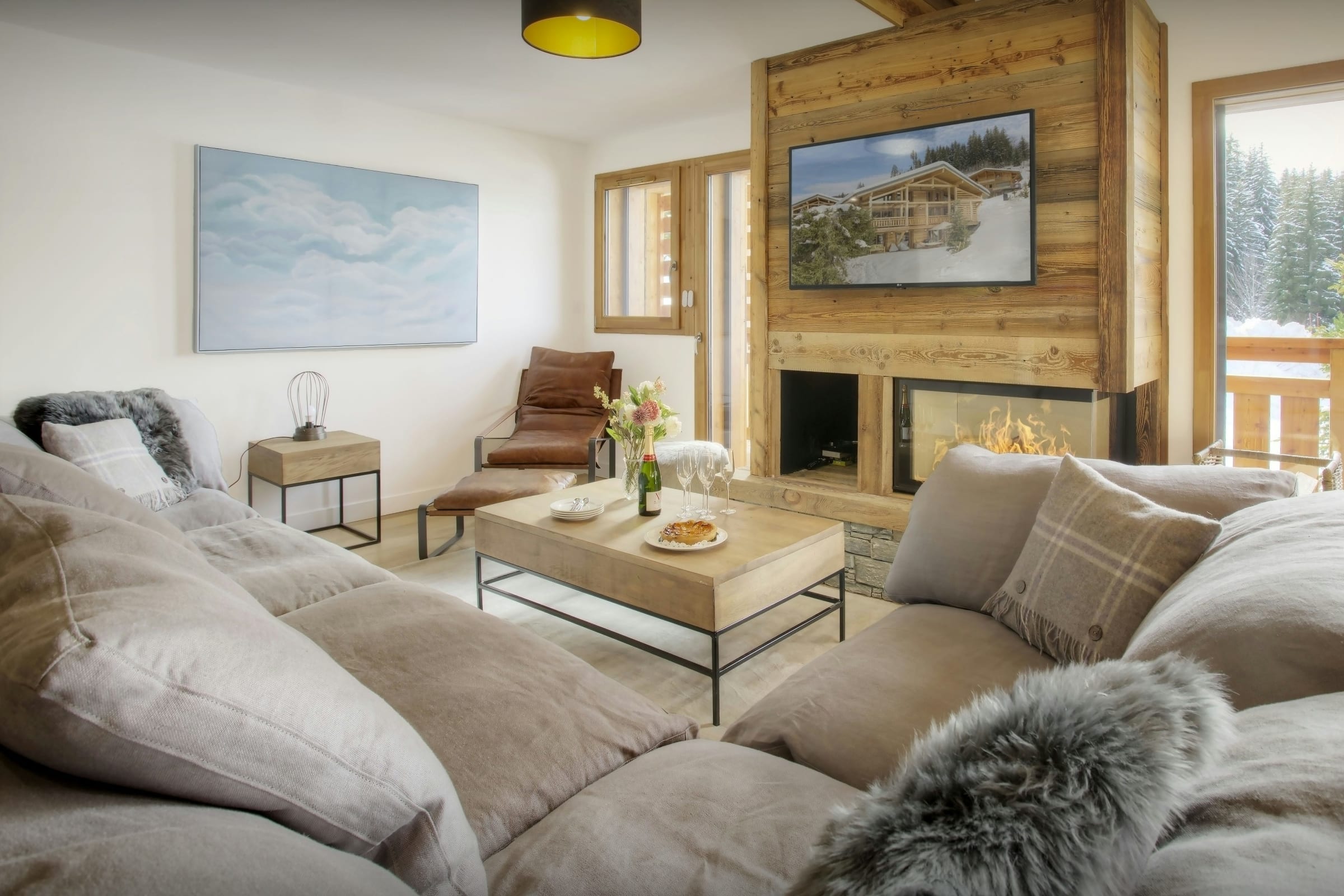 La décoration et le beau mobilier sont en harmonie et créent une ambiance montagnarde chaleureuse et décontractée. La palette de couleurs invite au repos et à la relaxation. Des canapés moelleux et confortables sont disposés autour de la cheminée et de grandes baies vitrées offrent une vue fantastique sur le mont Chéry. Vous aurez envie de passer du temps dans cette pièce agréable.
