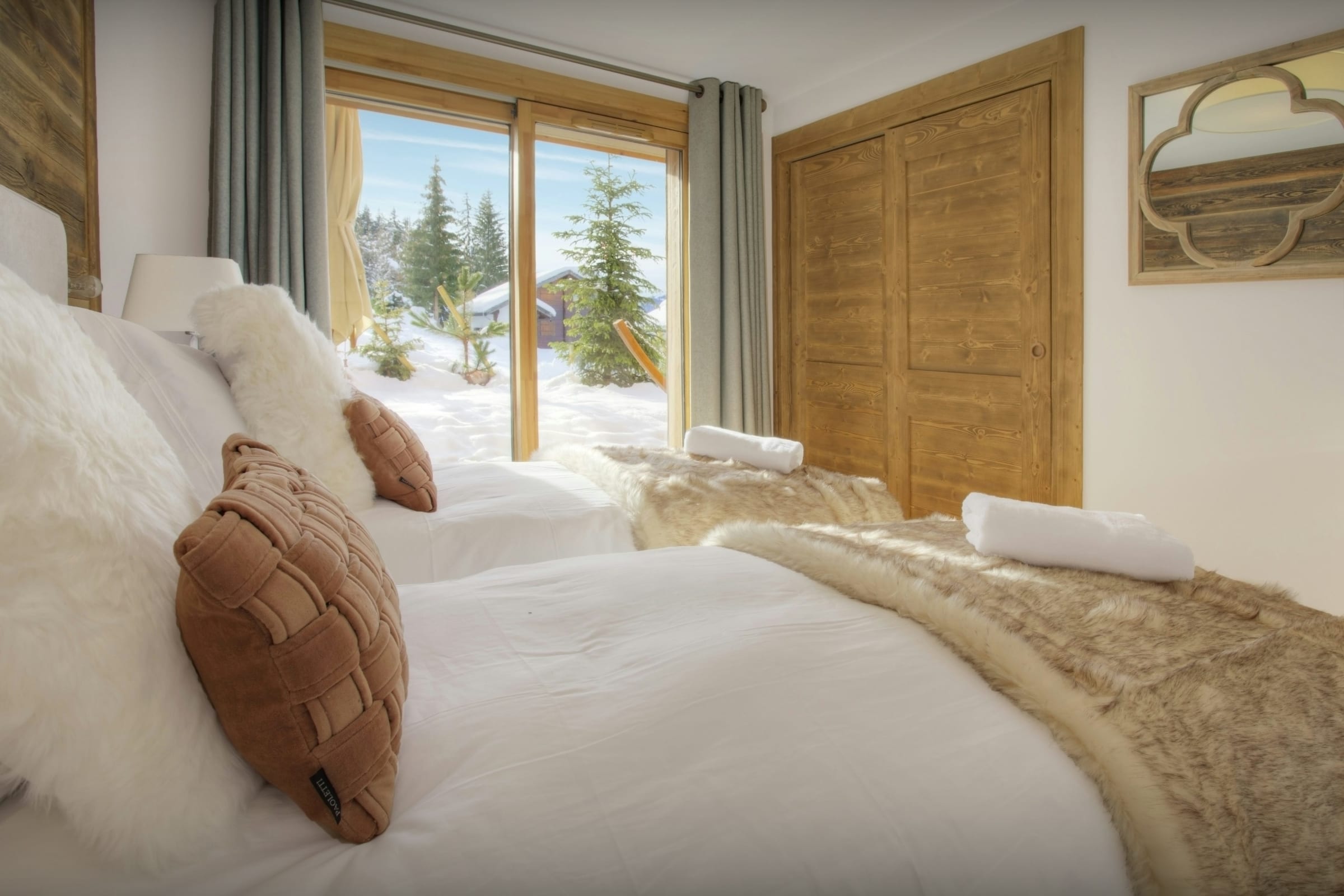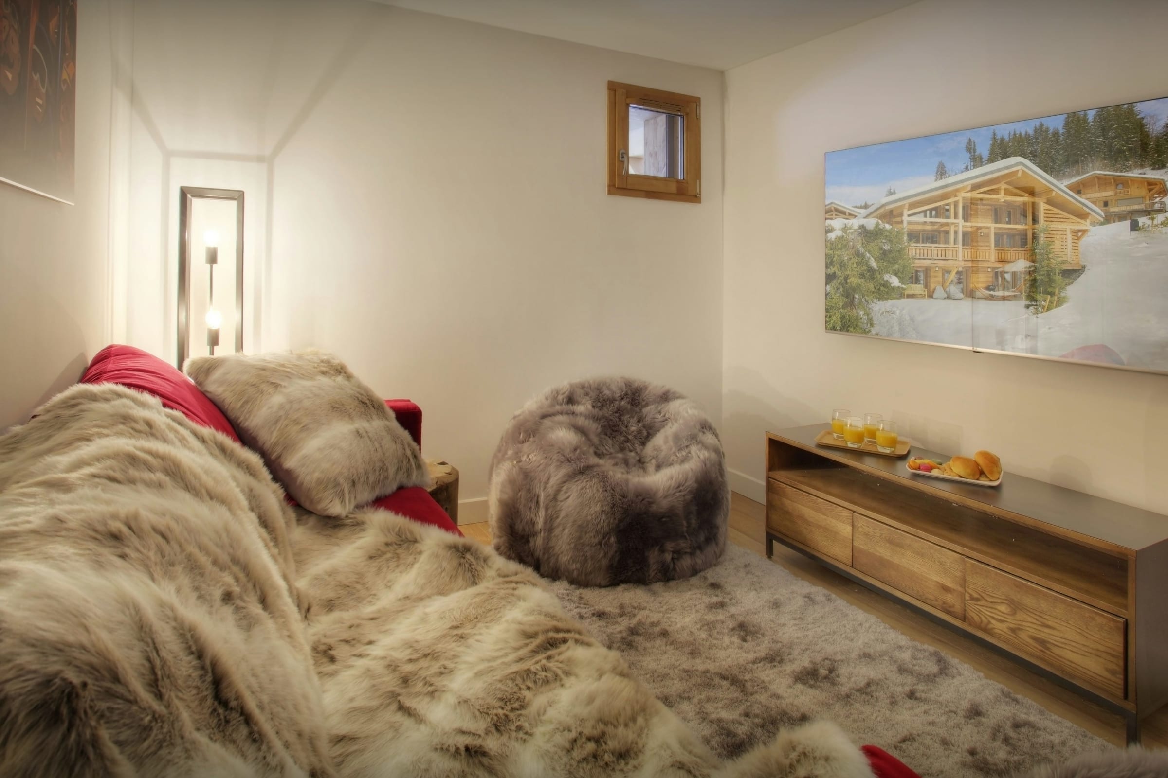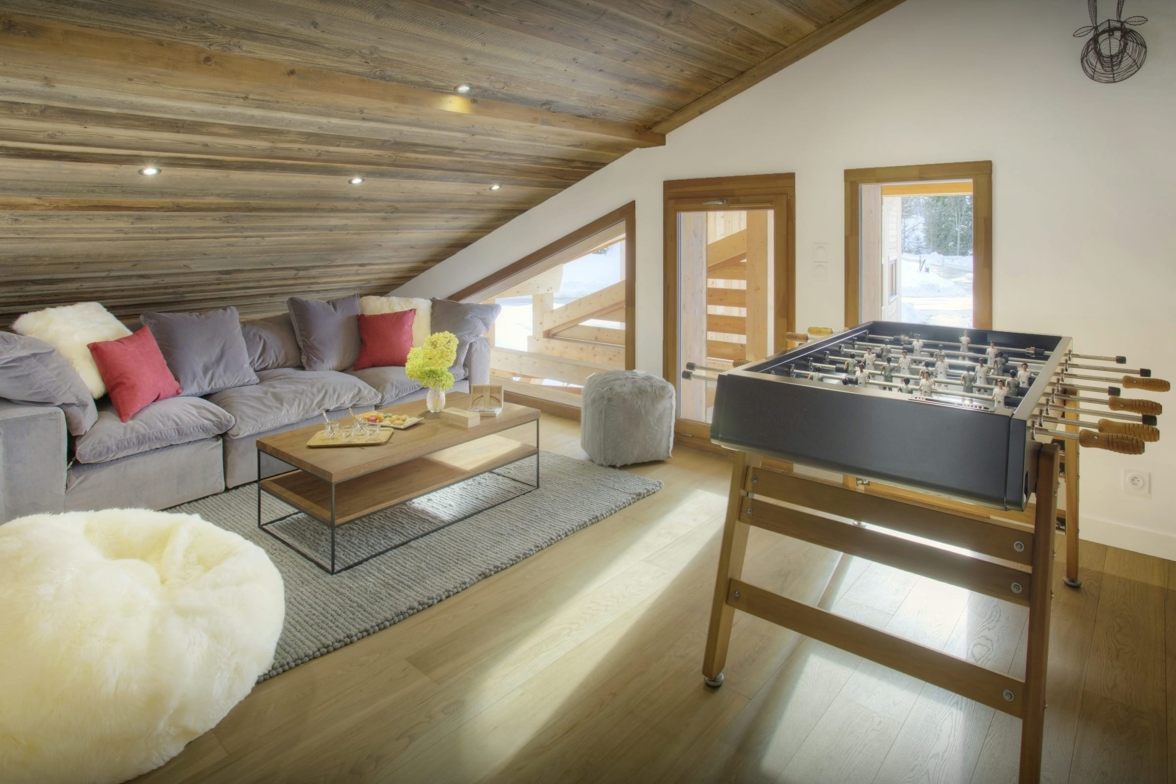 La décoration et le beau mobilier sont en harmonie et créent une ambiance montagnarde chaleureuse et décontractée. La palette de couleurs invite au repos et à la relaxation. Des canapés moelleux et confortables sont disposés autour de la cheminée et de grandes baies vitrées offrent une vue fantastique sur le mont Chéry. Vous aurez envie de passer du temps dans cette pièce agréable.