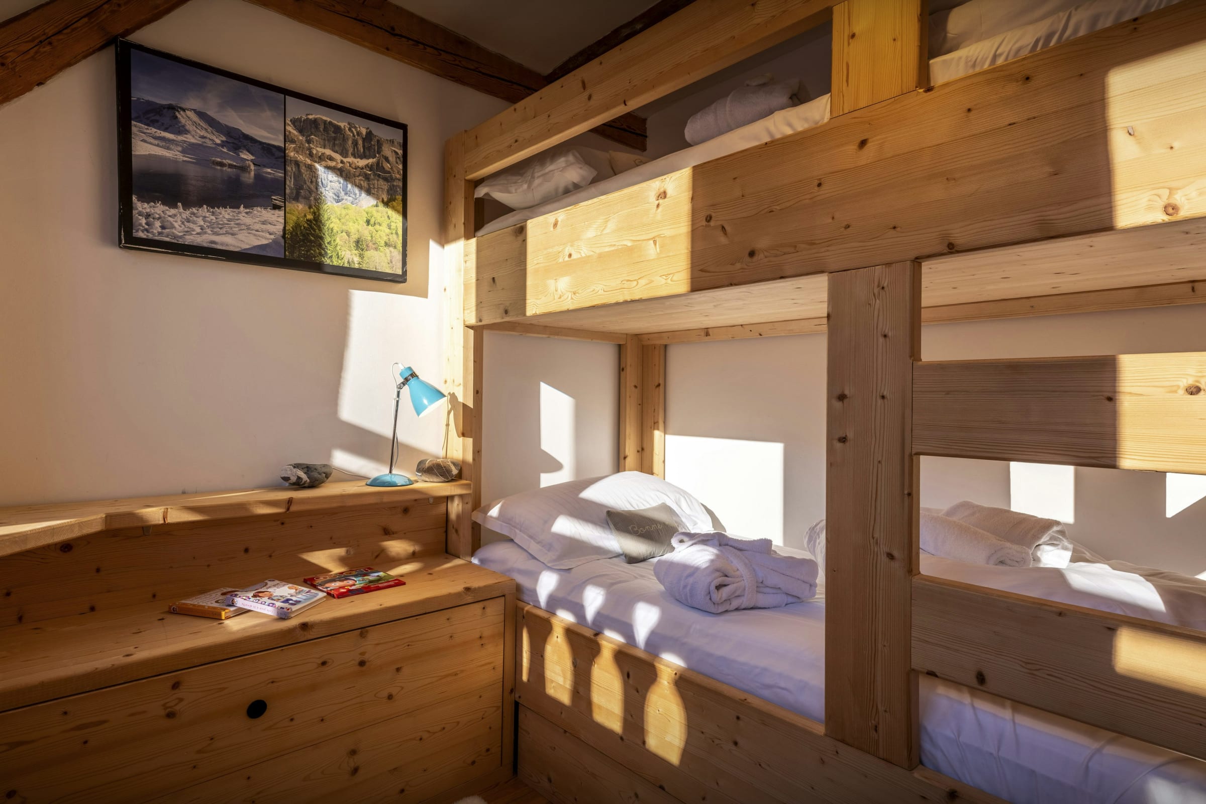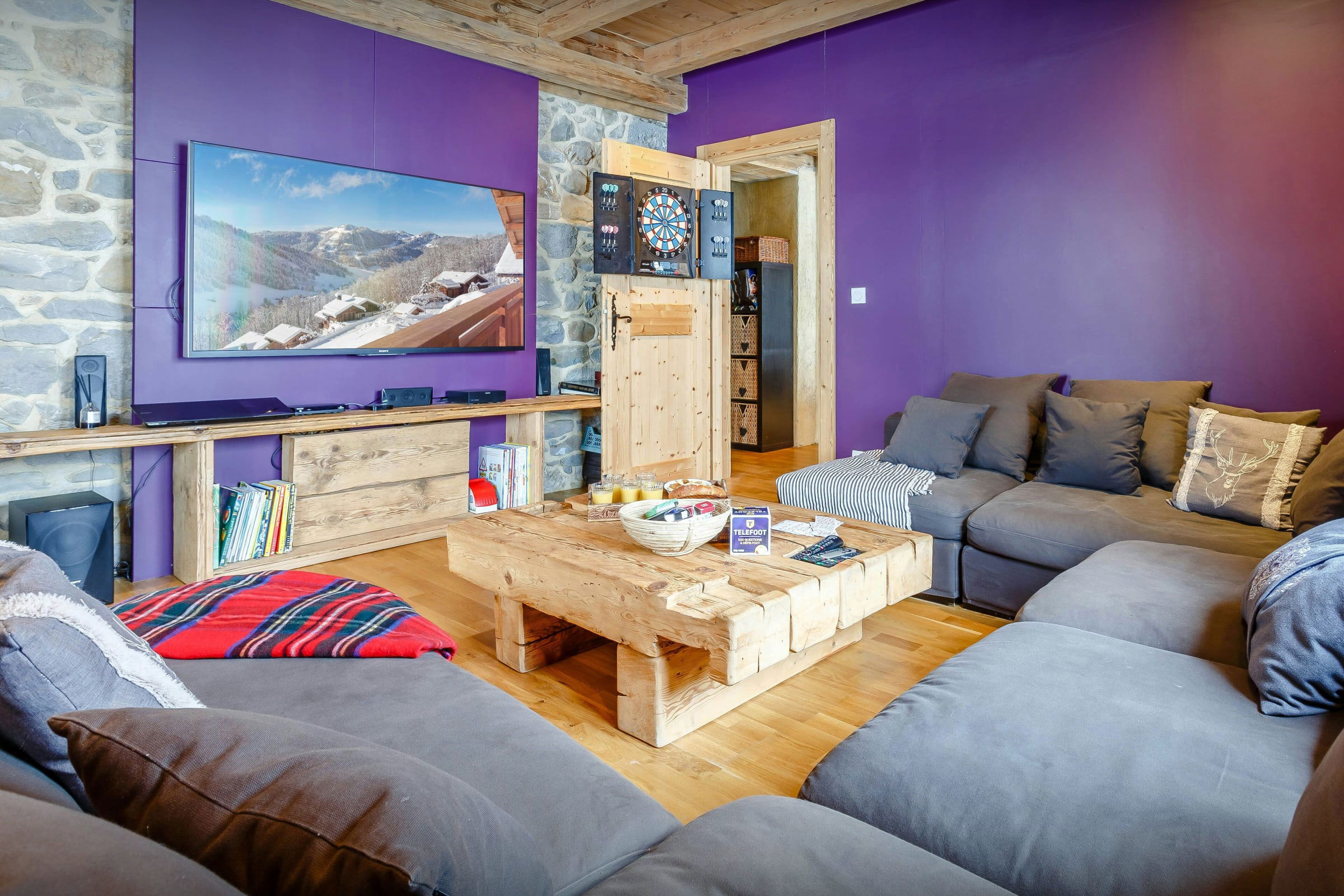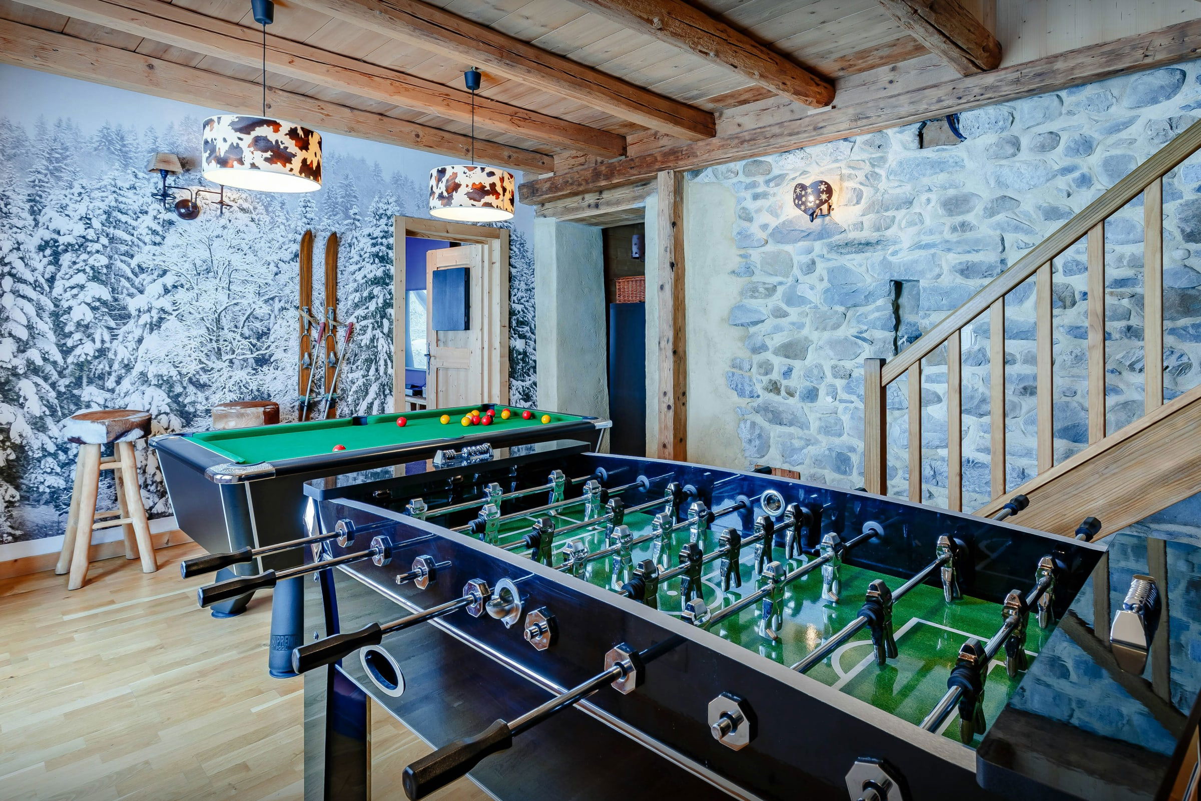 C’est un lieu d’évasion parfait pour plusieurs groupes familiaux ou pour une réunion de famille. En effet, plusieurs chambres sont agencées en suites familiales, et équipées de leur salle de bain privative. Les enfants et adolescents seront aux anges. Trois espaces de télévision et une salle de jeux équipée existent dans ce chalet.