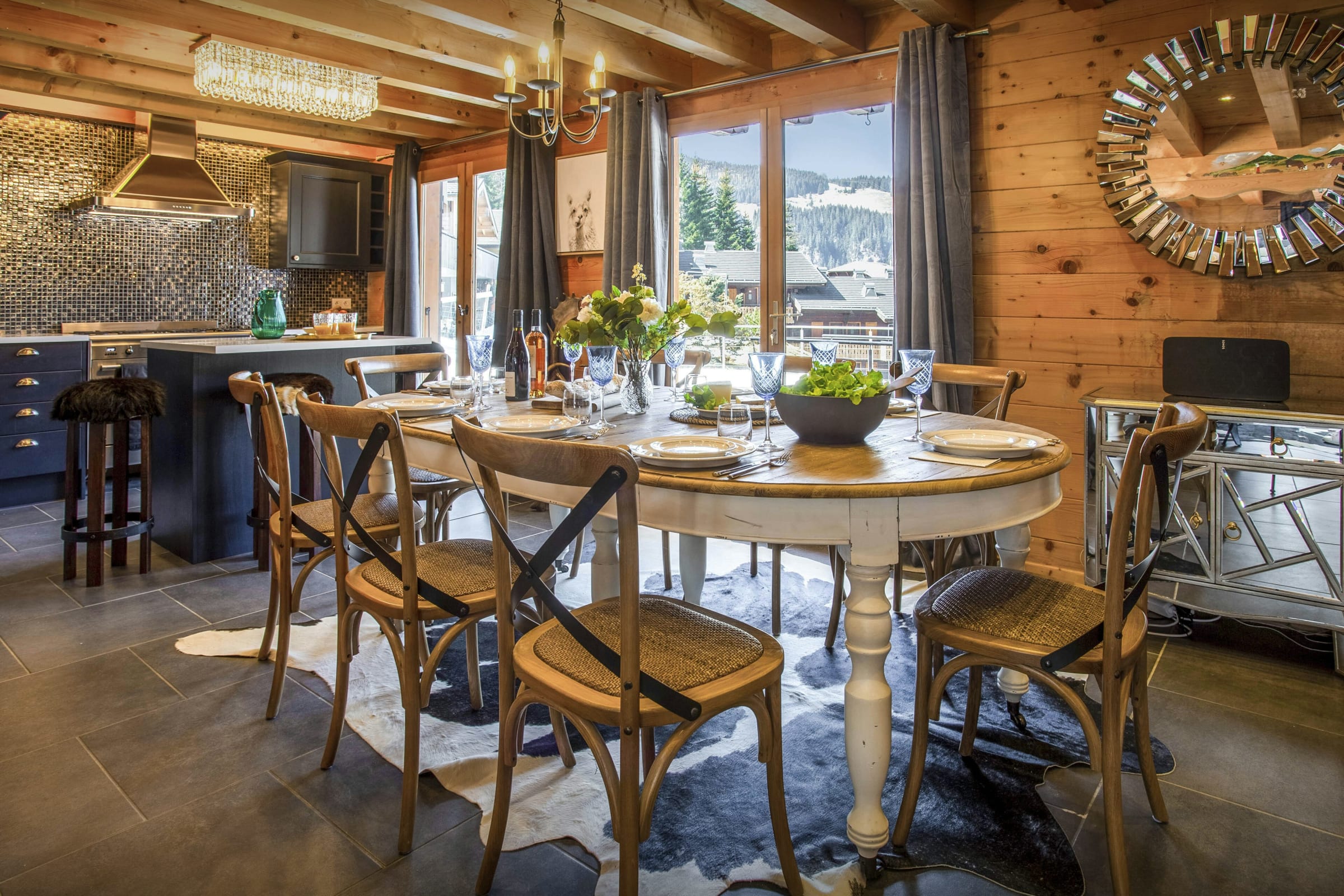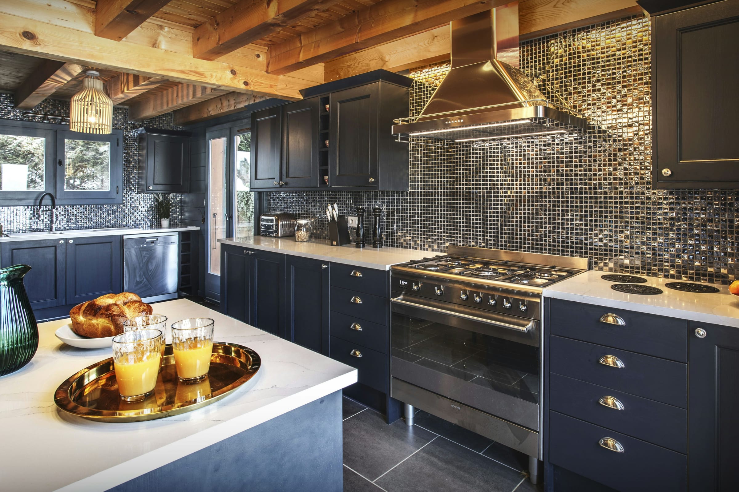 Nous aimons l’élégante cuisine qui contient tout le nécessaire pour jouer les cordons bleus et nourrir toute votre tribu. Elle donne aussi sur le balcon et grâce à ses portes, vous pourrez laisser l’air pur des montagnes nourrir votre inspiration de chef.