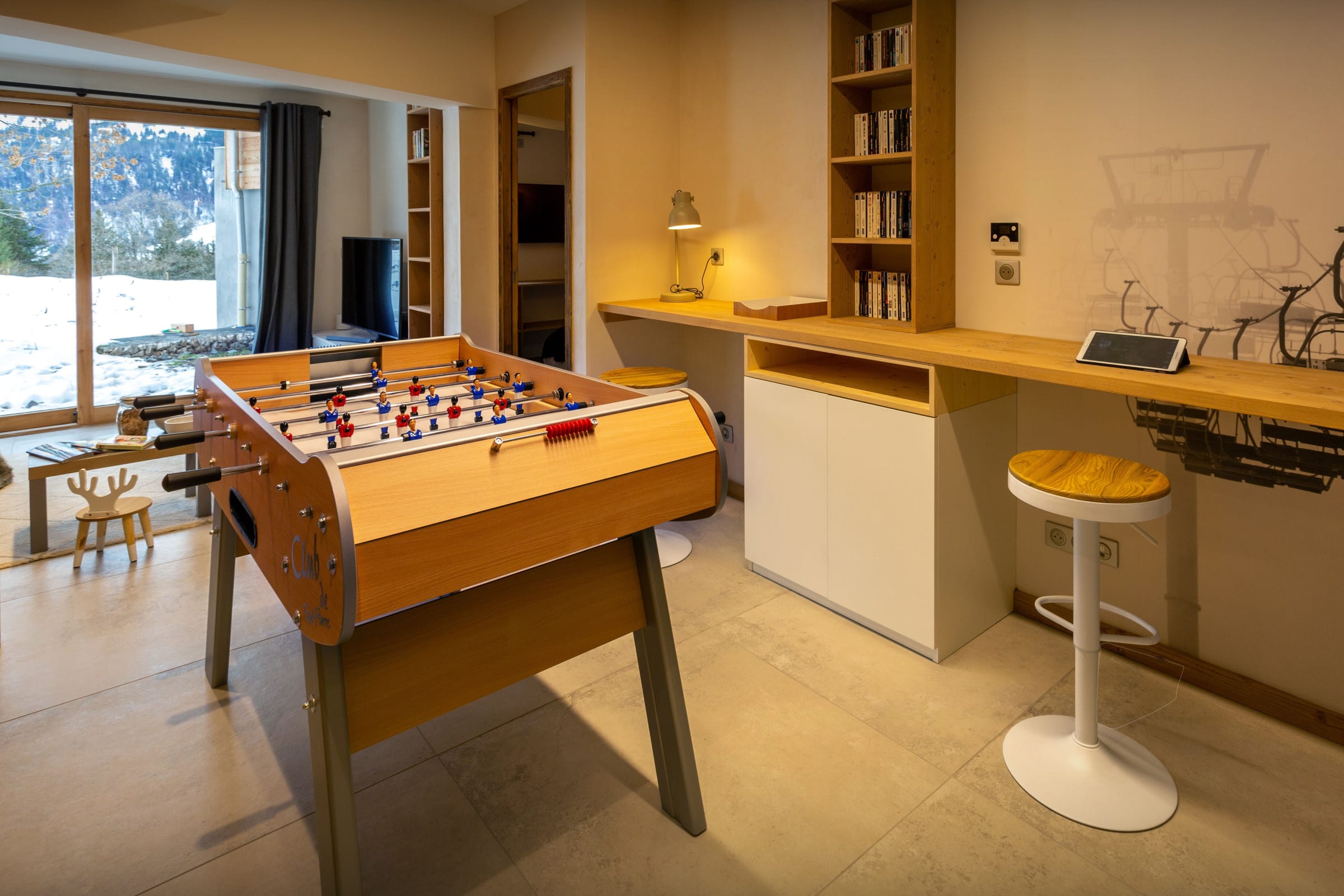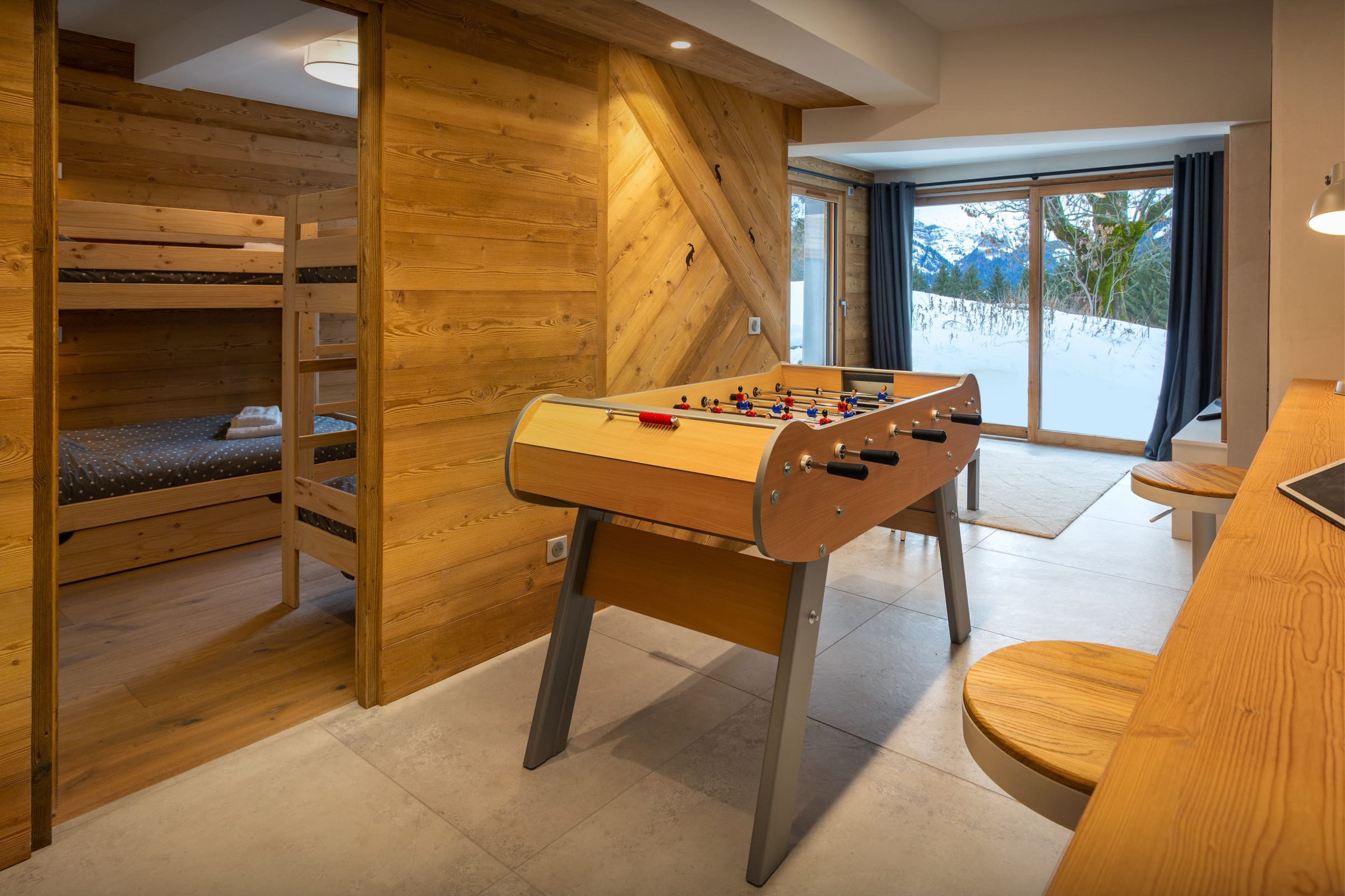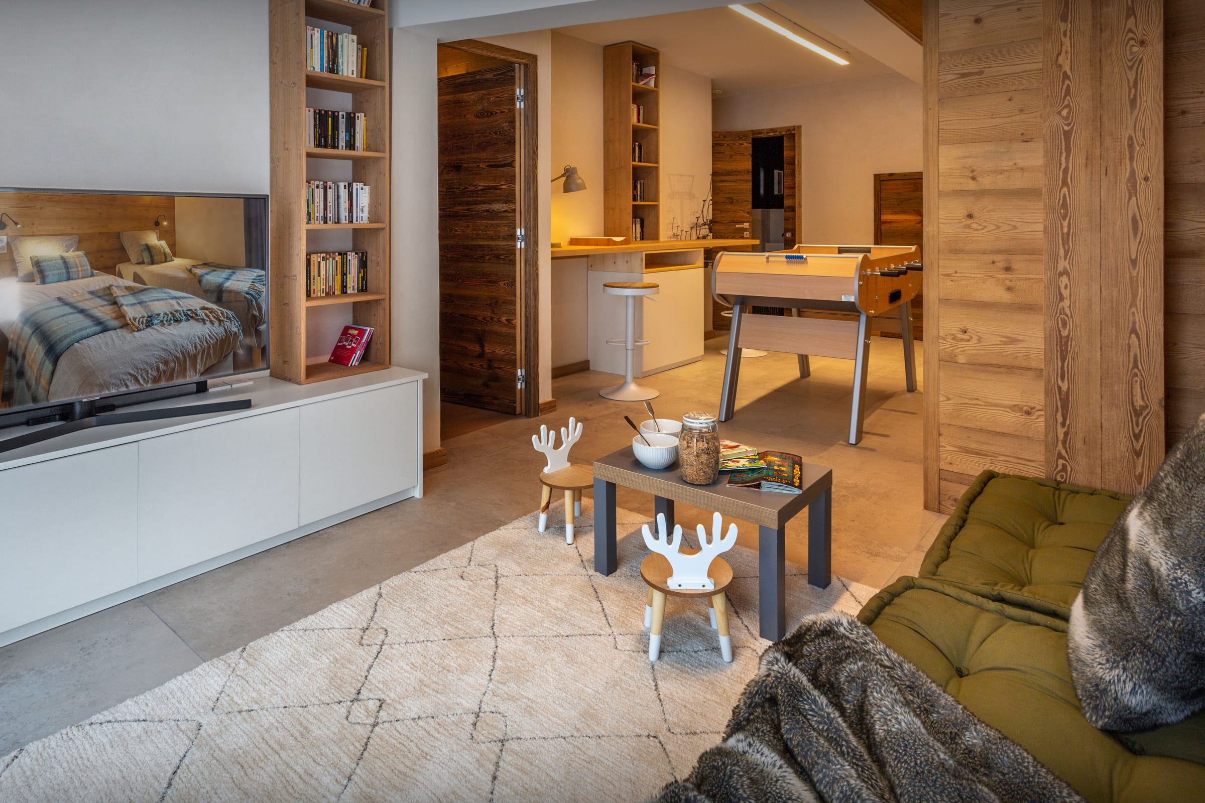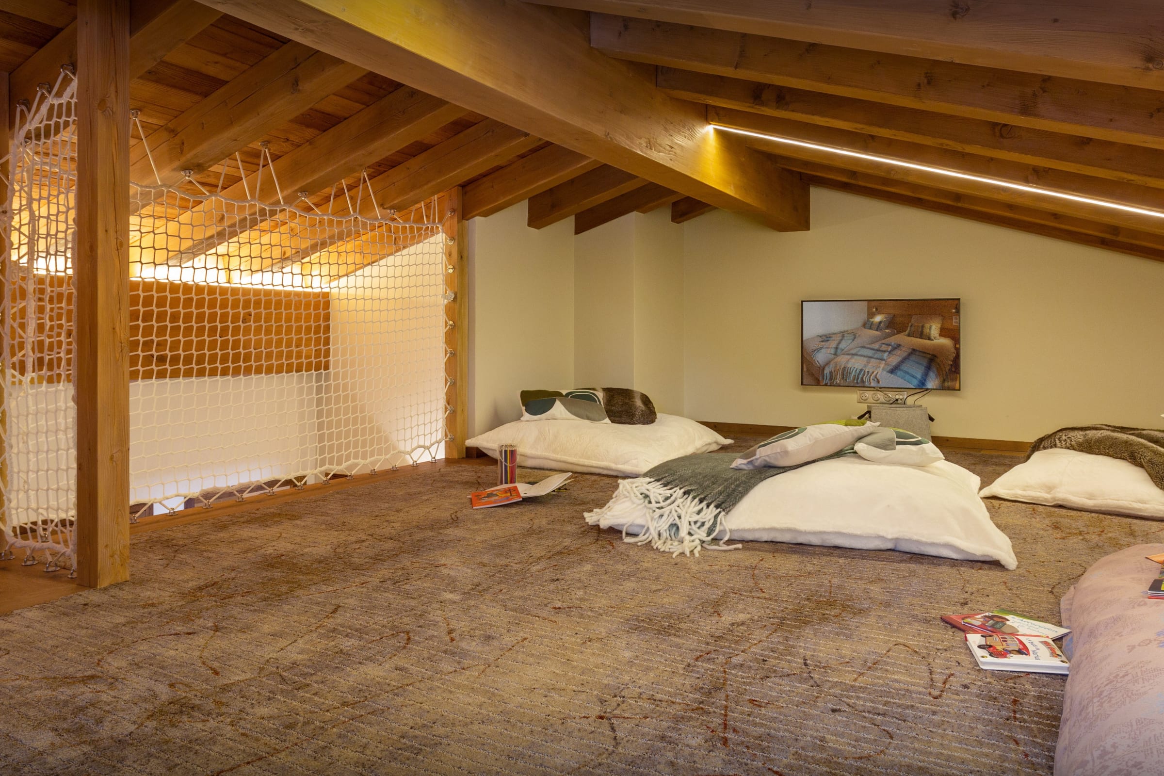 L’une des salles de jeux est au rez-de-chaussée et inclut une télévision et un accès au jardin. Dans les combles, un deuxième espace pour enfants comprend des coussins de sol, une autre télévision et un filet de jeux. Ils pourront ensuite se partager un dortoir avec quatre lits superposés, situé à côté d’une jolie salle de bains.
