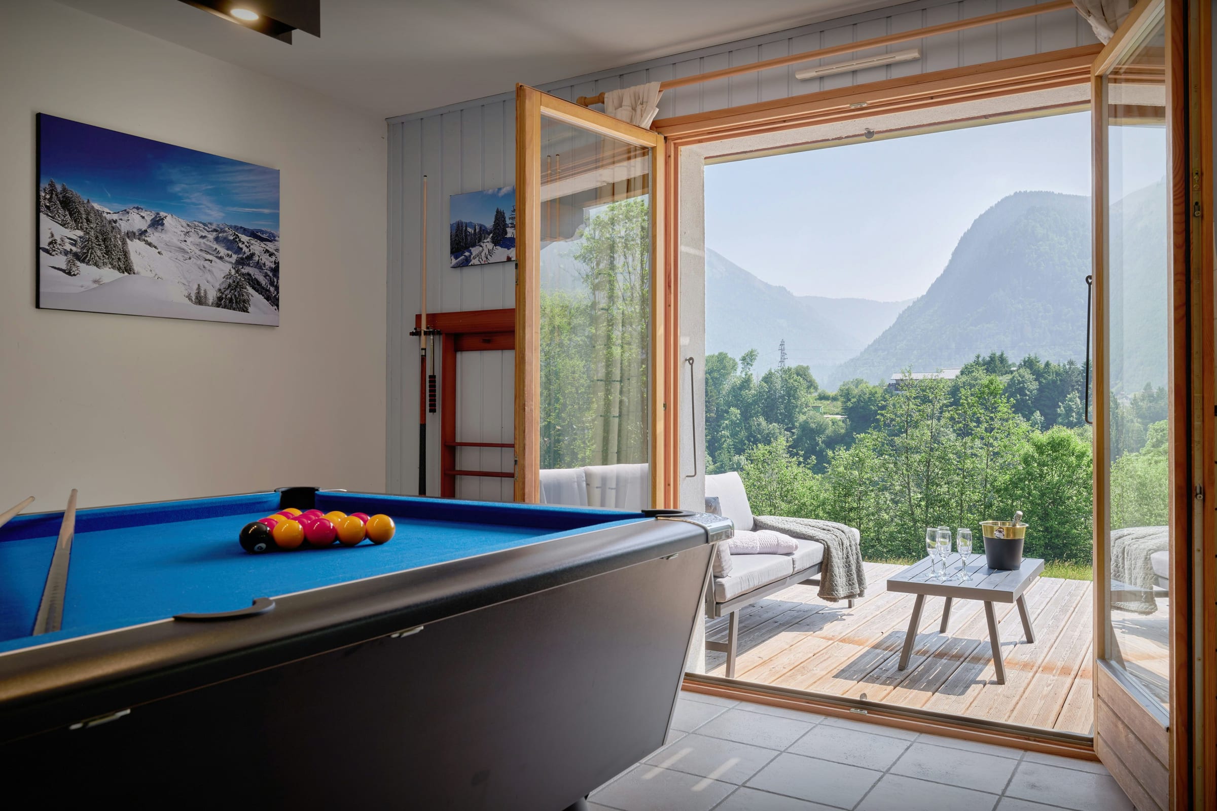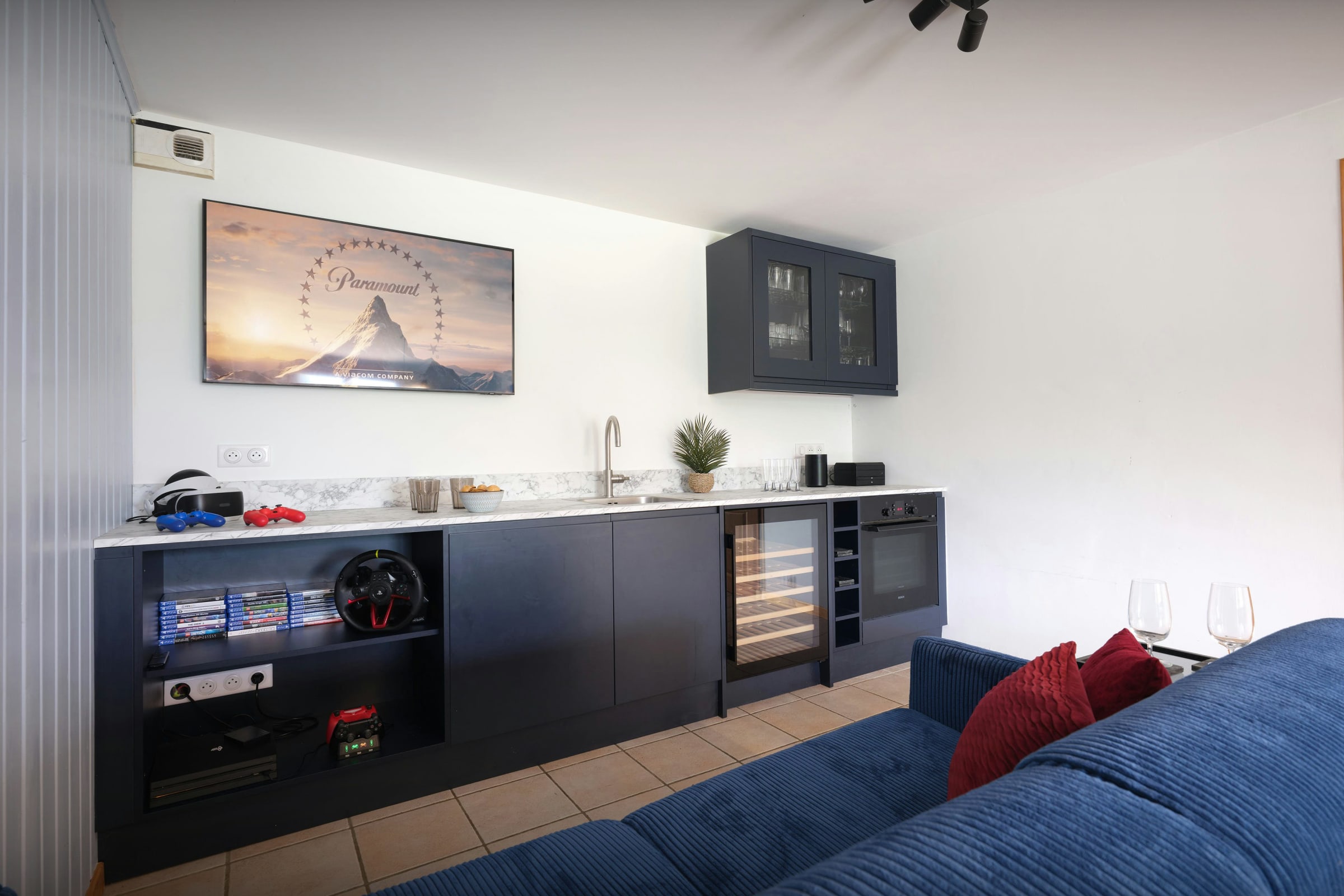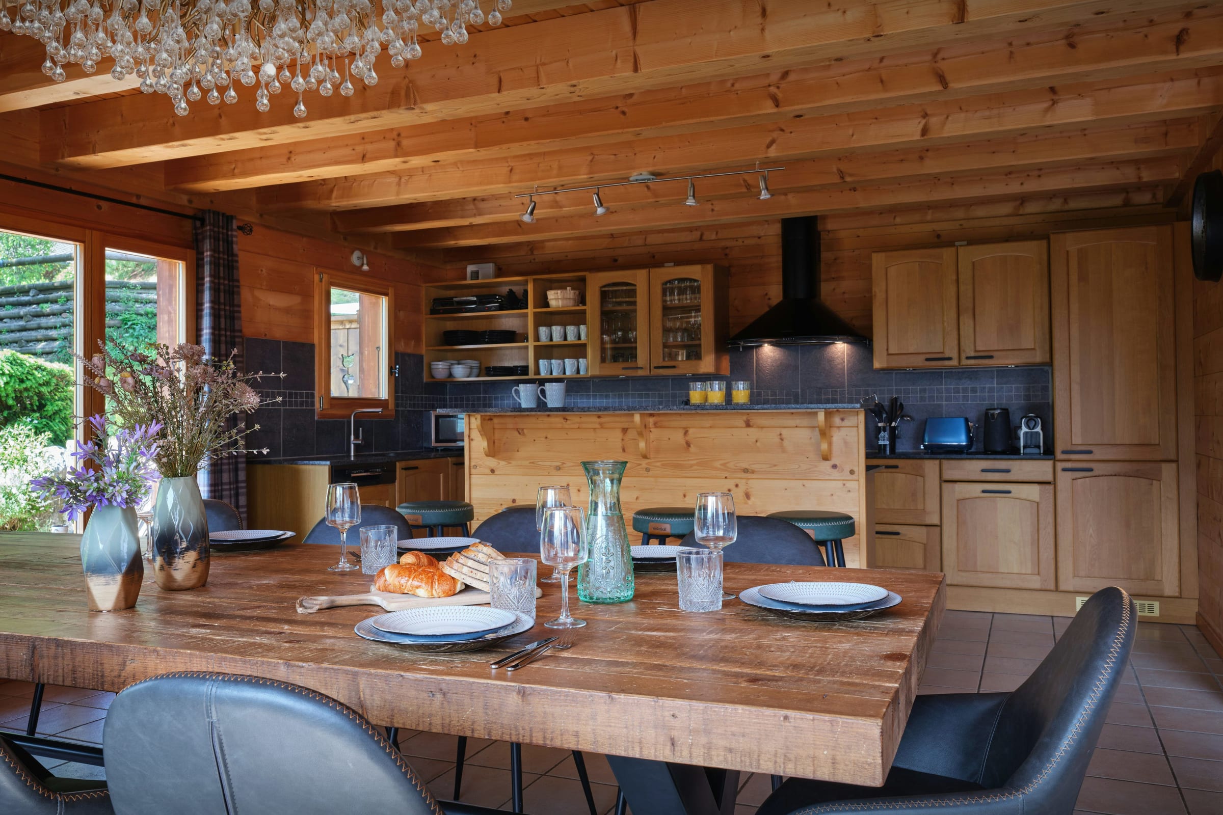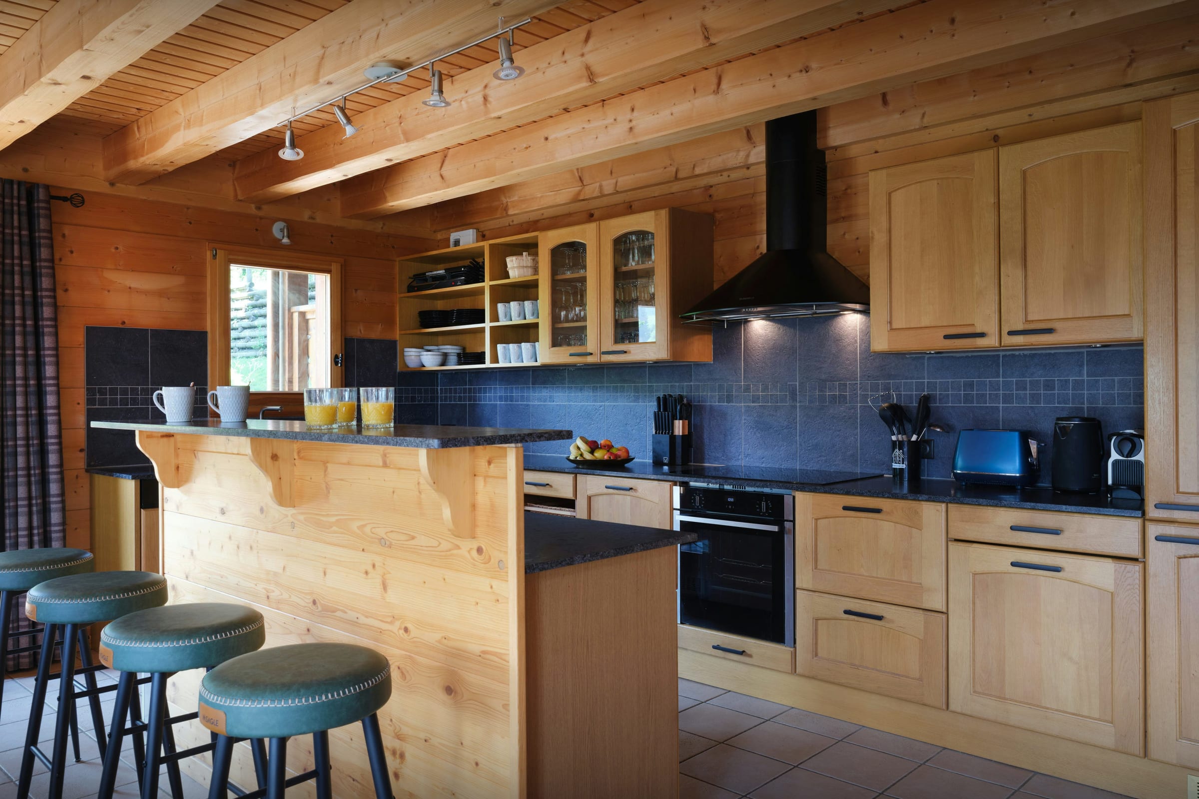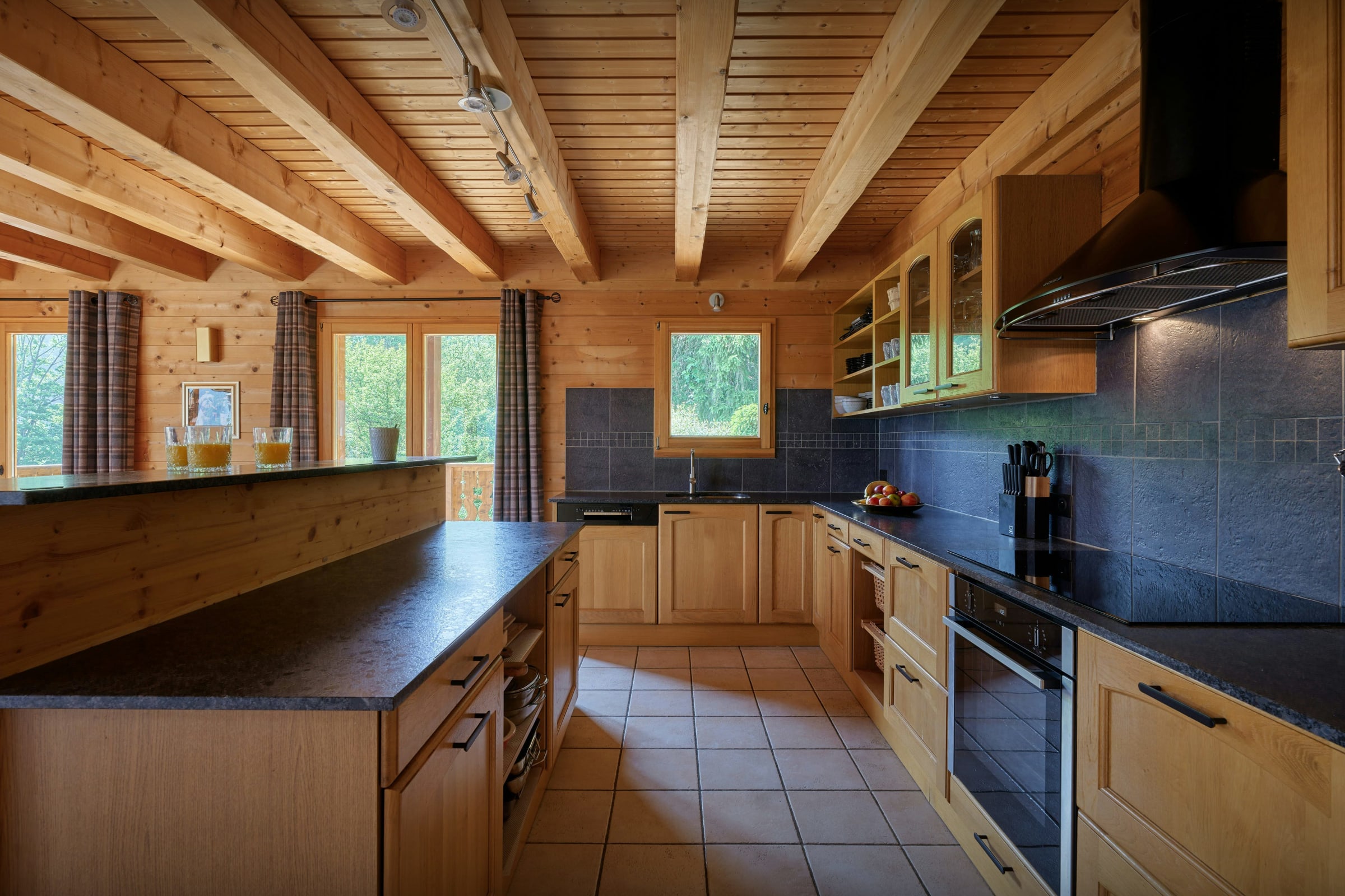 Nous aimons particulièrement les pièces communes du Chalet Isla de Lux : le salon principal très cosy, avec sa télévision et sa cheminée ; la salle de jeux, avec un billard, un canapé et une kitchenette, où les enfants les plus grands pourront se retrouver le soir ; et la mezzanine, qui compte un canapé et un bureau, pour ceux qui voudront travailler à distance. La cuisine est bien équipée et l'îlot central permet de cuisiner à plusieurs.