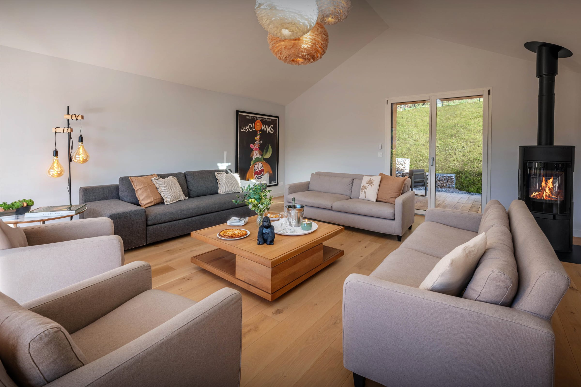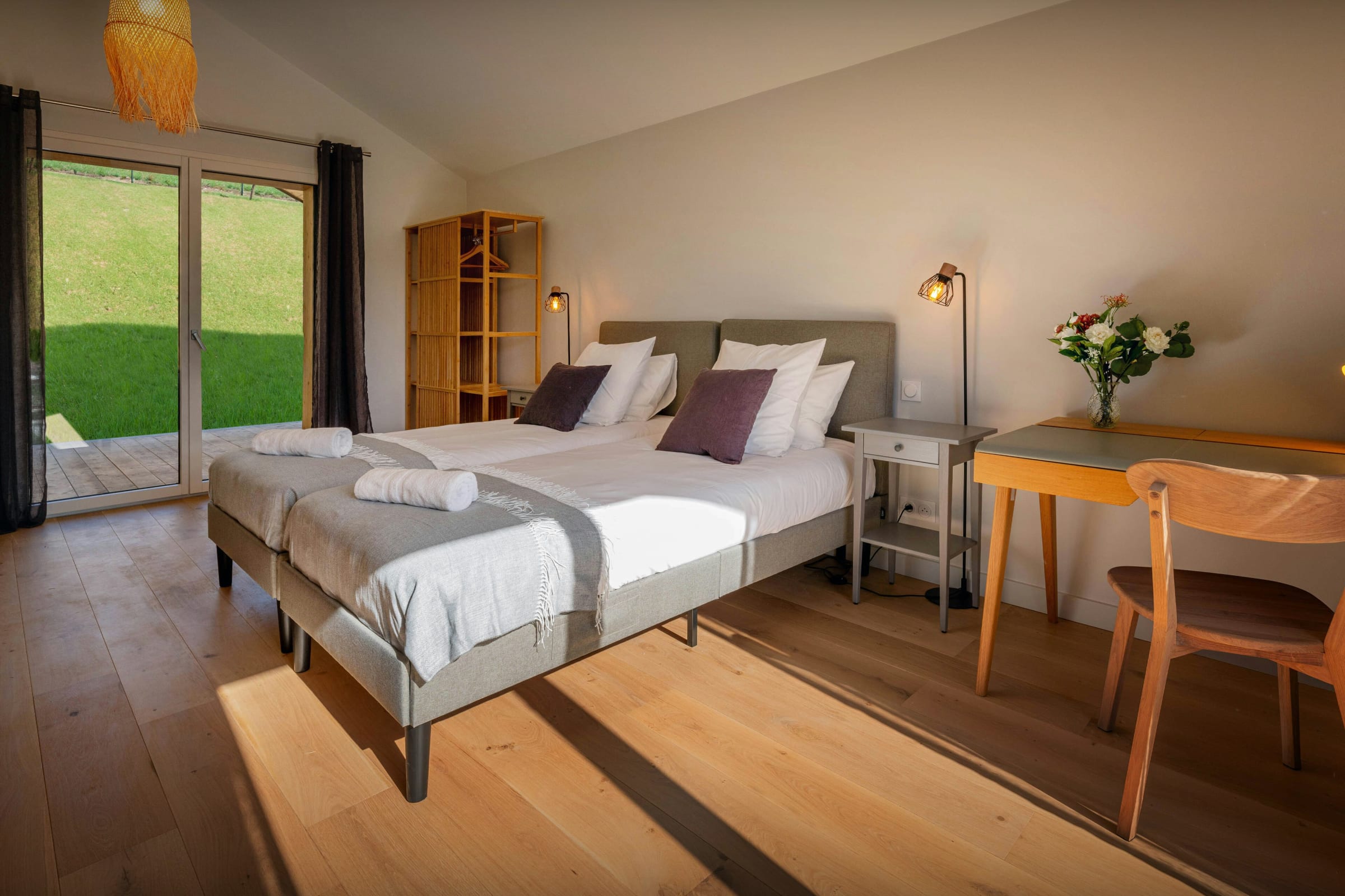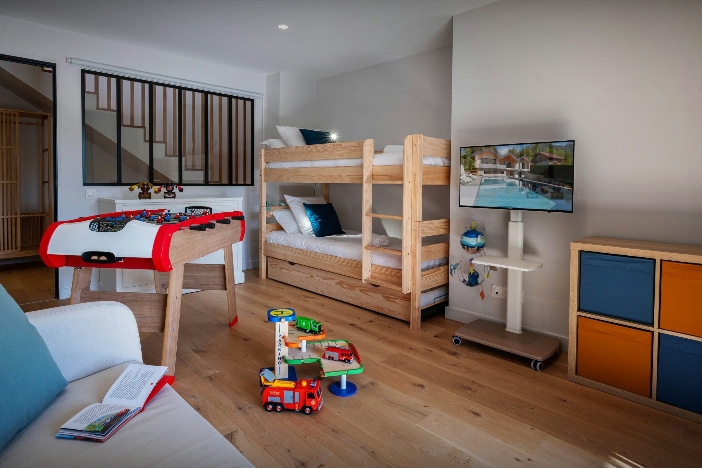 La propriété est à la fois somptueuse et fonctionnelle. Elle compte 3 chambres doubles (dont 2 suites), un remarquable dortoir pour les enfants, avec livres, jeux, télévision et babyfoot, un confortable salon avec poêle à bois, une belle terrasse, et une piscine extérieure.