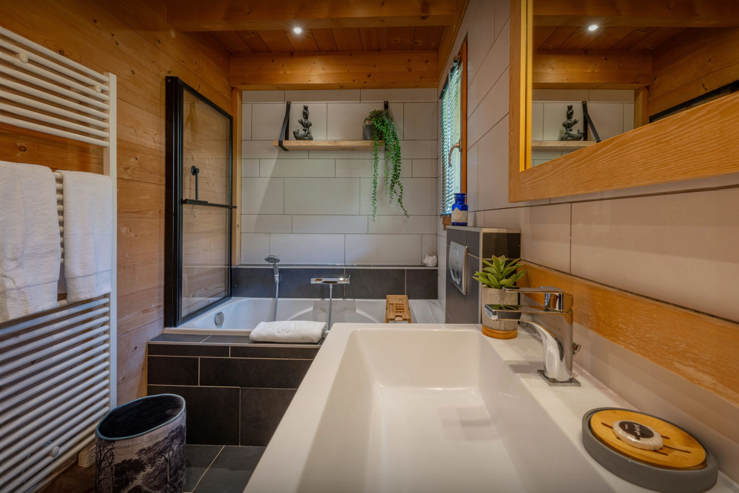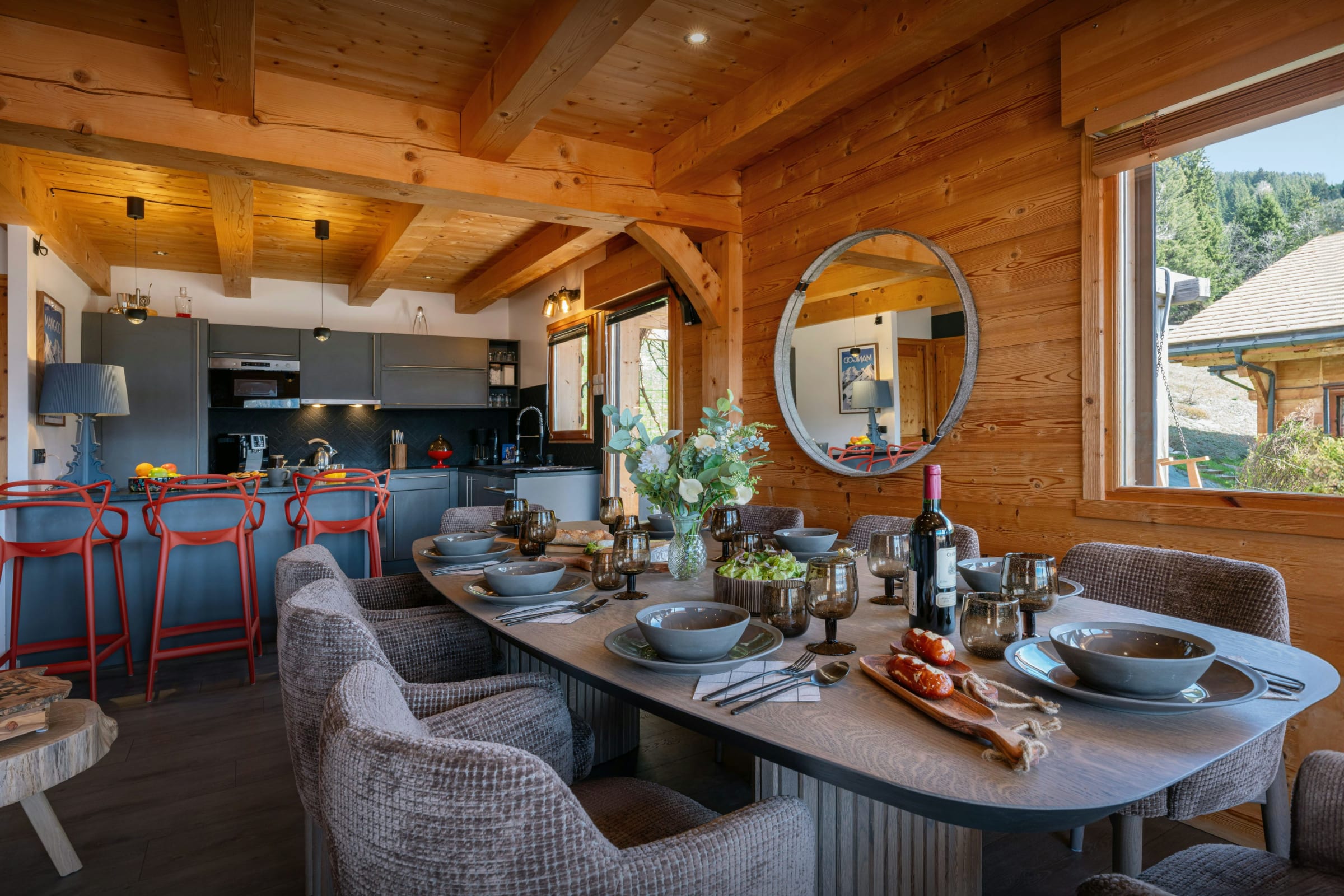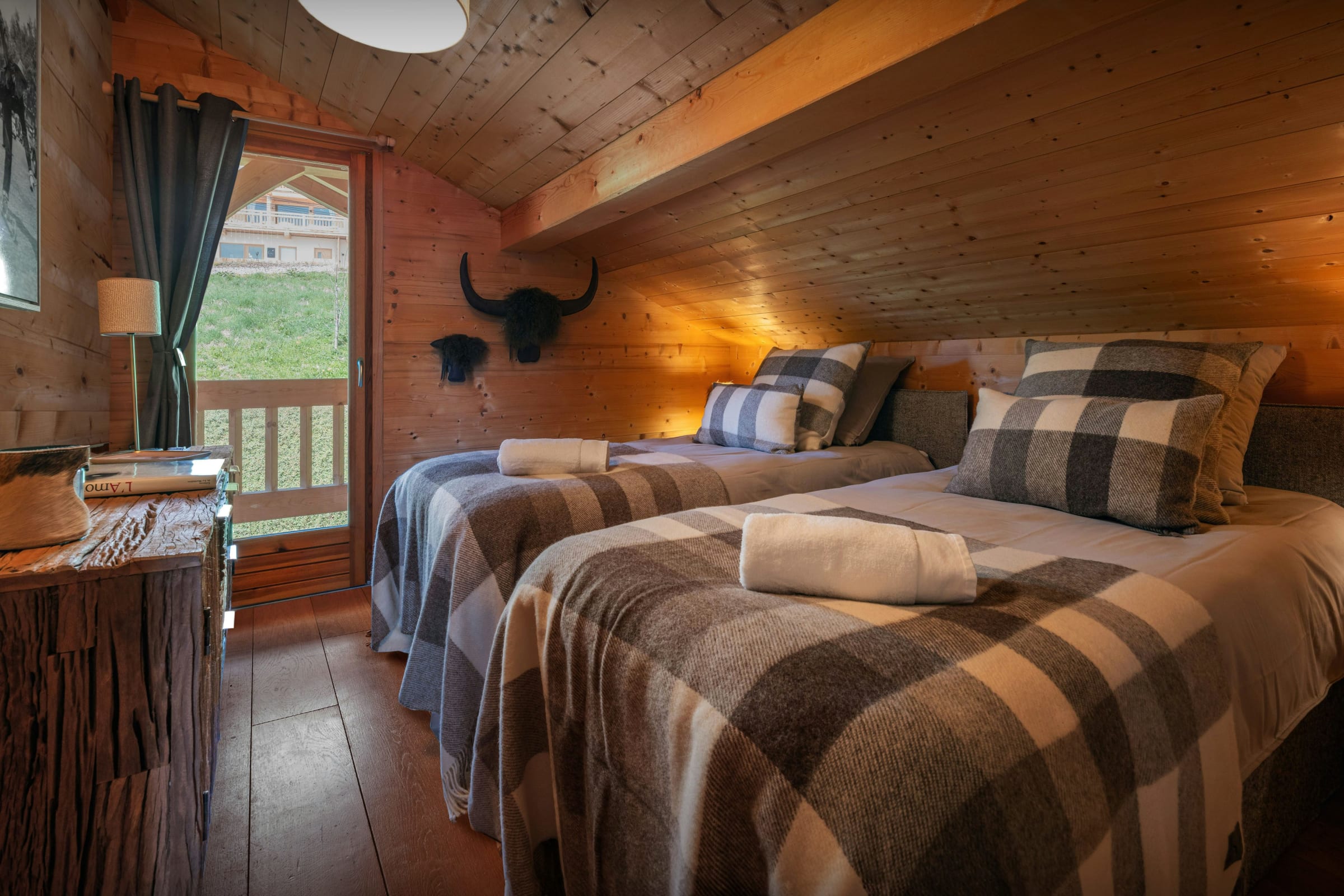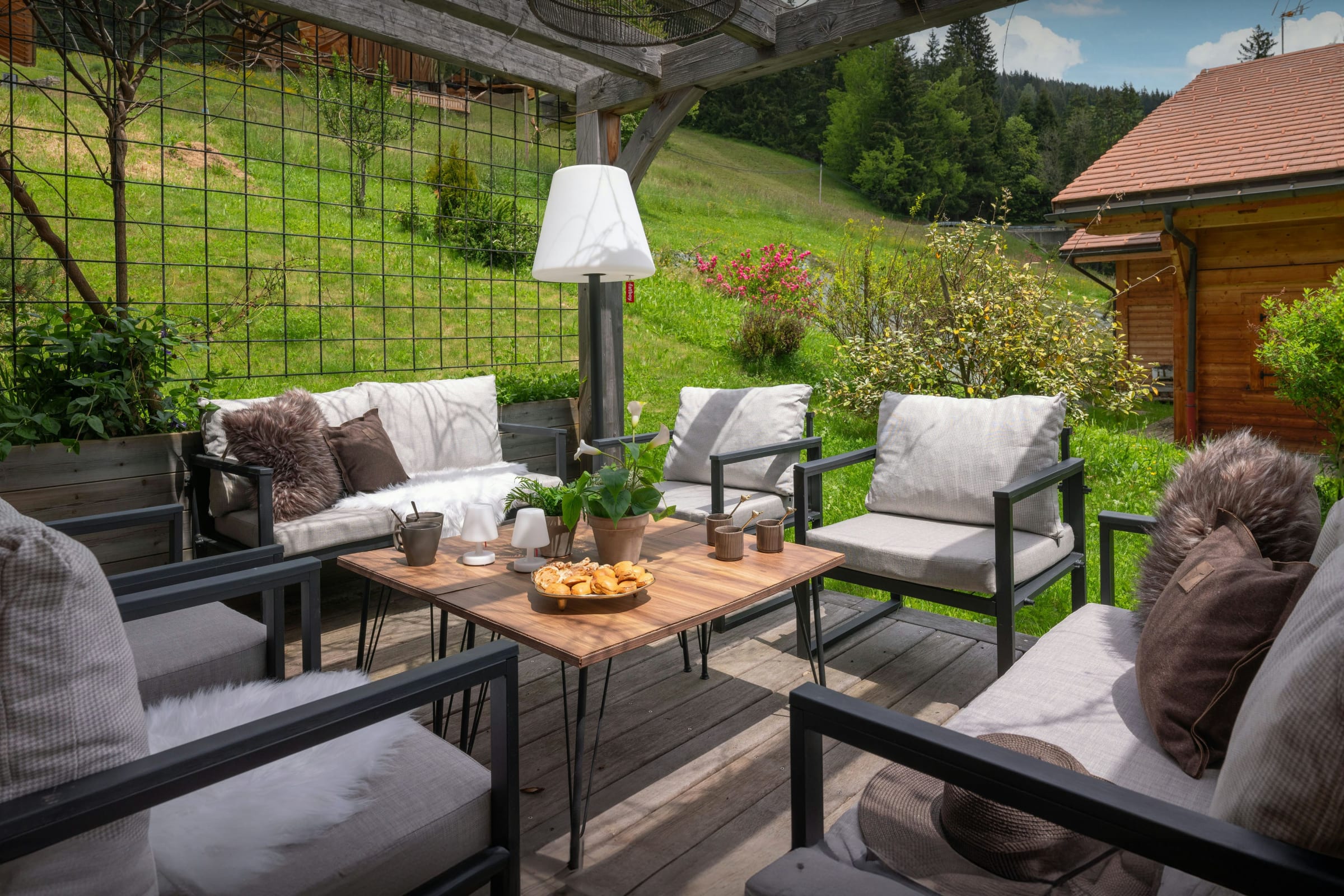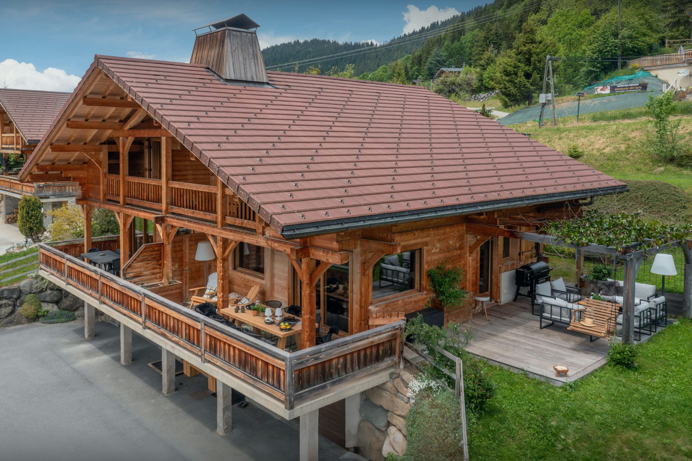 Le chalet compte également deux terrasses aménagées, l’une accessible par le salon et l’autre par la cuisine, ainsi qu’un terrain de pétanque.