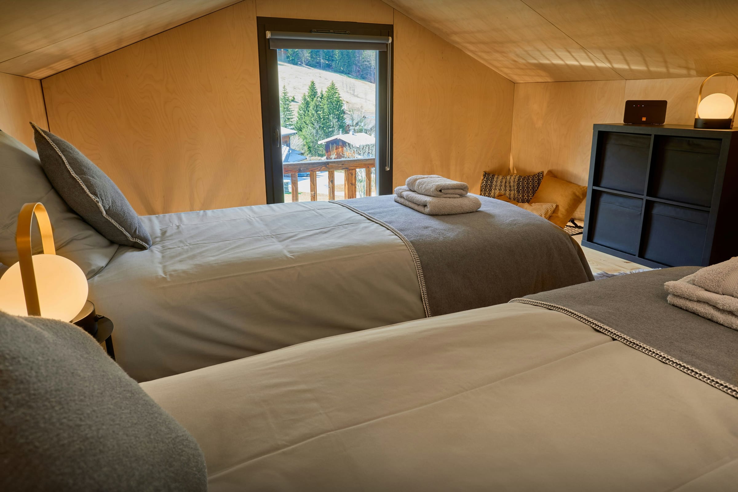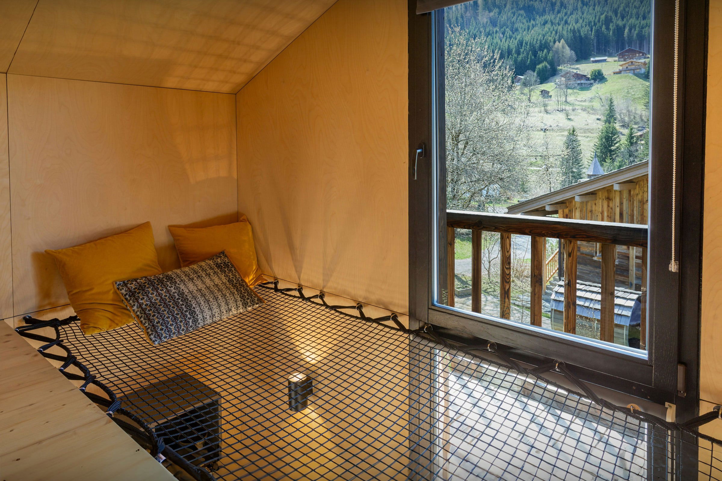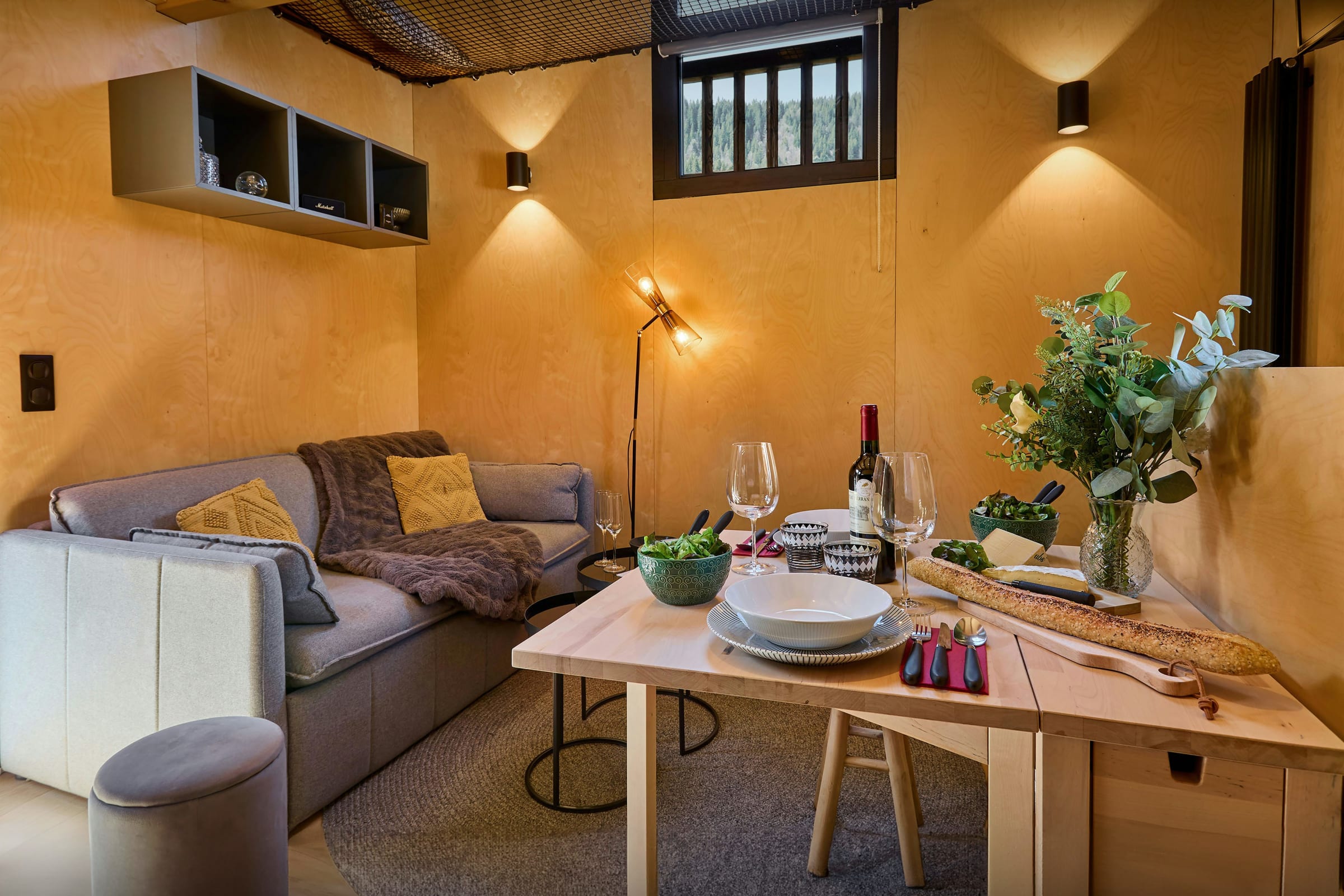Le chalet Sideflip est compact et fonctionnel, offrant à une famille de quatre personnes tous les équipements disponibles dans un grand chalet. Attention, l’accès à la mezzanine par une échelle n’est pas recommandé aux jeunes enfants, mais les adolescents adoreront cet espace, qui est équipé d’un filet permettant d’observer la pièce du dessous.