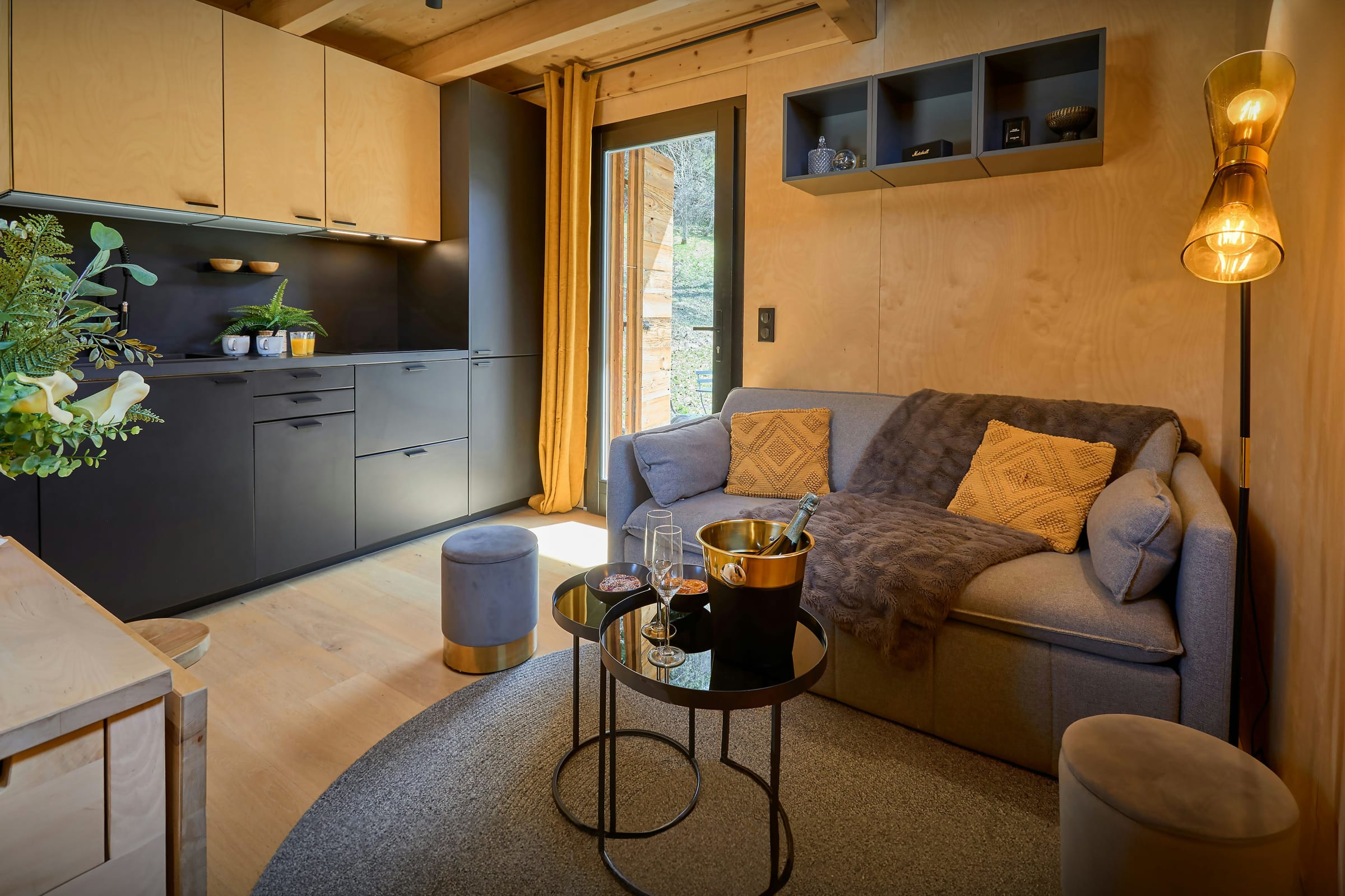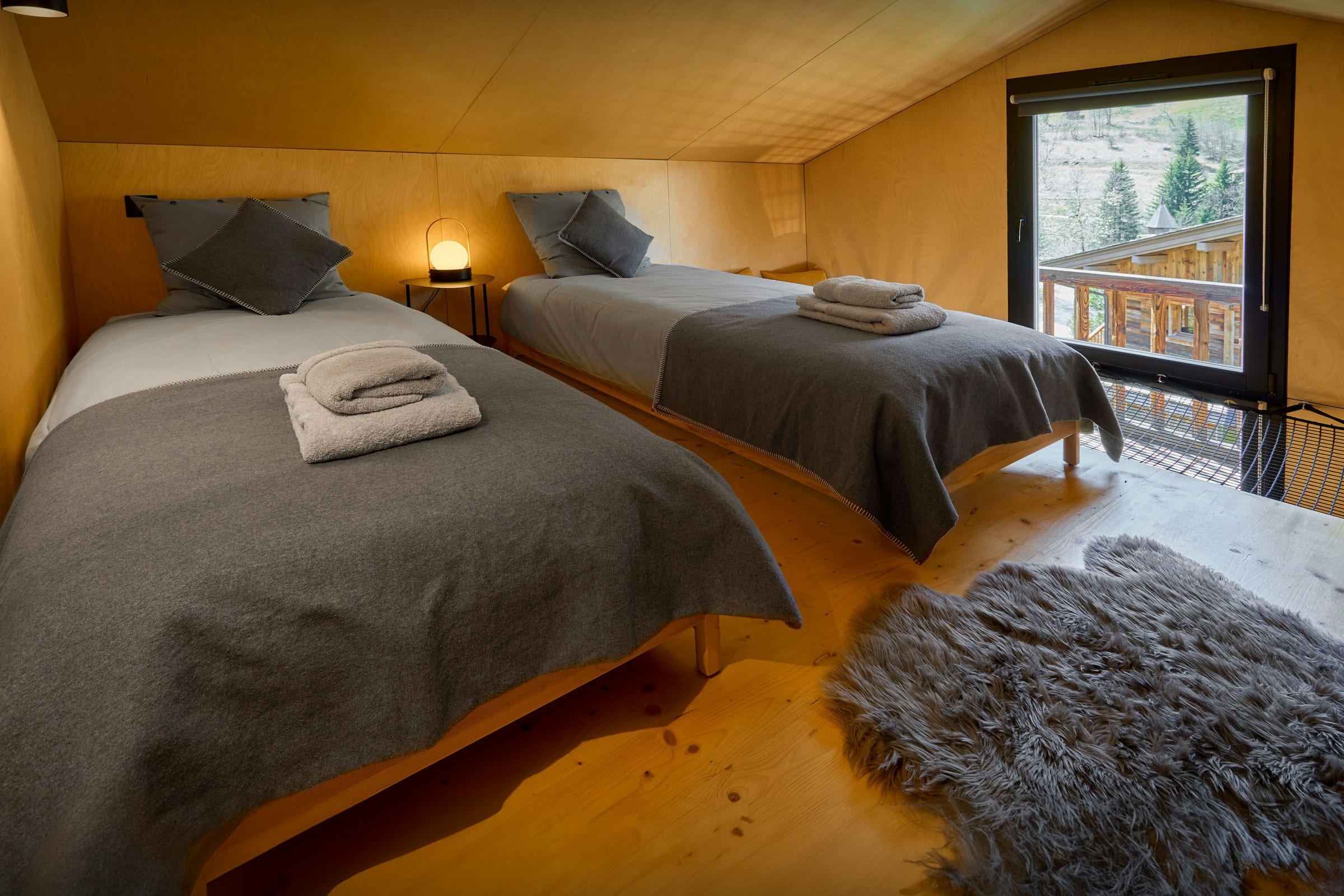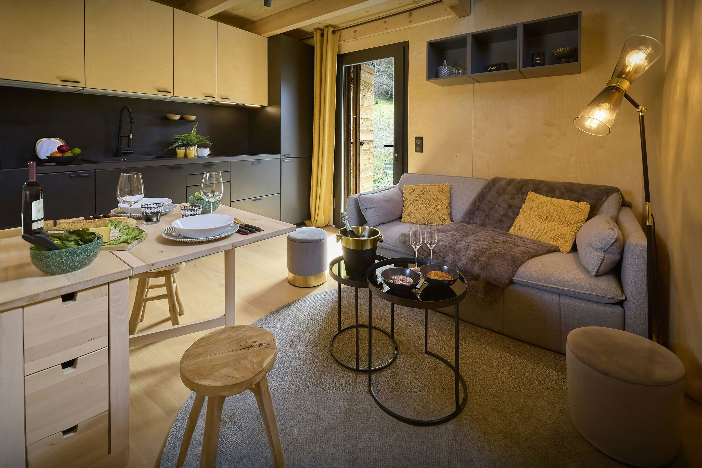 Le chalet Sideflip est compact et fonctionnel, offrant à une famille de quatre personnes tous les équipements disponibles dans un grand chalet. Attention, l’accès à la mezzanine par une échelle n’est pas recommandé aux jeunes enfants, mais les adolescents adoreront cet espace, qui est équipé d’un filet permettant d’observer la pièce du dessous.