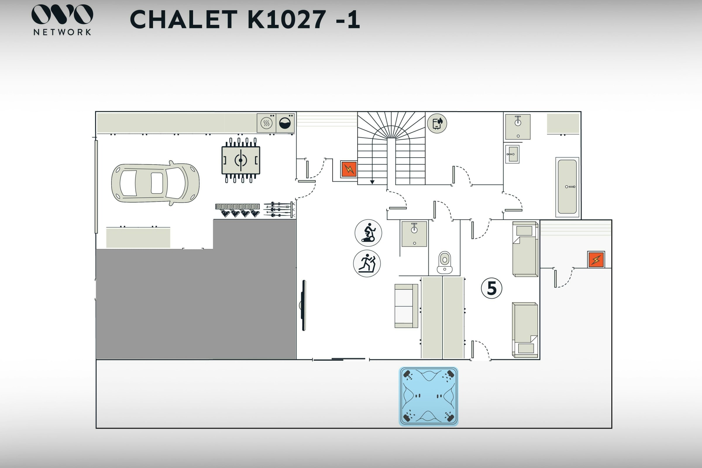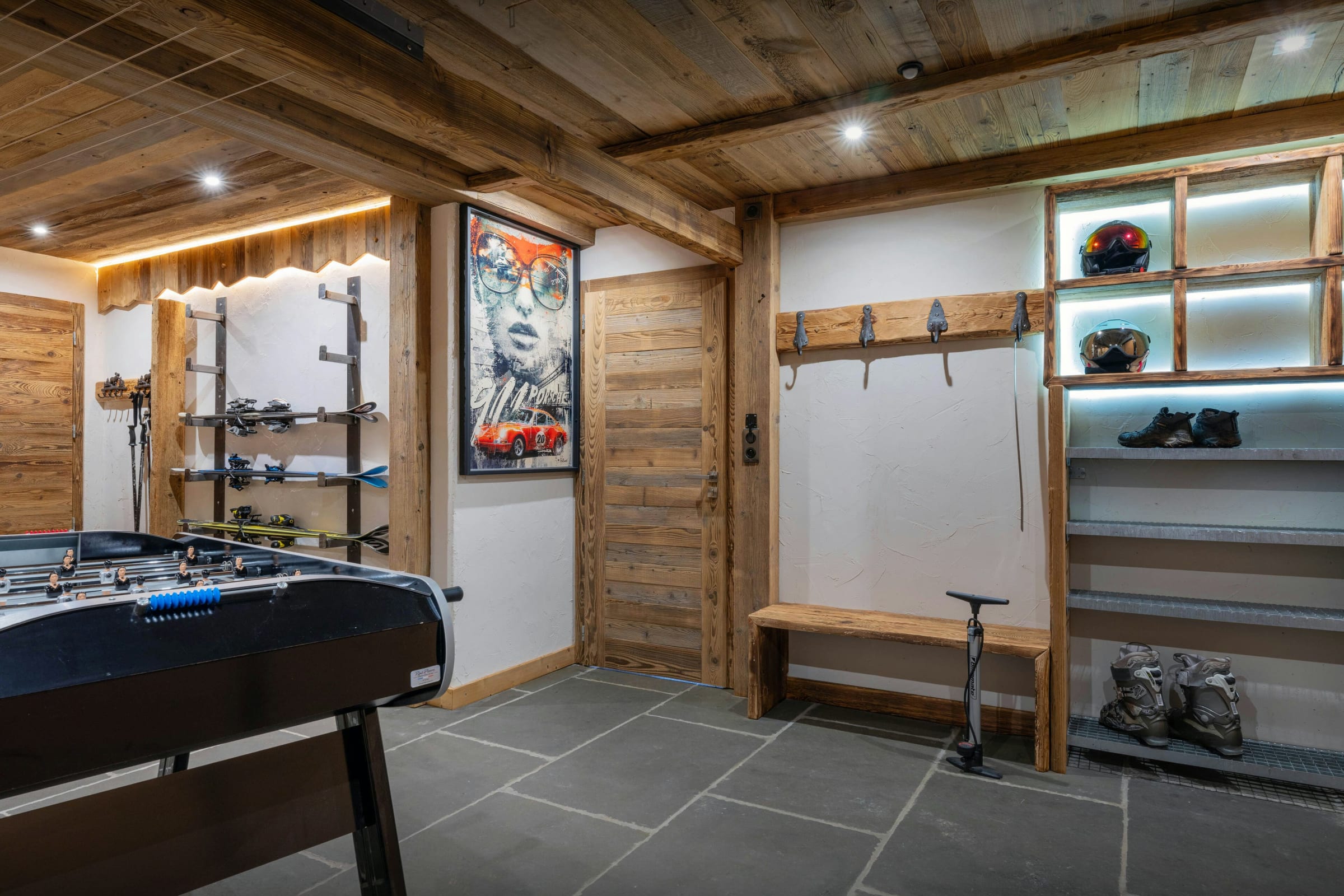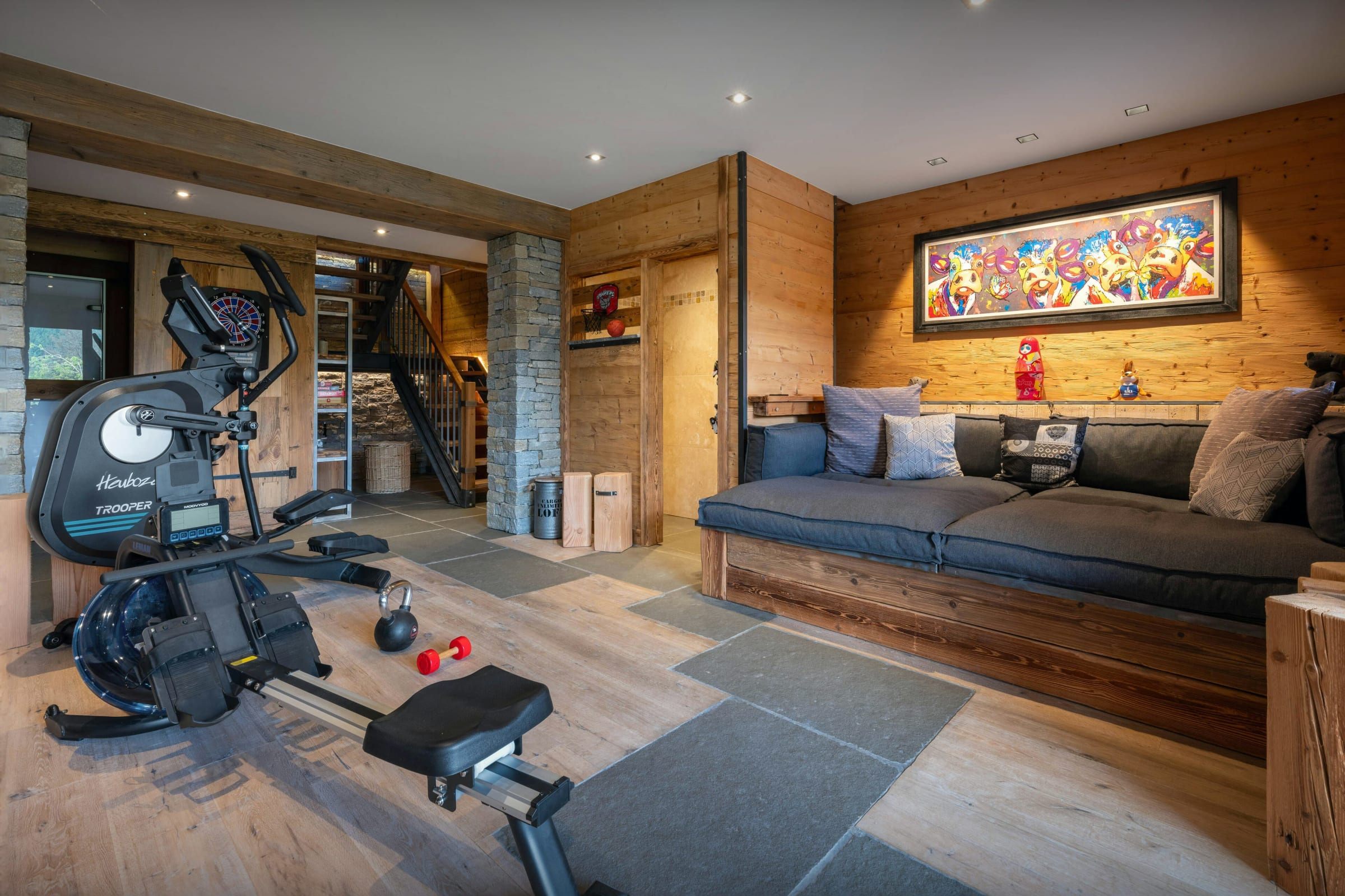 Le rez-de-jardin compte un local à skis, une buanderie et une salle de jeux et de sport. Cette dernière inclut un jeu de fléchettes, un filet de basketball, un tapis roulant et un vélo stationnaire, ainsi qu’une télévision. Les adolescents sont certains d’adorer cet espace, d’autant plus qu’il est complété par un dortoir pour quatre personnes, avec des lits superposés et une salle de bains privative.